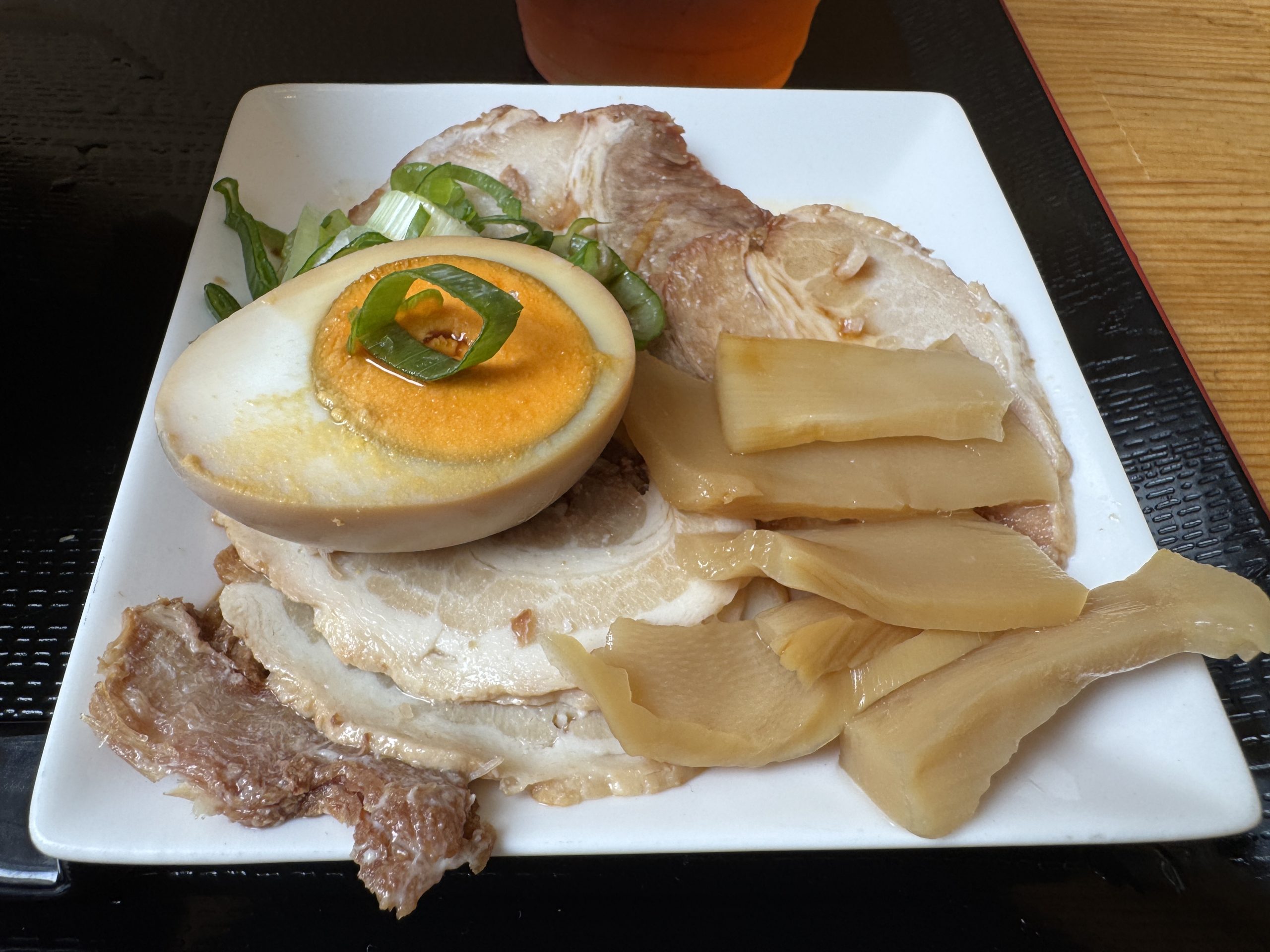 焼豚3点セットは、焼豚、煮卵、メンマのセット。