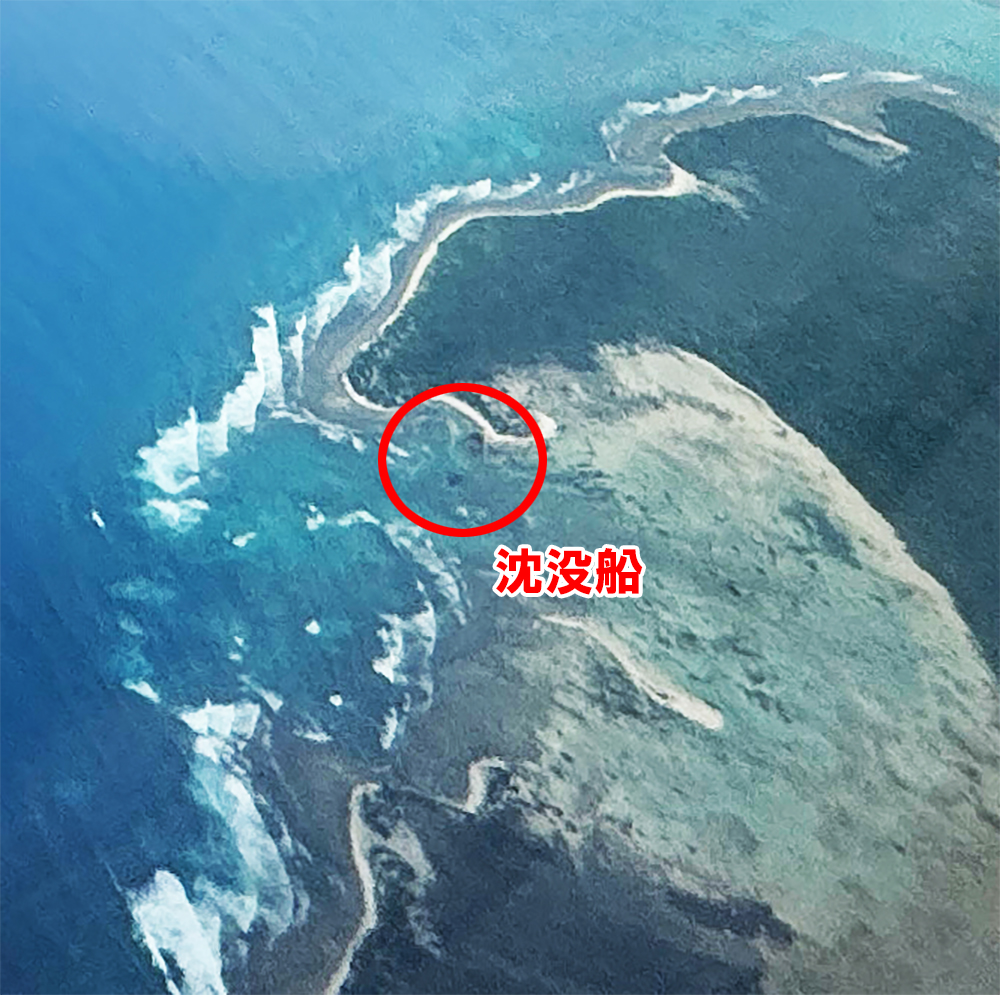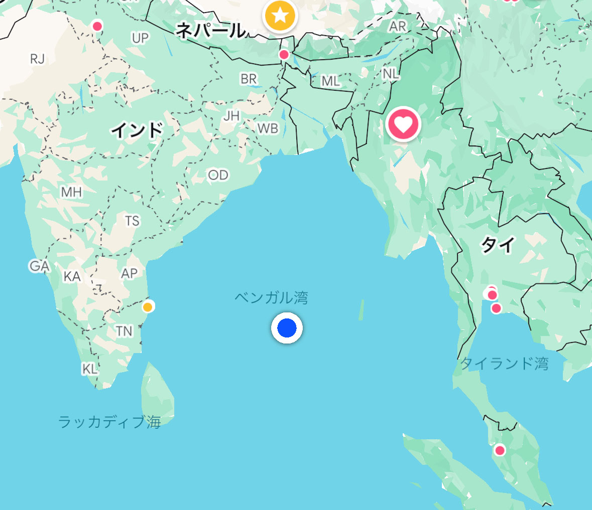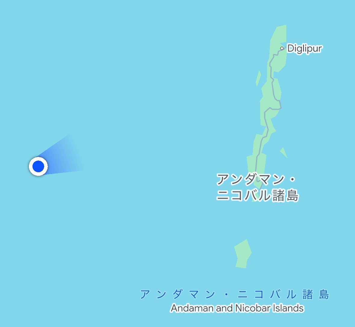 よく見てみると、沿岸部に沈没船が確認できました。Google Mapsでも沈没船を確認することができ、目印として、ここが北センチネル島であることがわかります。