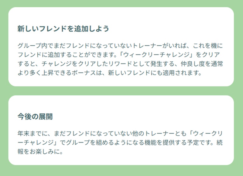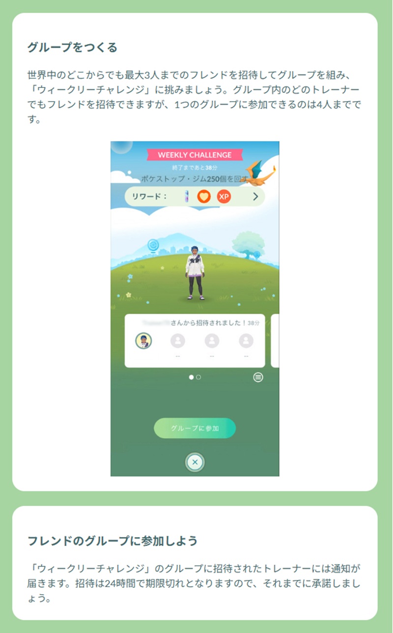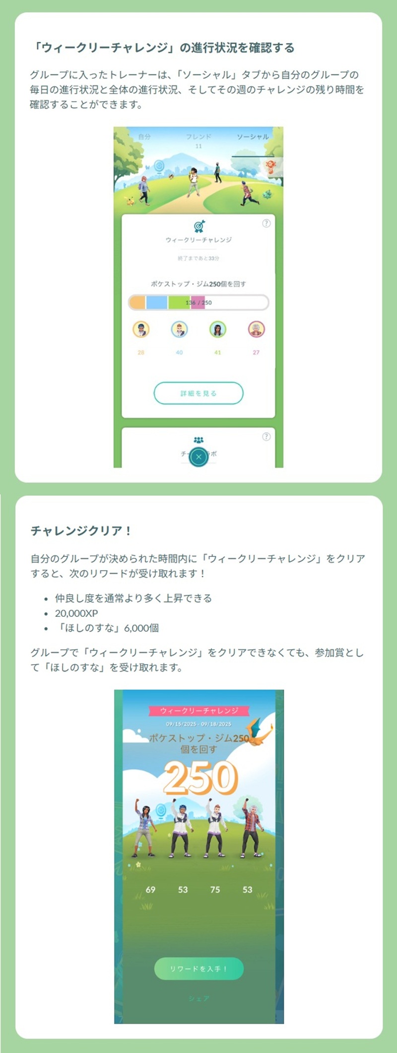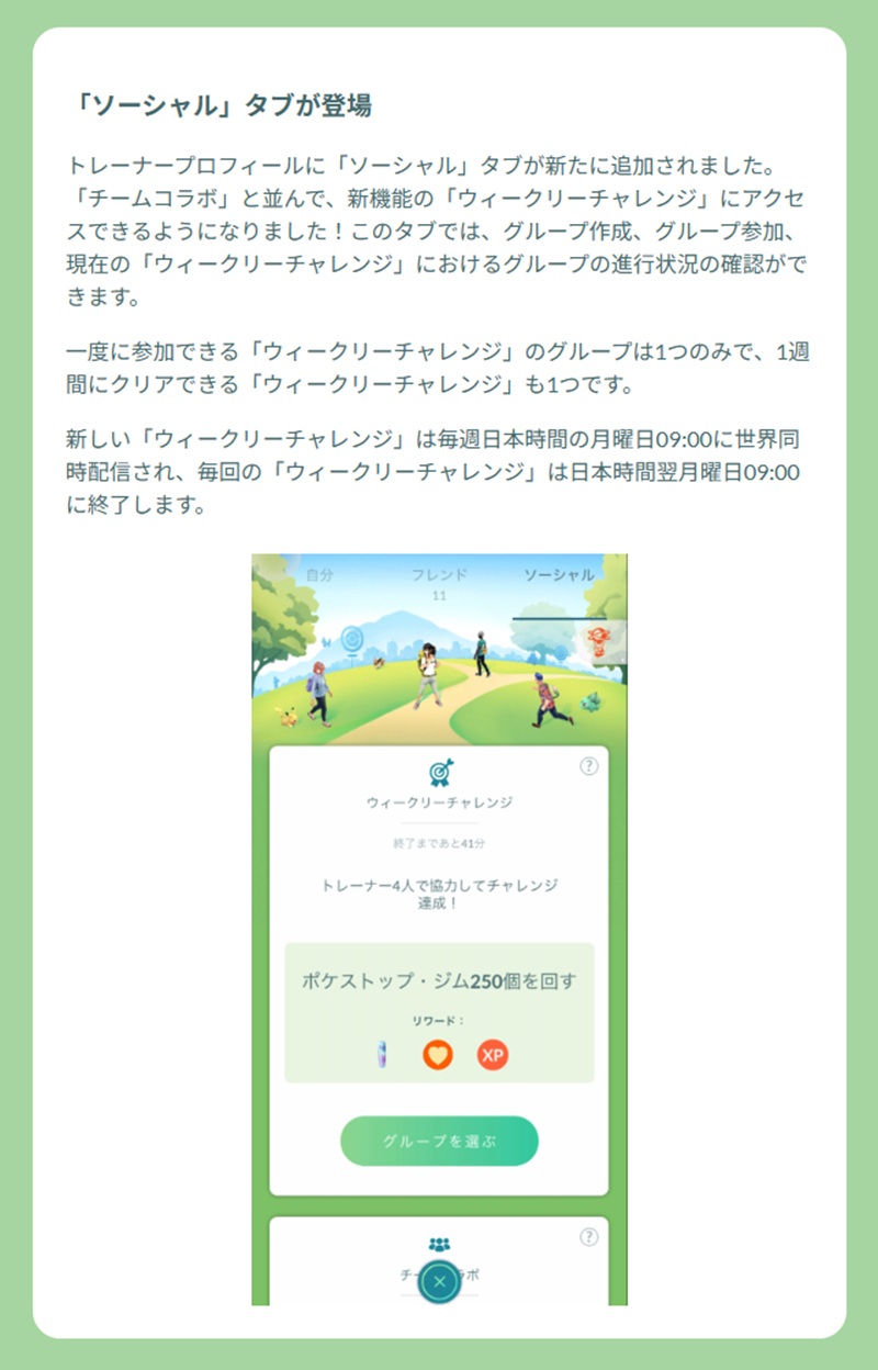 本日公式より発表があった新機能“ウィークリーチャレンジ”は、世界中のトレーナーと最大4人のグループを組んで、さまざまなタスクに挑む文字通り毎週更新のチャレンジ要素。