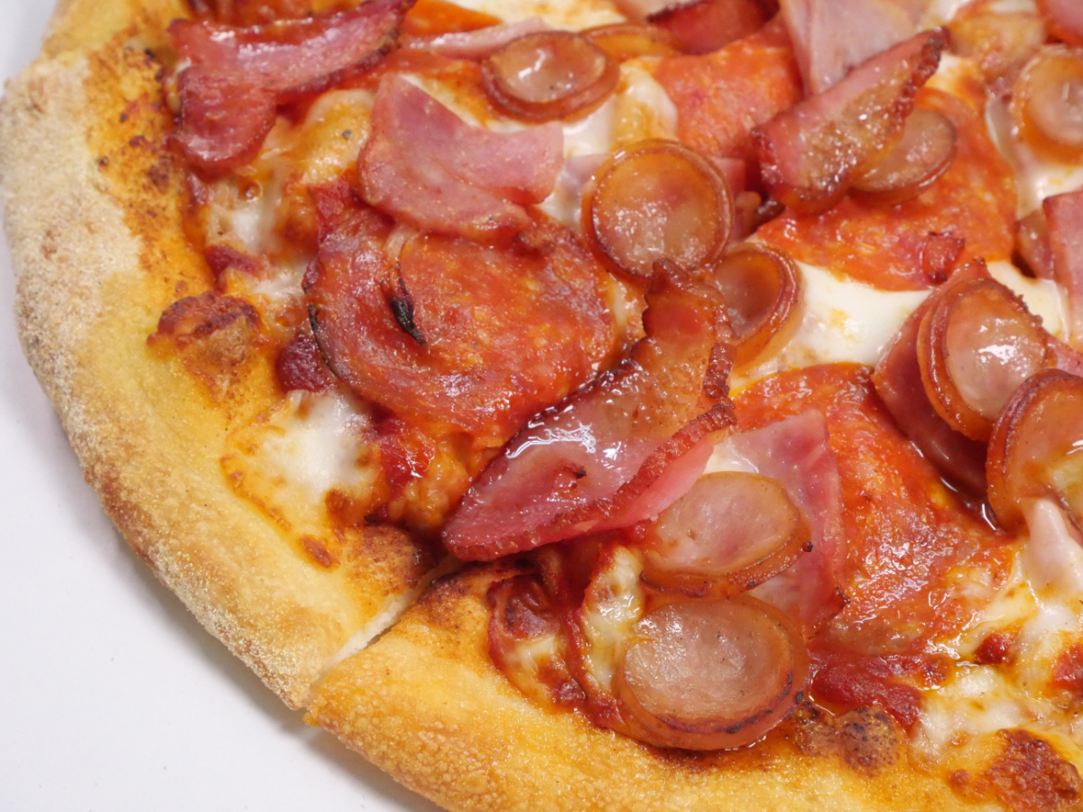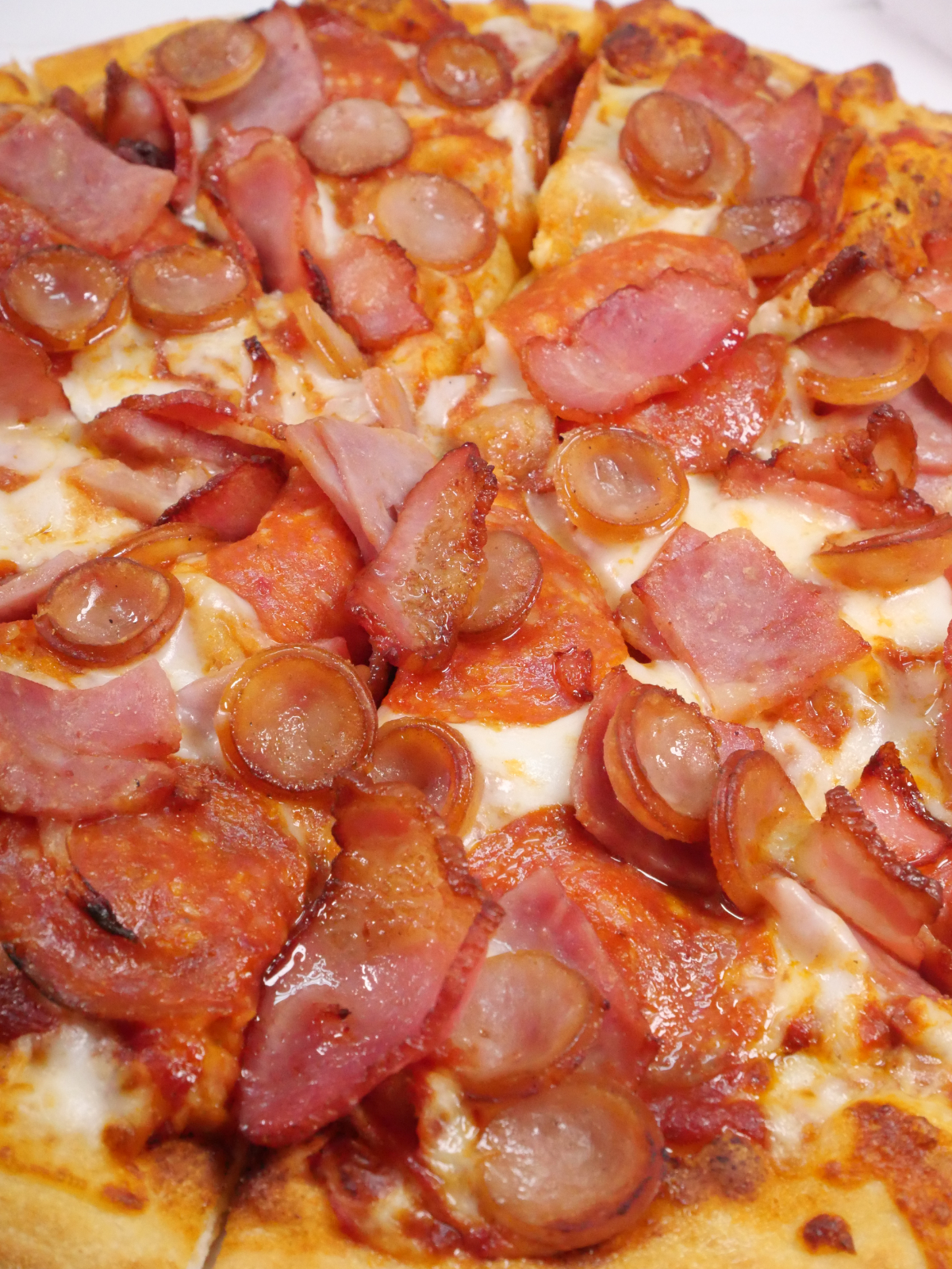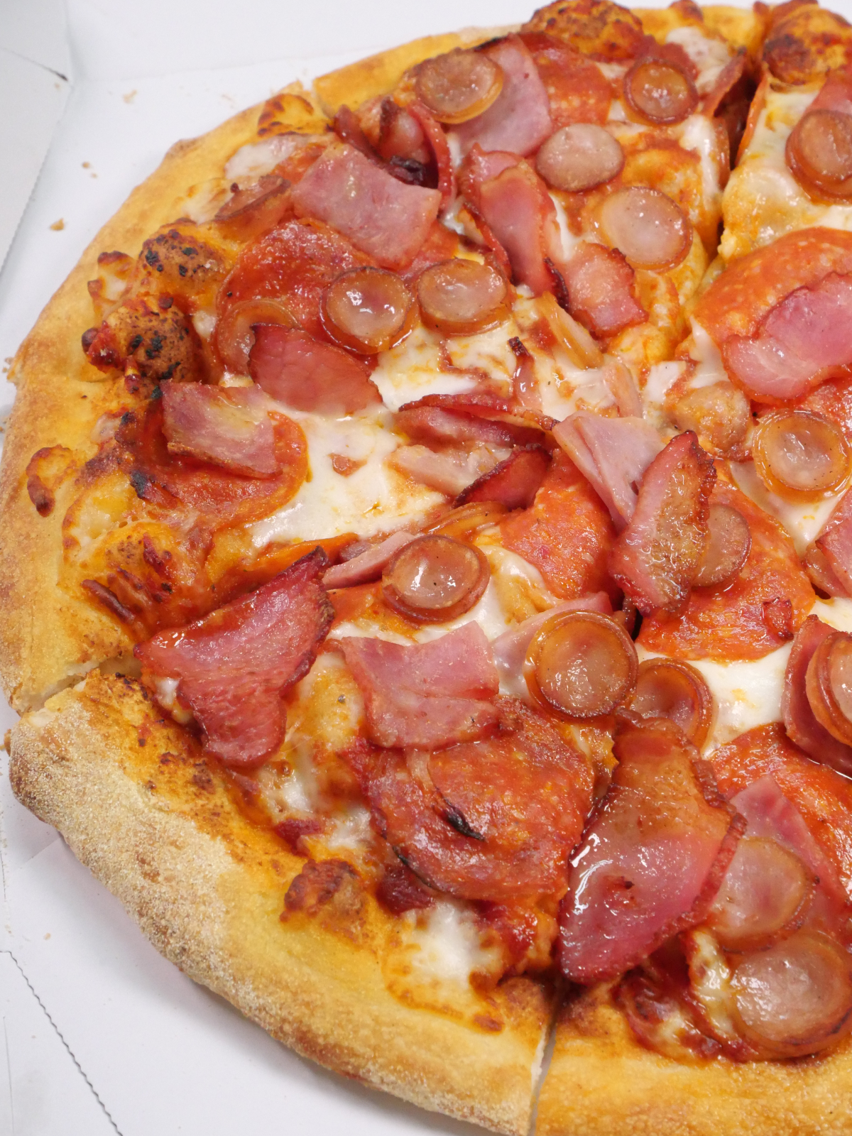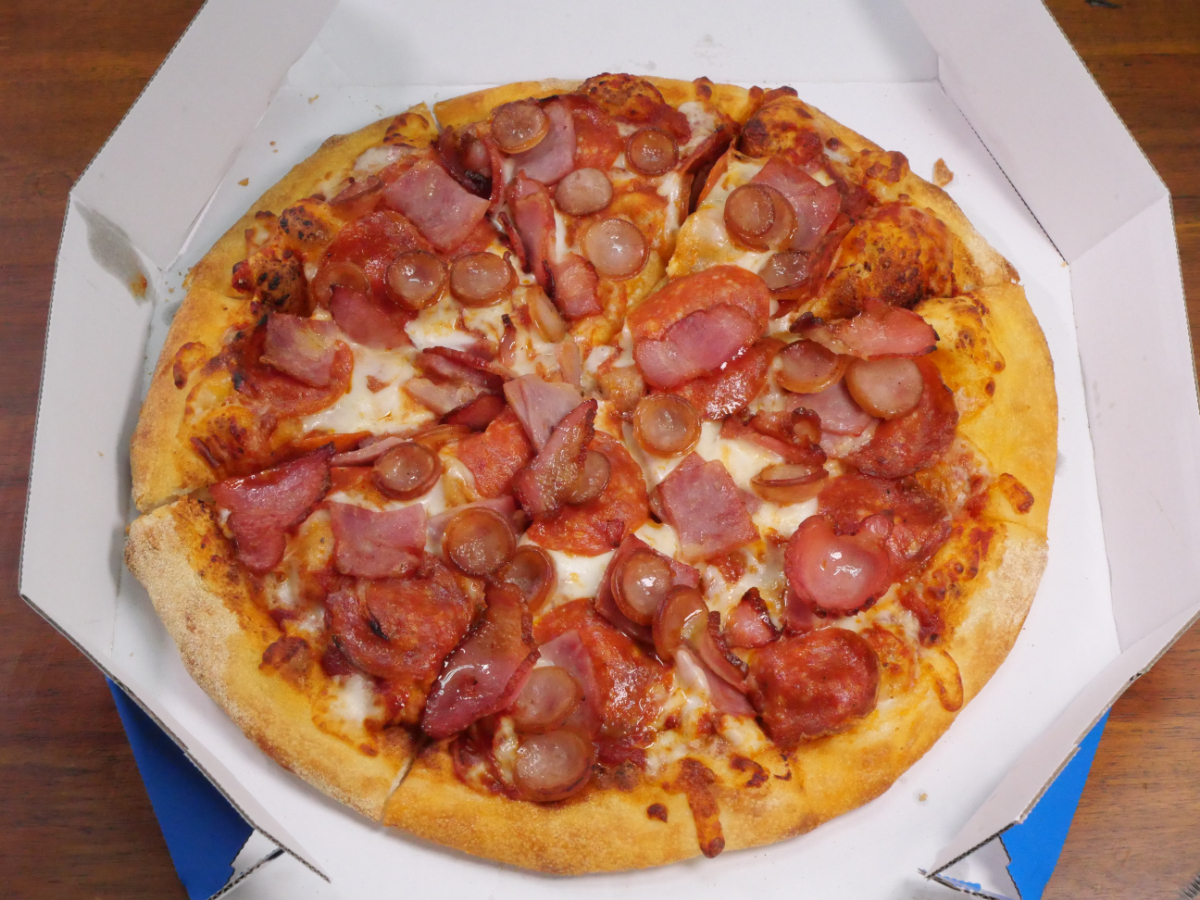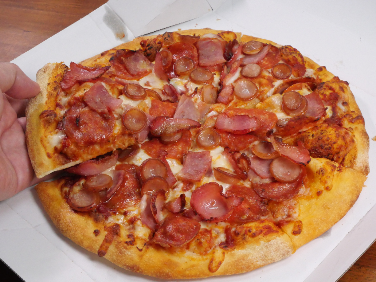 端的にお伝えすると、ドミノピザの「豚肉だらけの豚ピザ」がおいしいのでぜひとも食べてほしい。具を燻しベーコン(豚)+粗挽きソーセージ(豚)+ペパロニ(豚)+ハム(豚)で構成してオーダーするだけで食べられます。豚+豚+豚+豚のピザです。