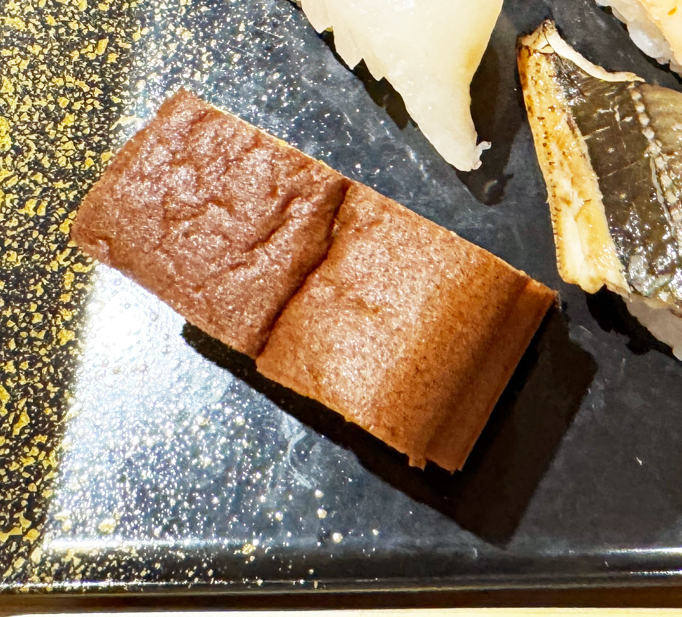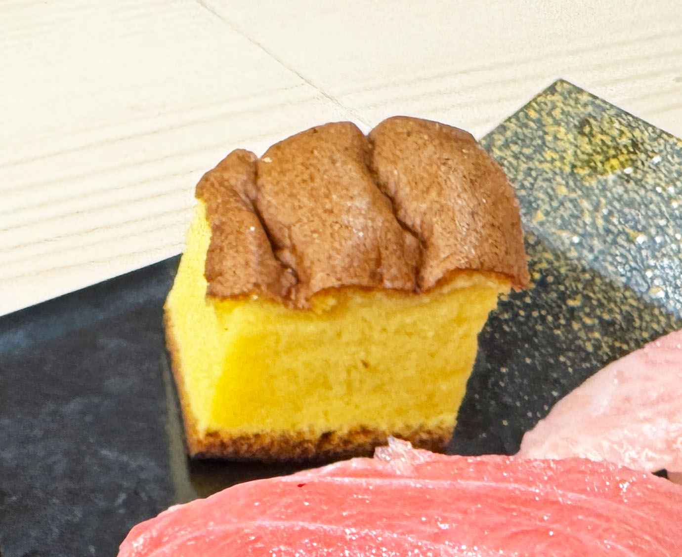この店舗では、握り寿司のセットに「カステラ玉子焼き」という名称の、カステラのように仕上げられた玉子焼きがついてくる。江戸前風に仕上げられた玉子焼きで、おかずとしても成り立つが、どちらかというとスイーツ的な印象をうける。