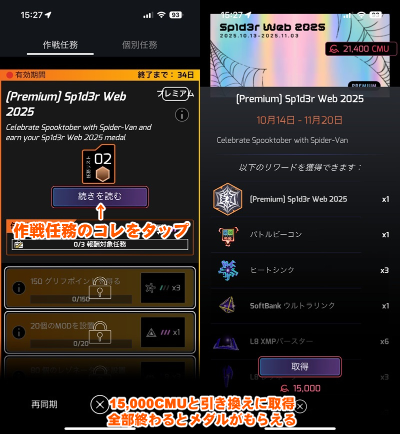 本日(10/14)から作戦任務の最上部に表示されている“Sp1d3r Web 2025”とは、CMUというゲーム内通貨を使って参加できる期間限定の有料イベント。