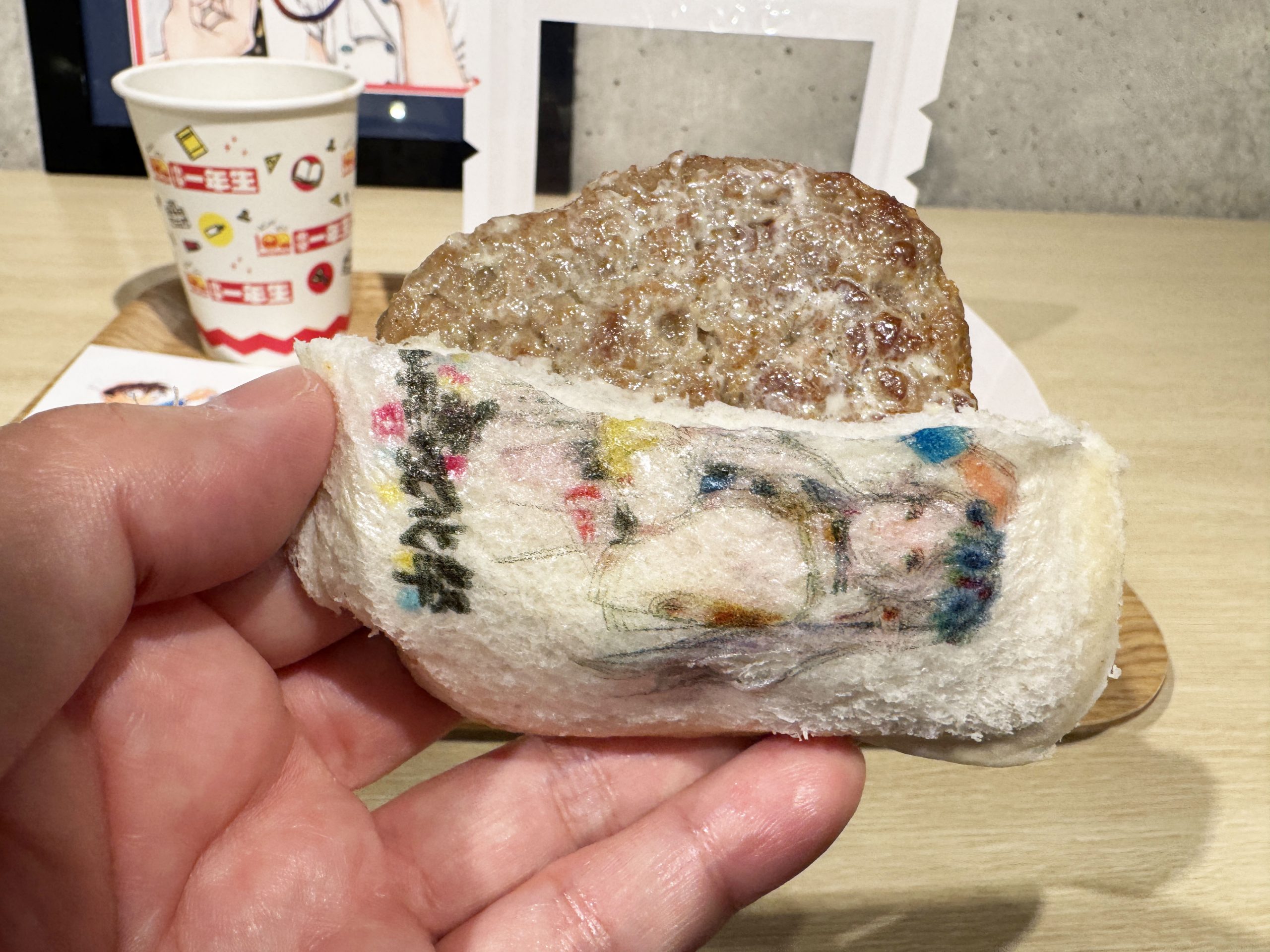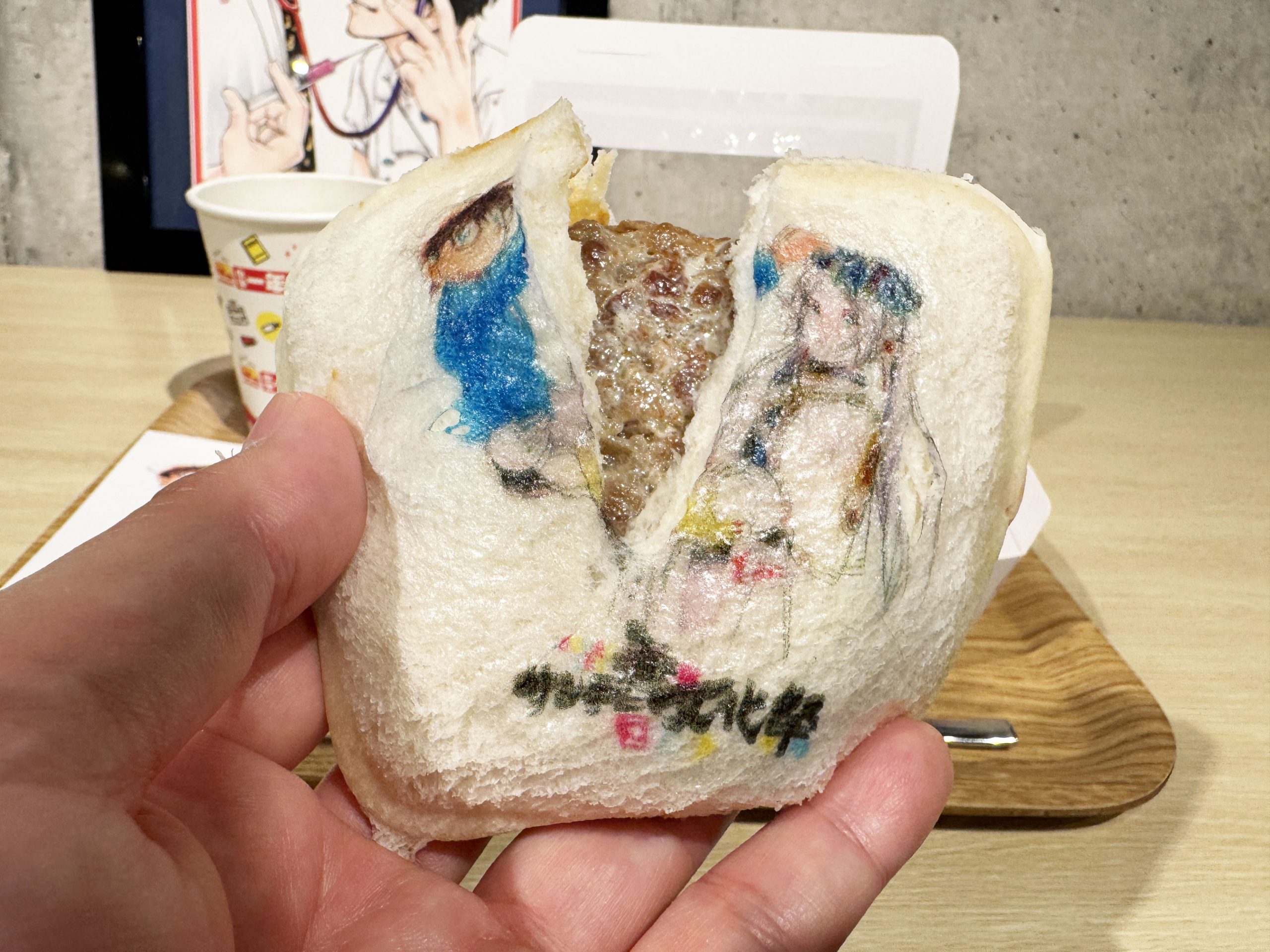パンは、食パンの耳をカットし、重ね合わせてプレスしたもの。しっかりハンバーグが封じられているので、食べたり手でちぎるまでハンバーグを目視で確認できません。パンにはコナンとフリーレンがデザインされていて、まさに食べるコナンとフリーレンといった感じ。
