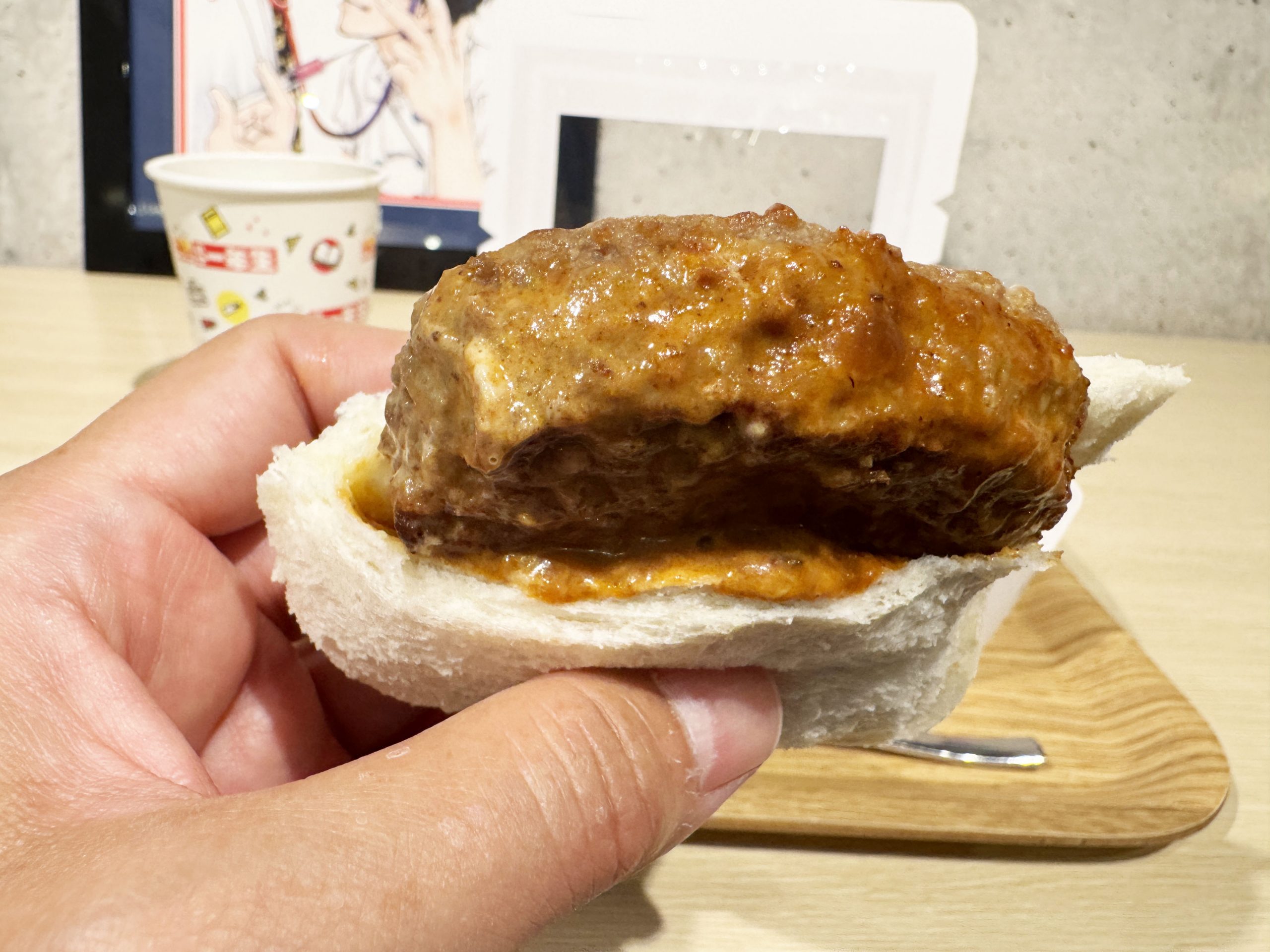 パンを半分に割ってみると、中には、想像以上に極厚のハンバーグが入っていました。ソースもたっぷりで、かなりジューシー。こんなにもジューシーなハンバーグを封じれるなんて、最近のグルメはスゴイですね。