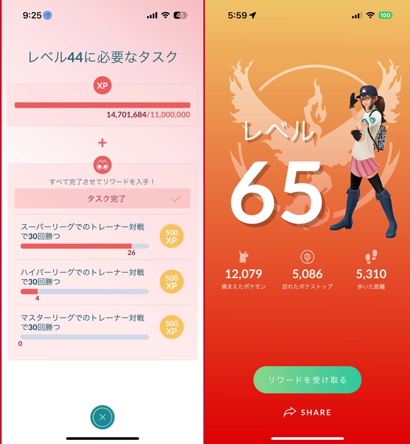 ▲いわゆるトレーナーバトルが大の苦手な筆者は長らくレベル43のまま。溜め込んでいた経験値のおかげもあってそれがいっきにレベル65に。