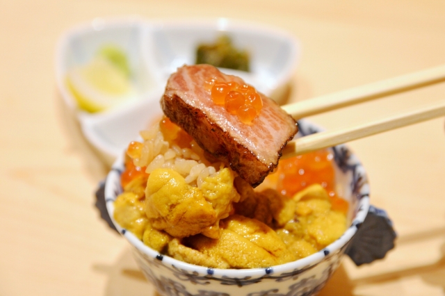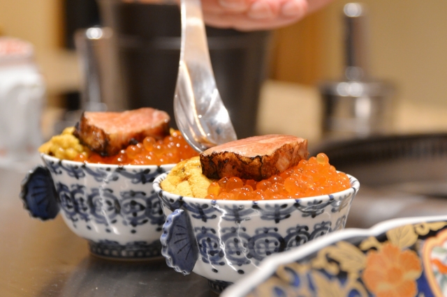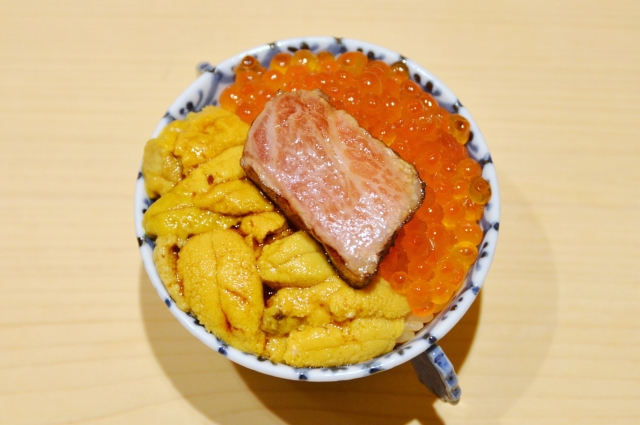 今回味わったのは、名物の『三色丼コース』。ひとり1万8000円(昼は若干内容が変わり1万5000円)と、なかなか高嶺の花ですが、ここは日本で最も地価が高いともいわれる銀座四丁目。それに銀座で鮨、もしくは高級焼肉ですから会食としては相応、むしろ安いといえるかもしれません。