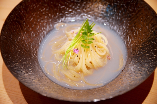 この日の『三色丼コース』は、ほかにも渡り蟹を使った『季節のおひたし』、ウニとイクラが彩る『オクラと豆乳のすりながし』、鮨店ならではのアプローチが斬新な『濃厚ハマグリ出汁の冷麺』にデザートと、量も味わいも大満足の内容。