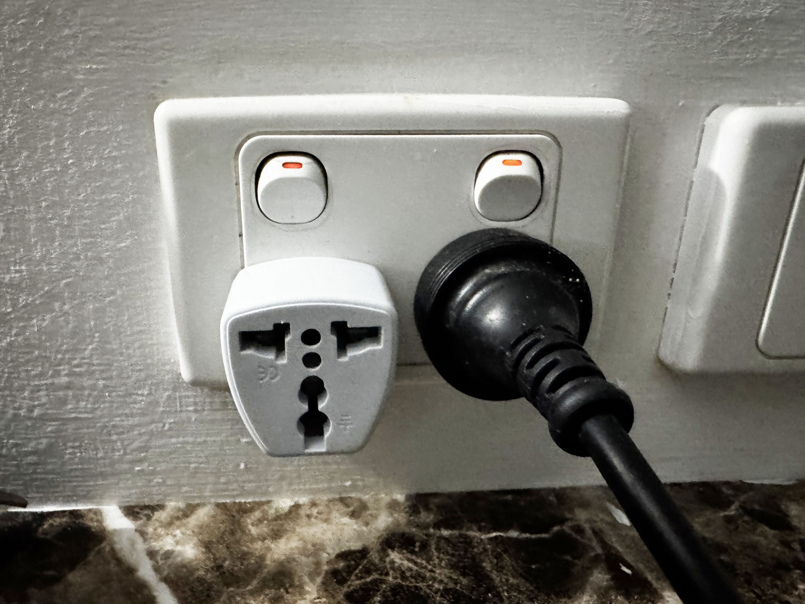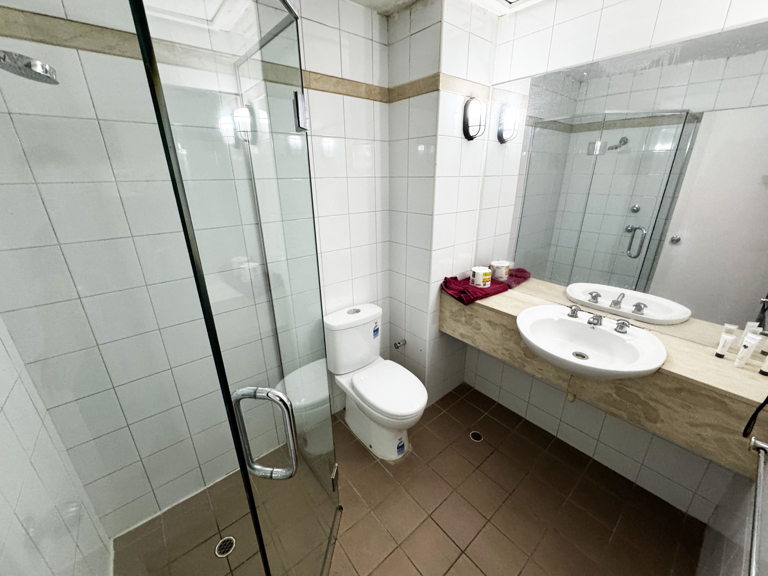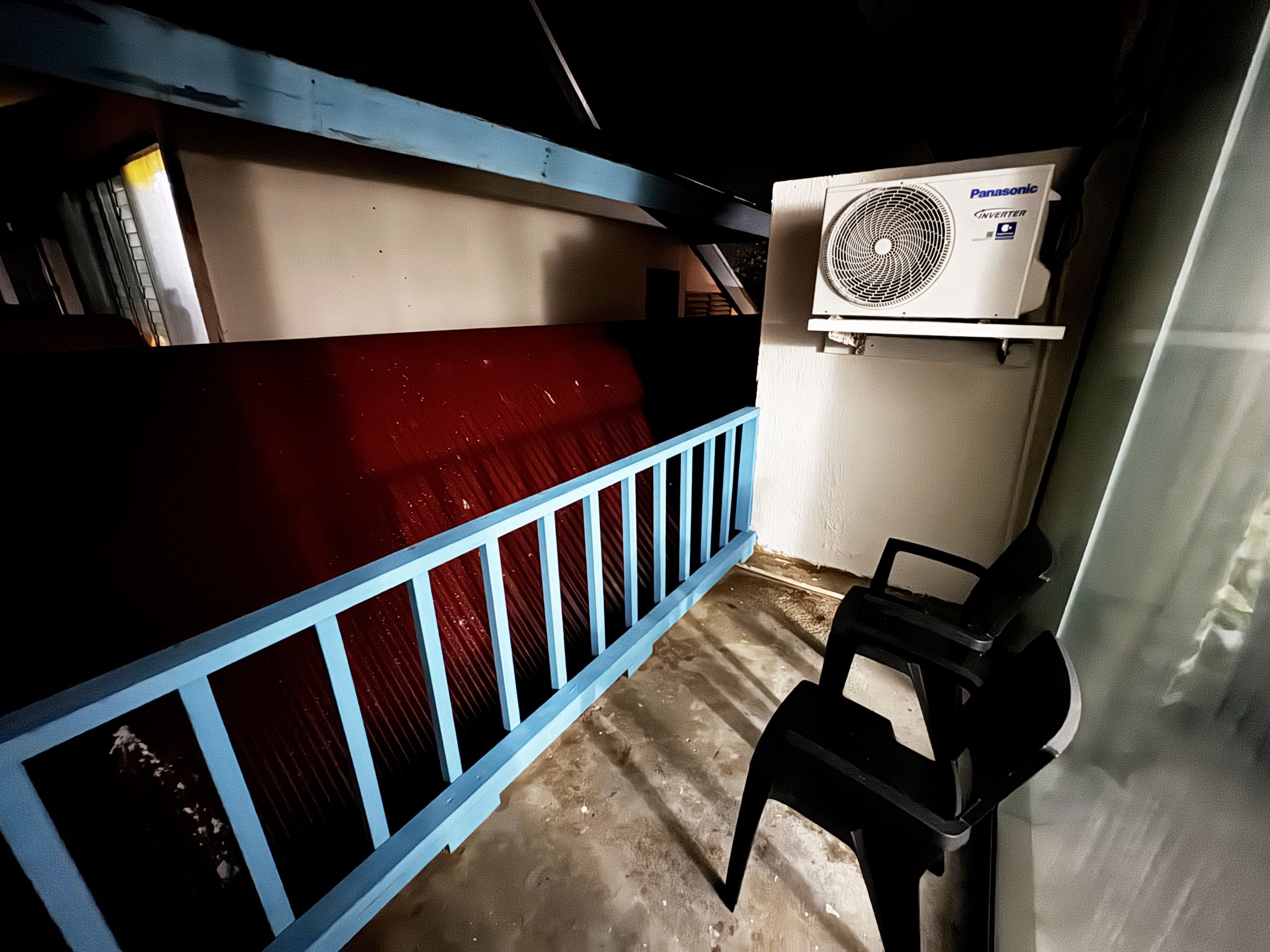 部屋にはベランダがあって、椅子がふたつ用意されていました。景観は、目の前が屋根。しかし、遠くに海が、少しだけ見えました。ほんのわずかですが。景観に関しては、シービューの部屋が満室で予約できなかったので、仕方ないですね。