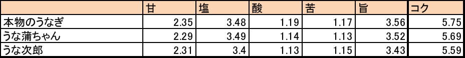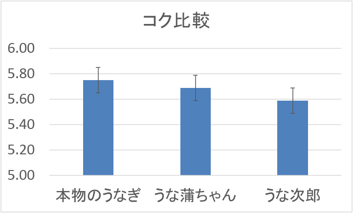 それぞれを数値で細かく見てみると、本物のうなぎが全体的に数値が大きくなっていました。また、特に「コク」の数値の差が開いています。