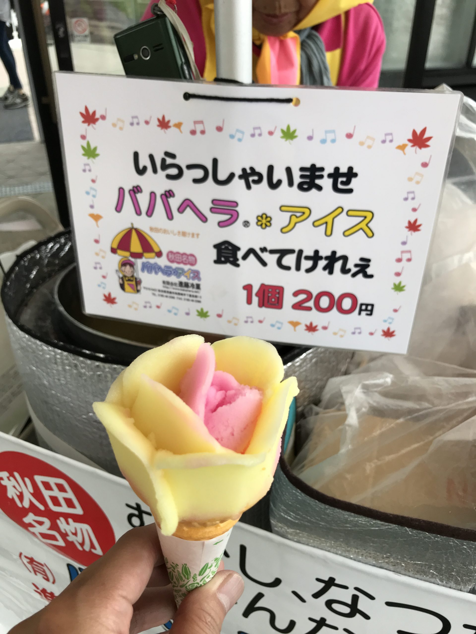 秋田名物のババヘラアイスもステキですよ。日光から身を守る完全防備のオバチャンが、寸胴に入ったキンキンに冷えたアイスをコーンに盛ってくれるアイスです。昭和時代から存在している、ある意味、世界遺産になっても良い存在です。