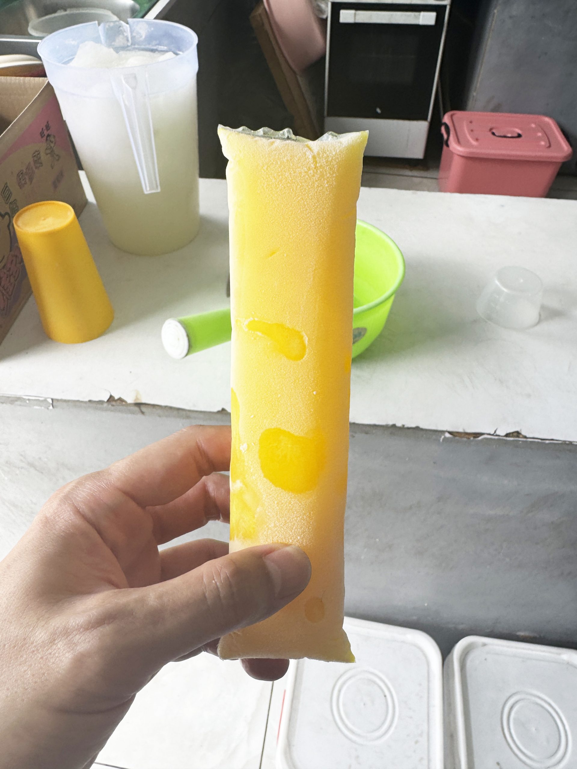 オバチャンに手渡されたバナナアイスは、薄めのビニールに密封されていました。キンキンに冷えています。開け口はないので、自分の手か歯でビニールを切って食べます。ビニールをむいて食べる感じです。