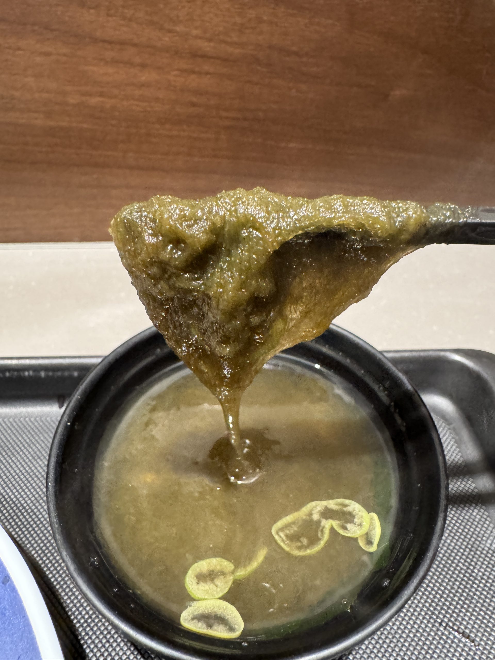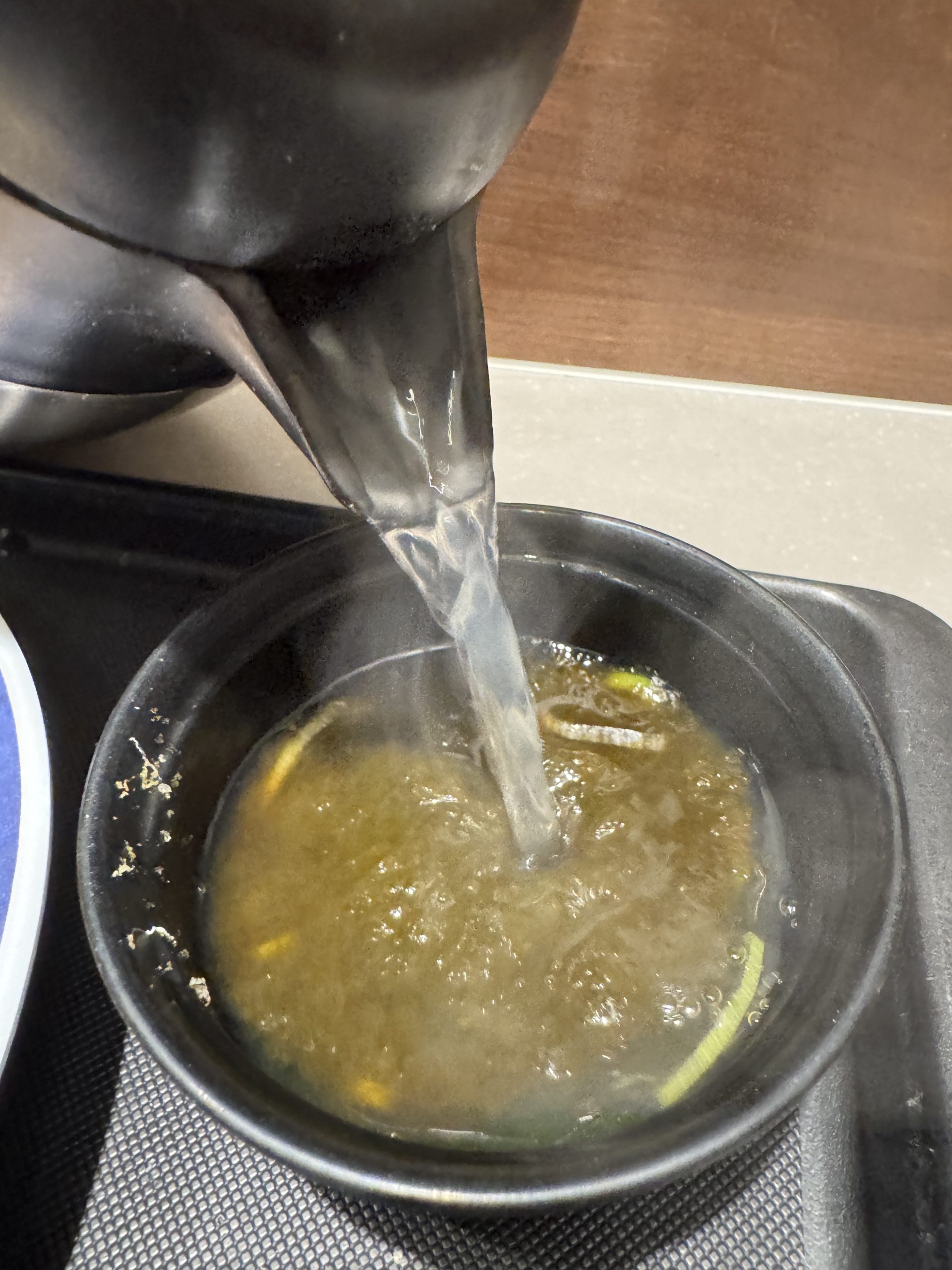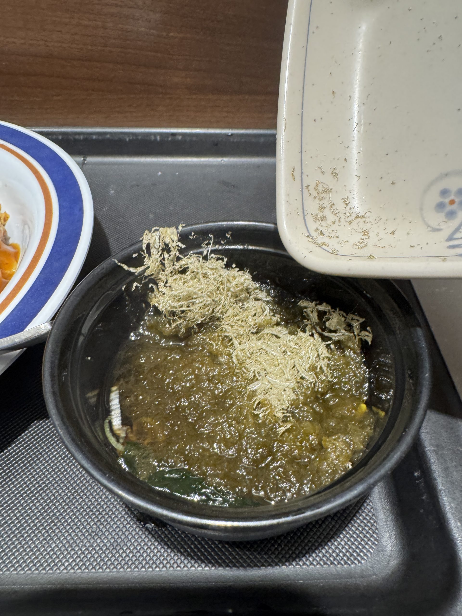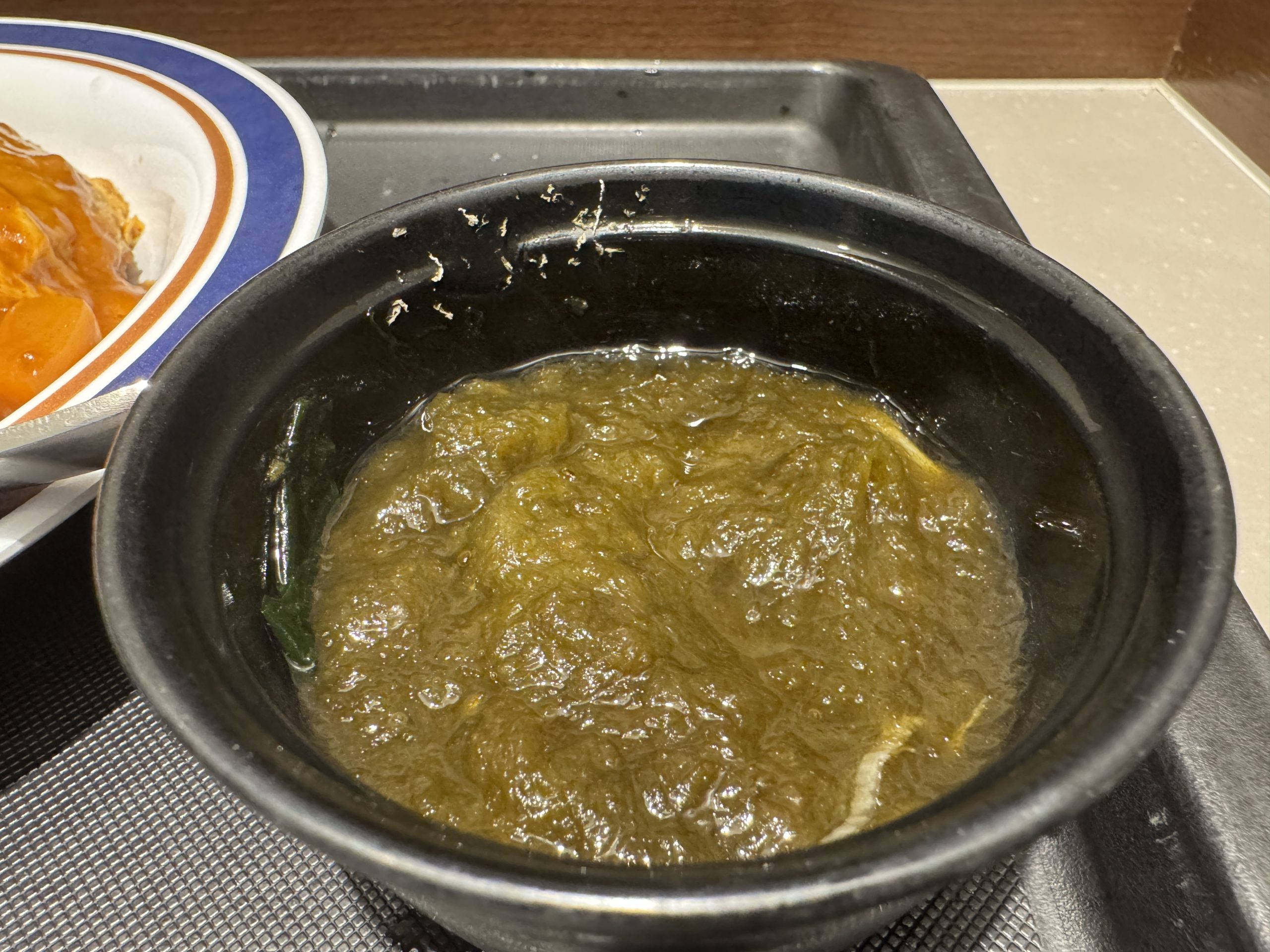とろろ昆布を、カレーかつ丼についてくるスープに入れます。