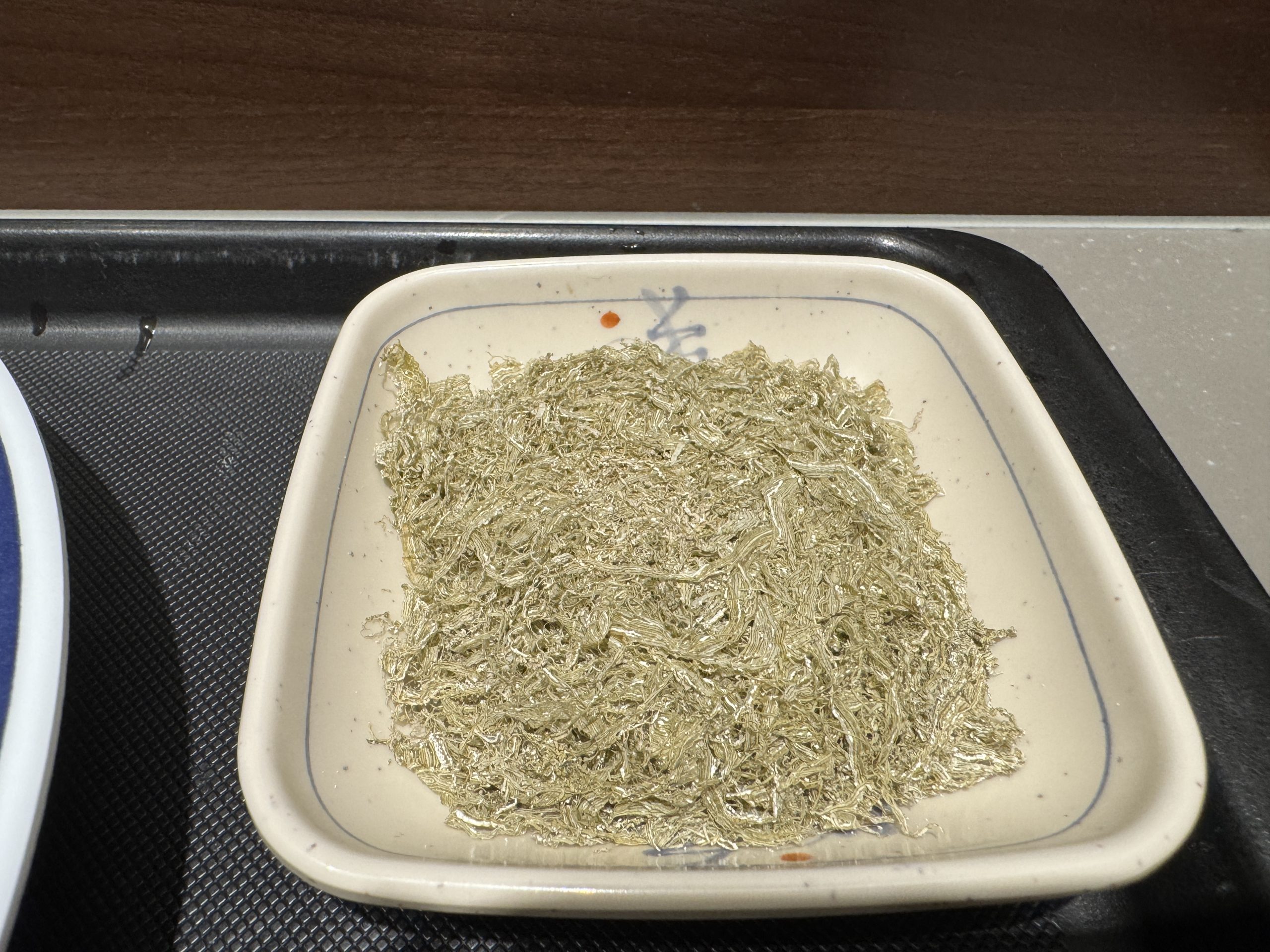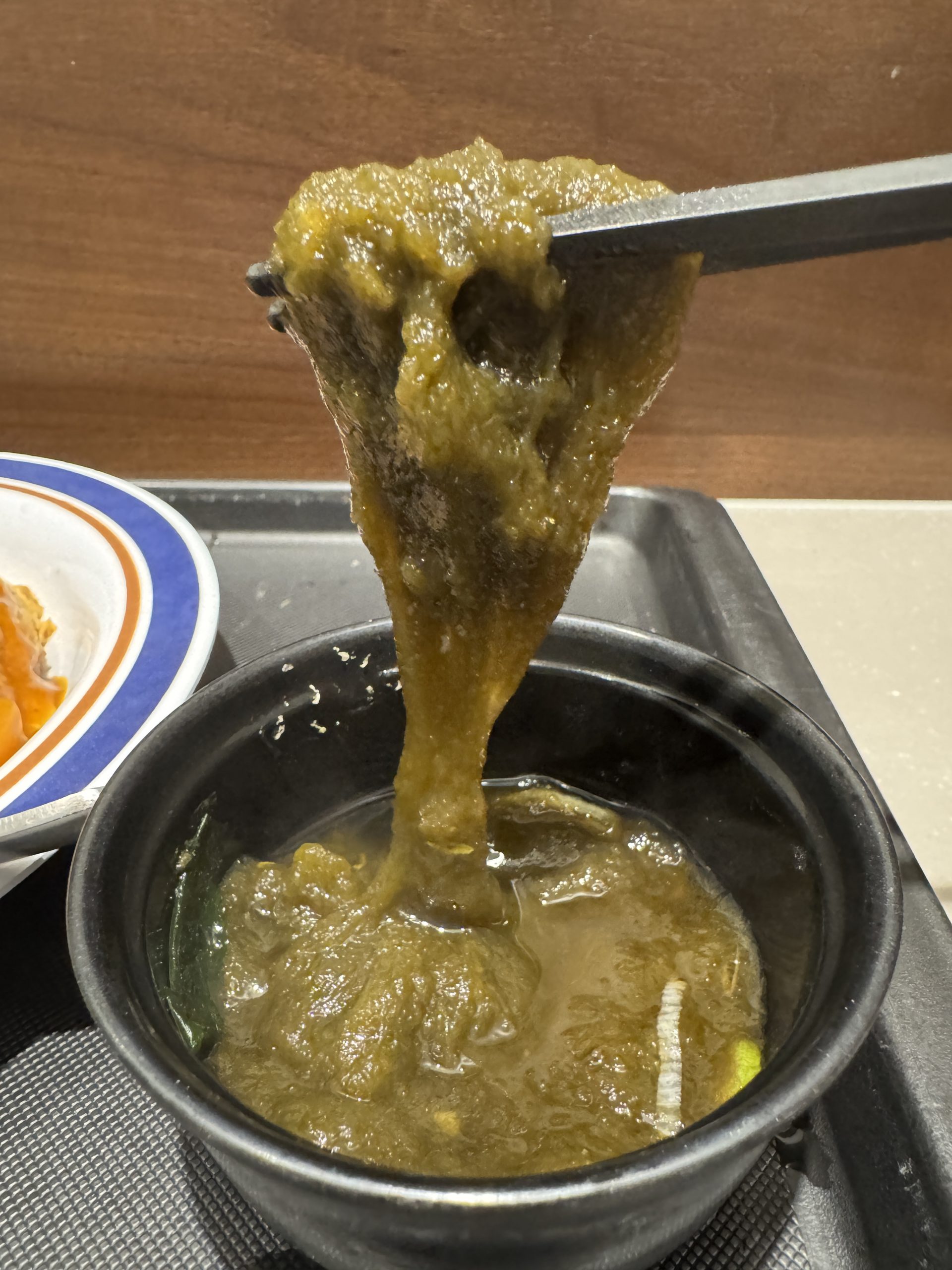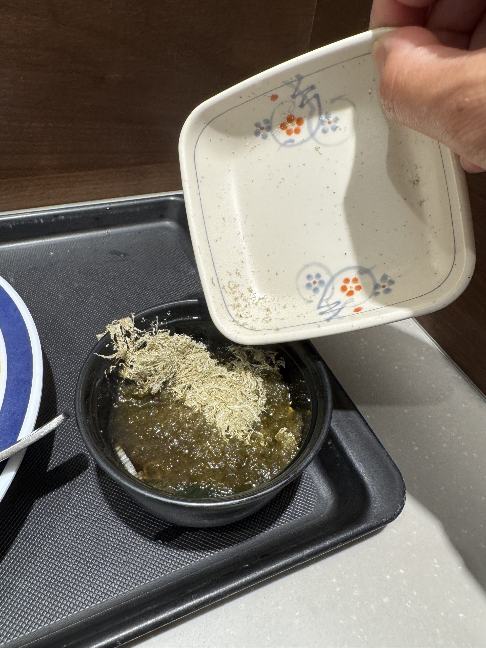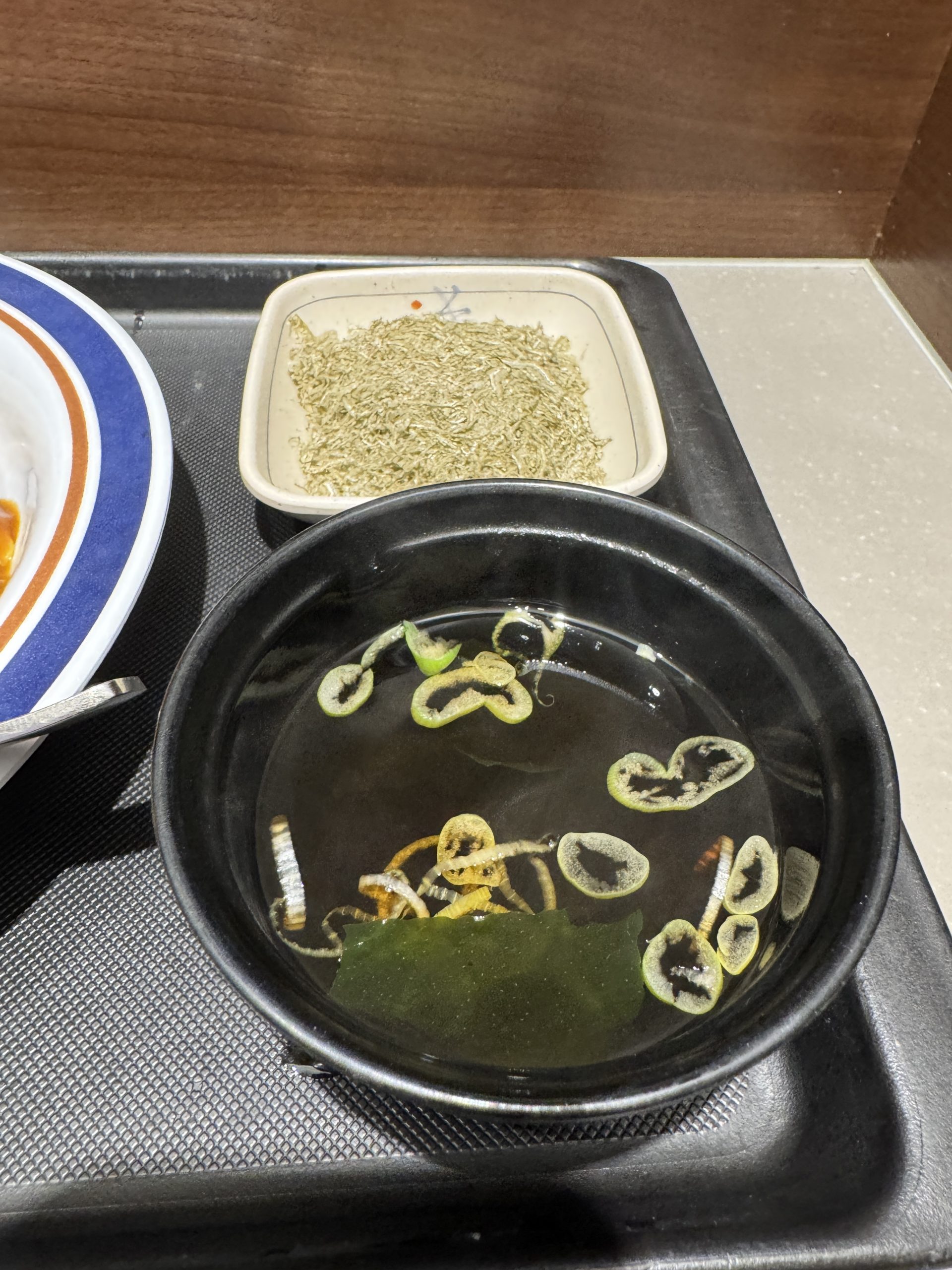 とろろ昆布を、カレーかつ丼についてくるスープに入れます。