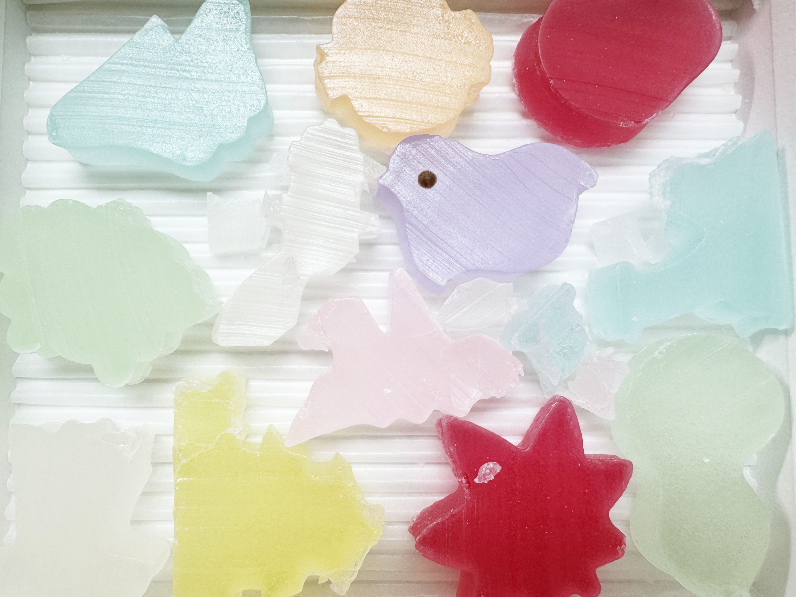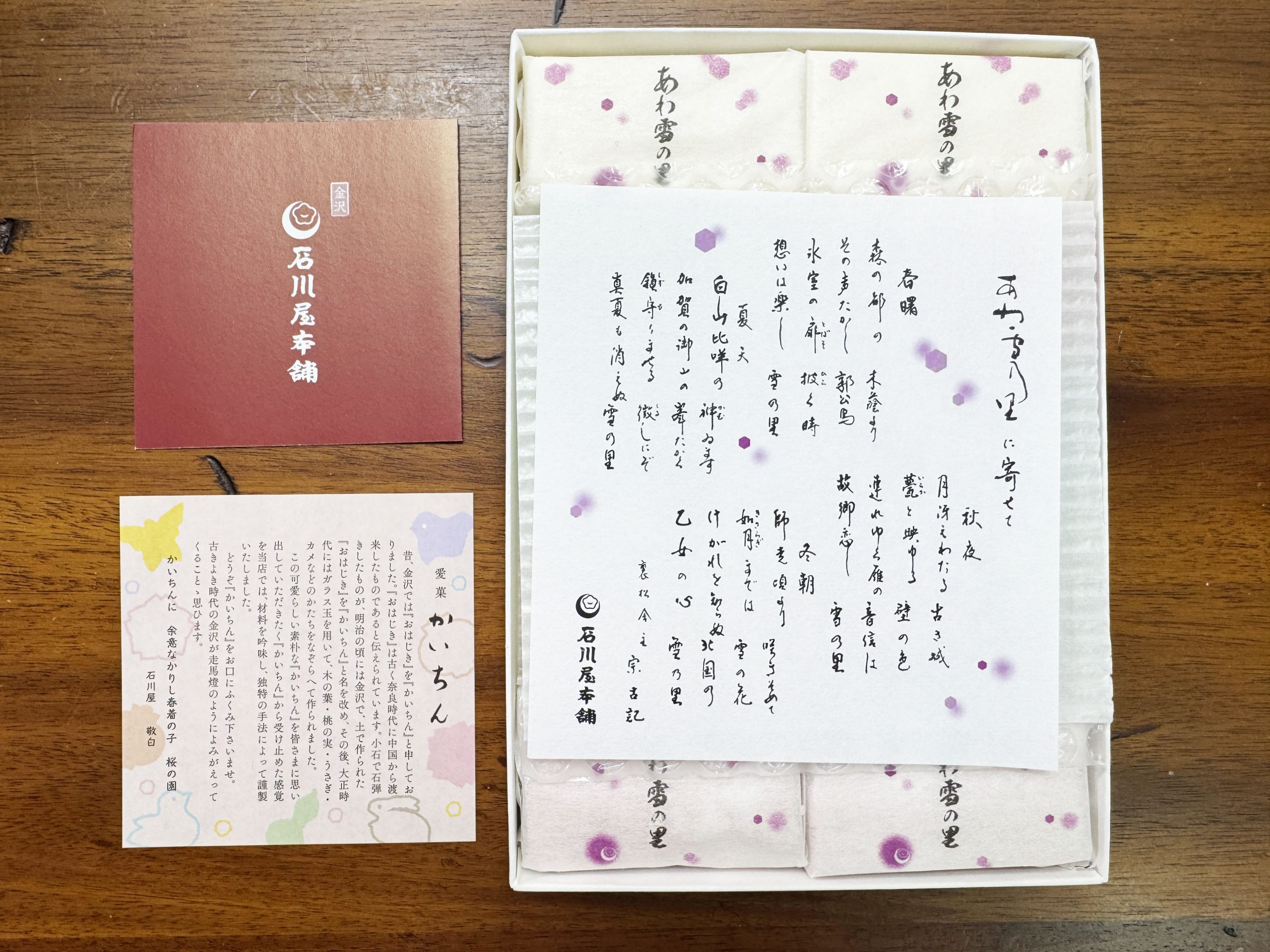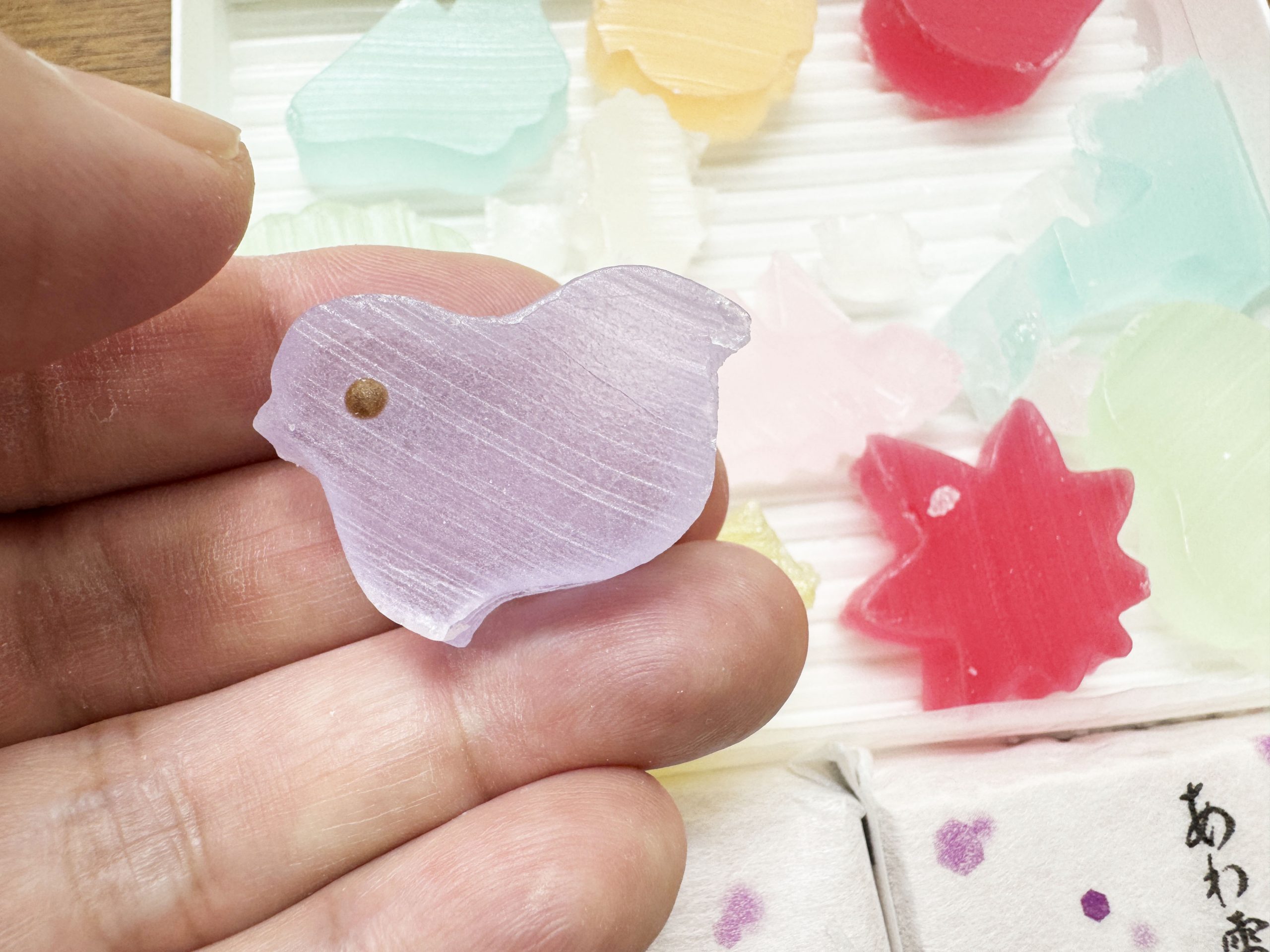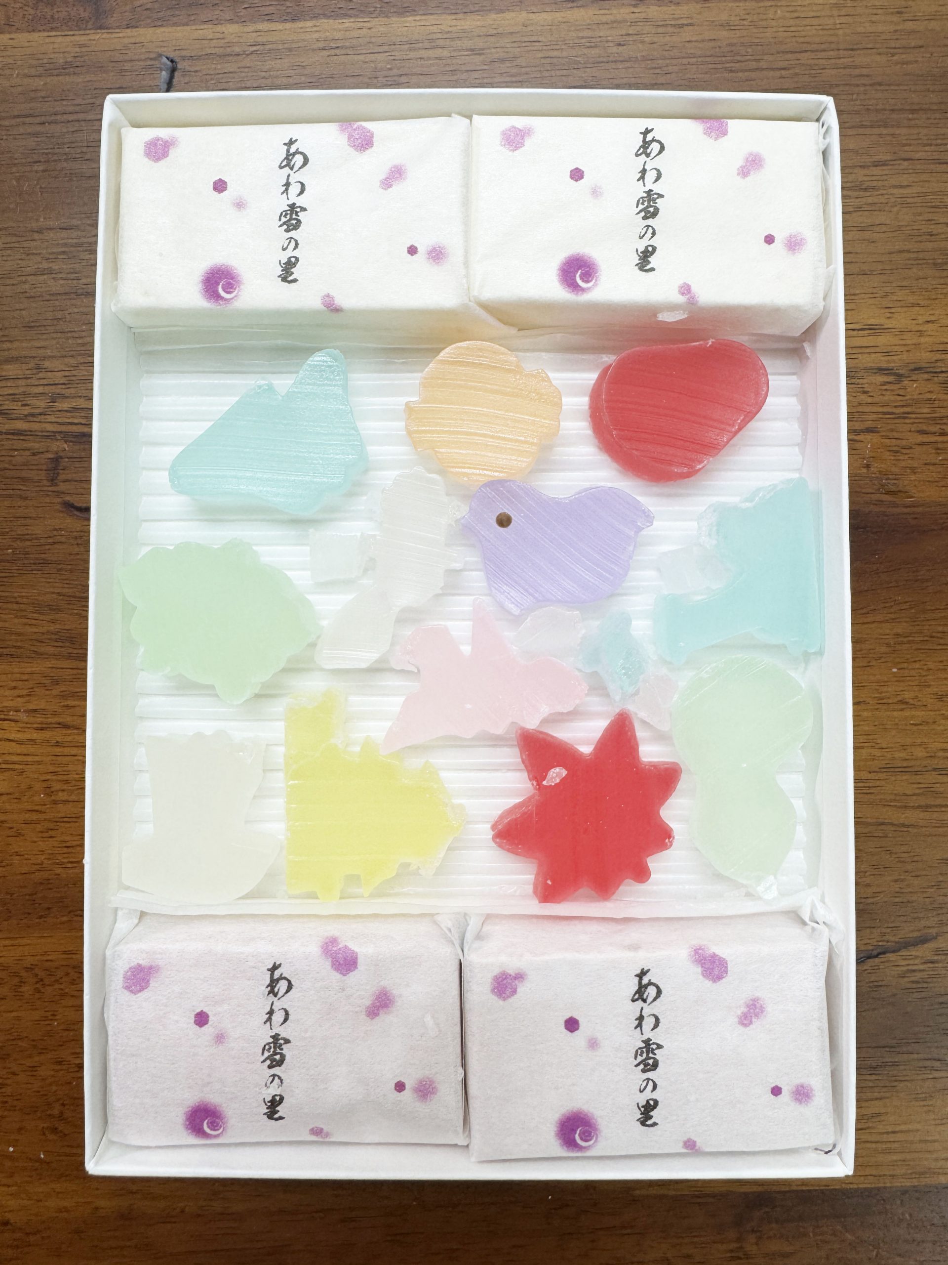 2025年10月に届いたものは、石川屋本舗の「かいちん」(琥珀糖)と「あわ雪の里」でした。「かいちん」はカラフルなお菓子で、透明感があって、観ているだけで心がなごみます。飴のように見えますが、表面は硬く、内部はトロリとした食感で、優しい甘味が広がります。とっても不思議な和菓子です。