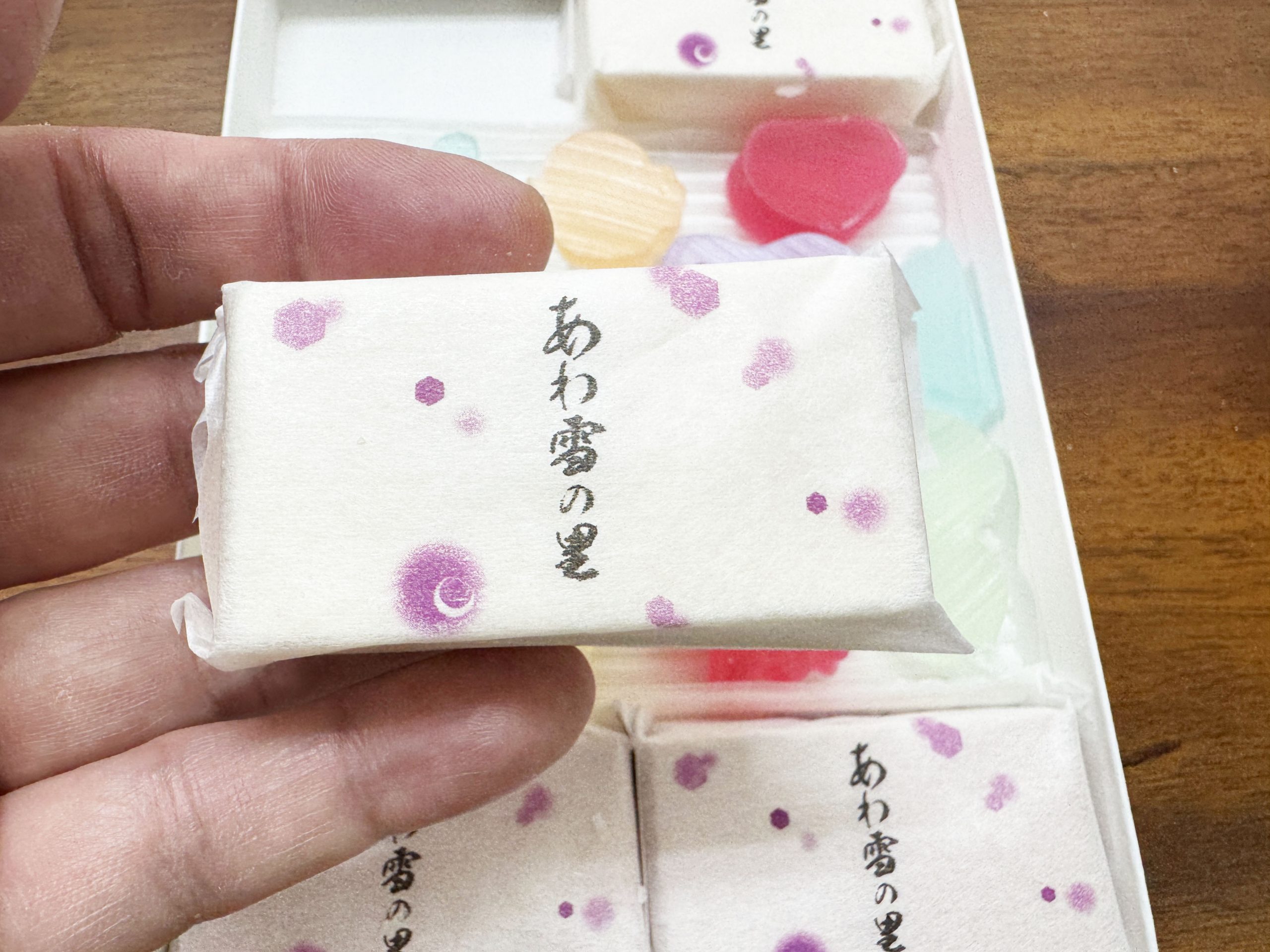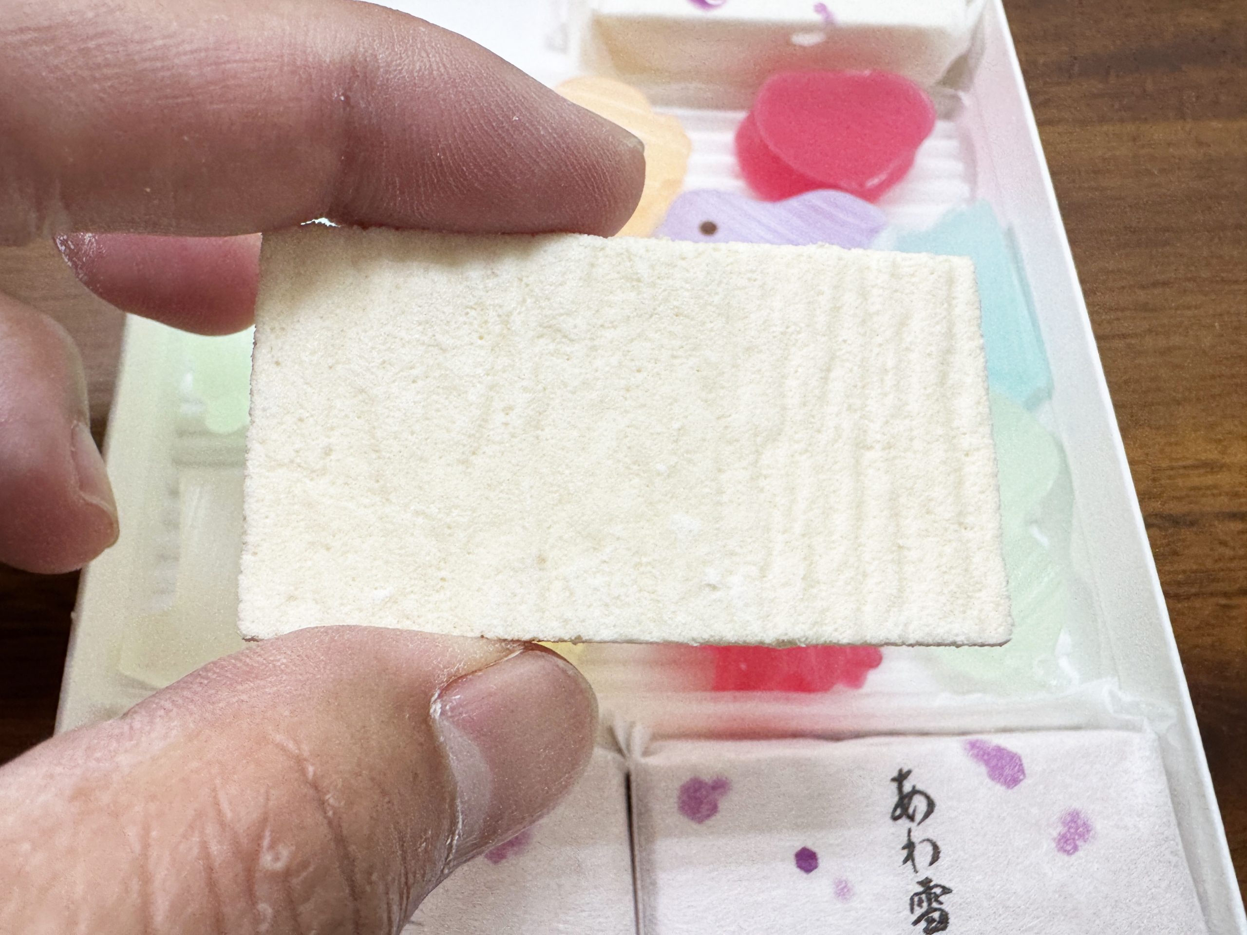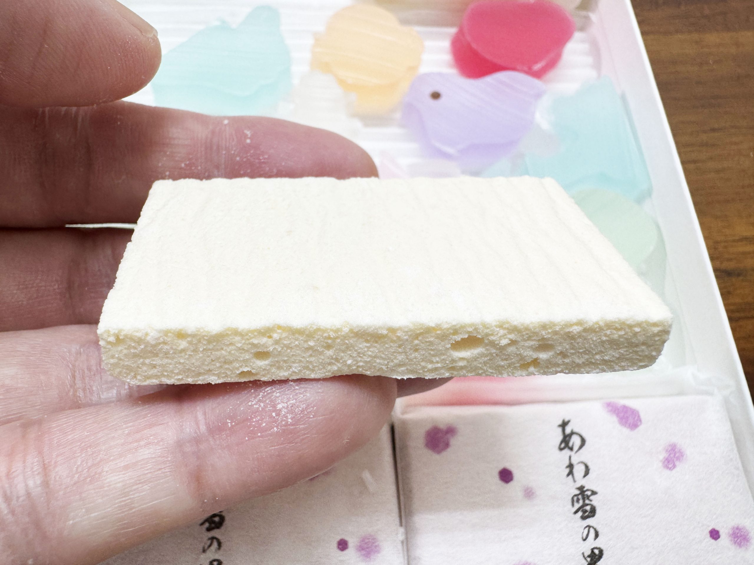 「あわ雪の里」は、ザ・和菓子といったテイスト。食べると、一気にパウダー化。一気に広がって、極めて上品ながらも強い甘味が味覚を包み込みます。これ、疲れているとき、集中力を保ちたいときなどに食べると癒やされるかも。