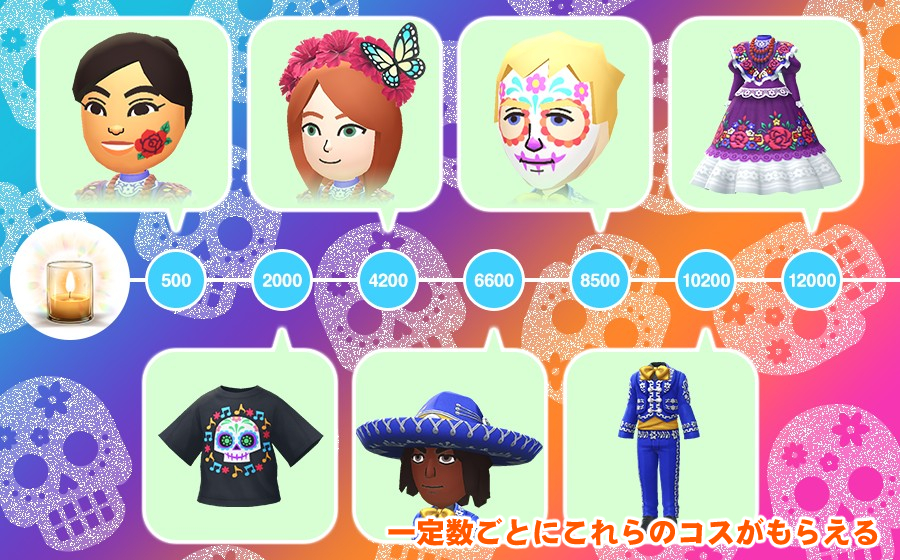 今月は“ゆらめくキャンドル”というアイテムを集めることで、ディア・デ・ムエルトスにピッタリで個性的なコスチュームを入手できる。