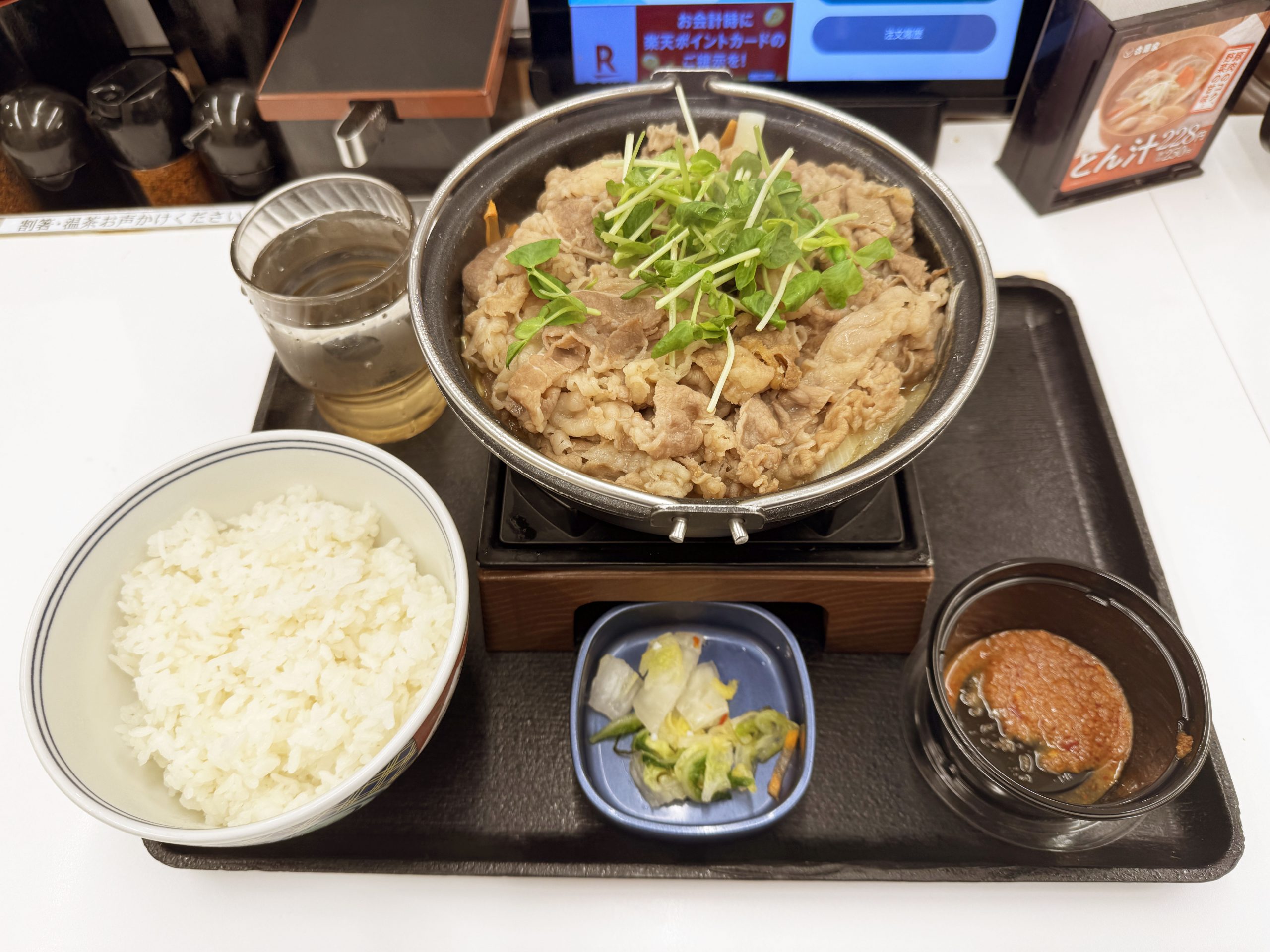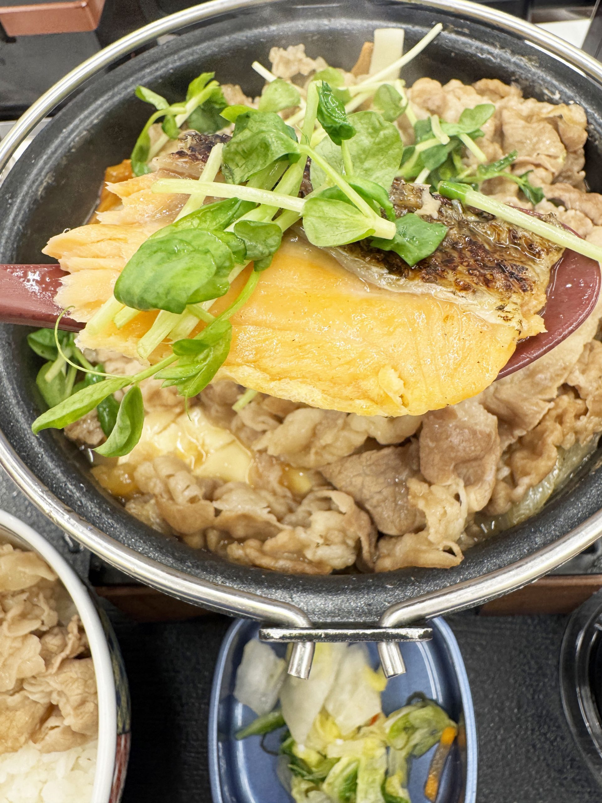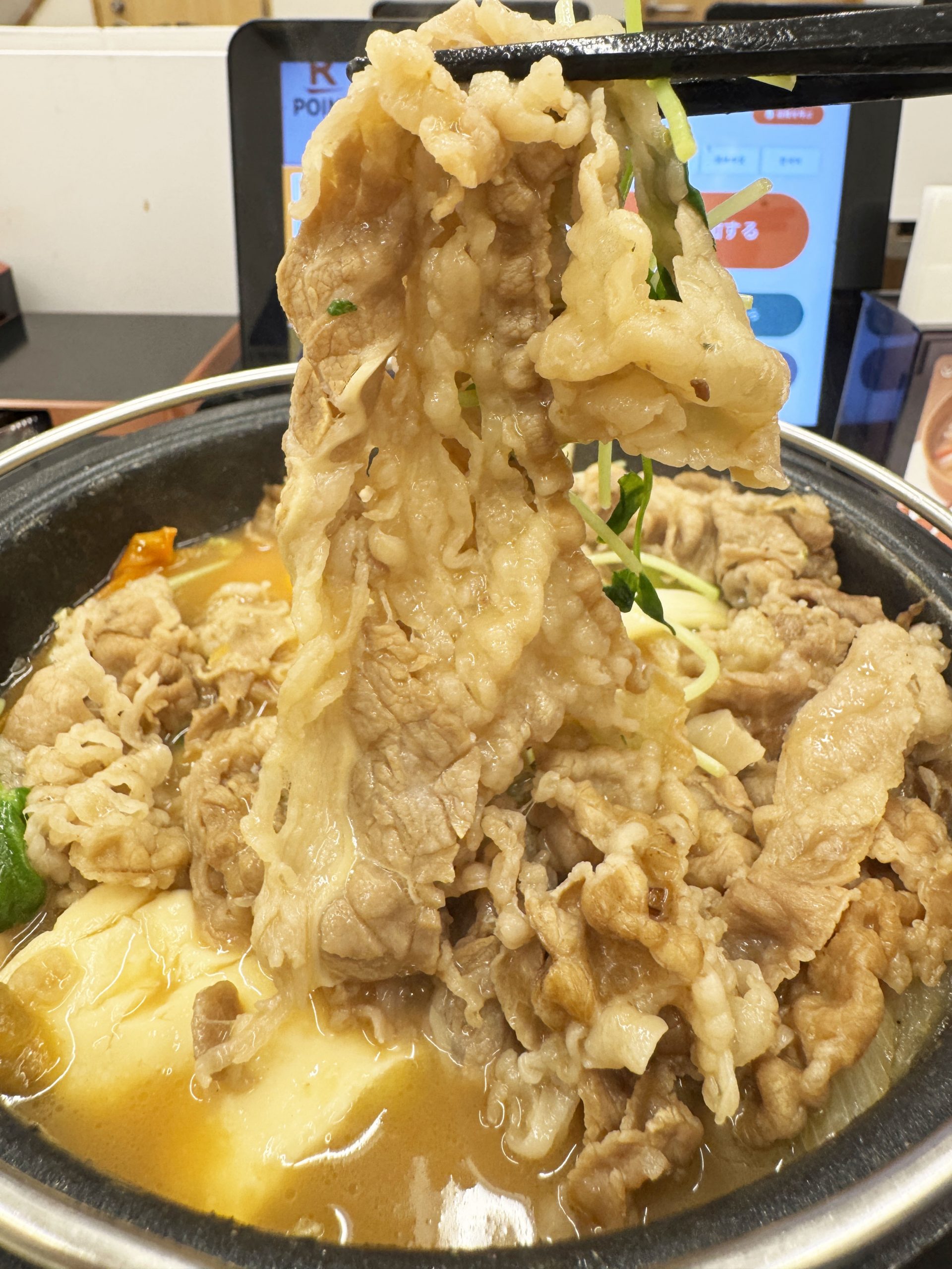 吉野家の「とんこつ醬油牛鍋膳」は、牛肉がたっぷり入った鍋料理で、濃厚とんこつ醤油ベースのスープで具材を楽しむことができます。