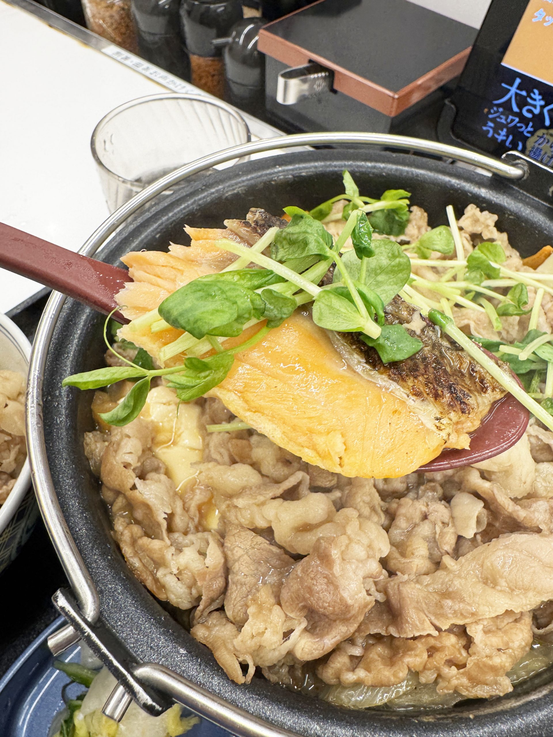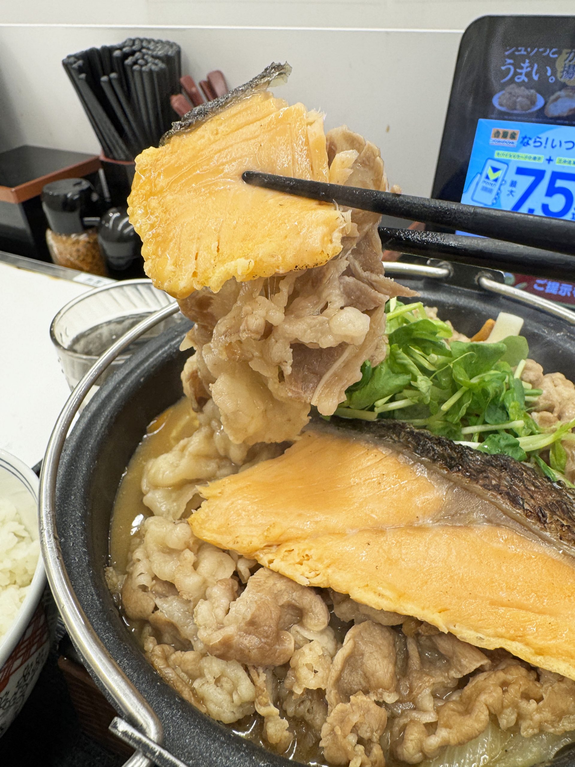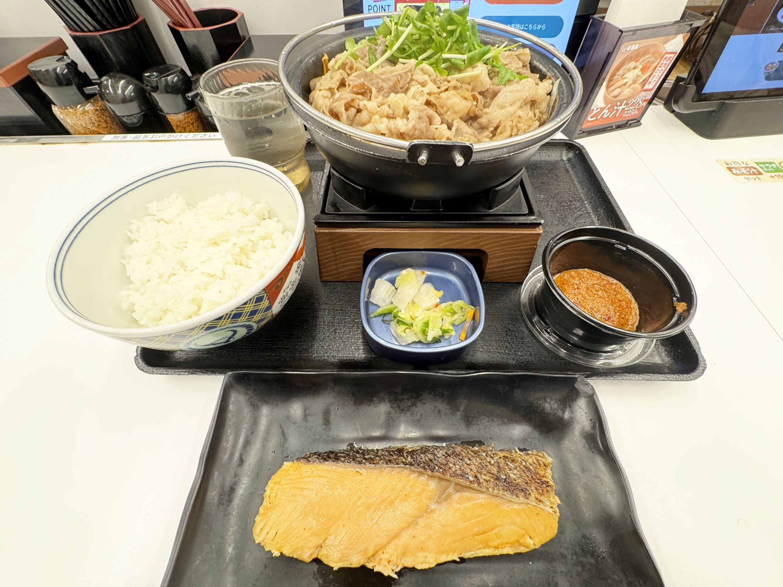 ご飯は大盛りをオススメしますよ。この「とんこつ醬油牛鍋膳」+シャケは、ご飯が進む料理です。さらにご飯をおいしくする食べ方ともいえます。