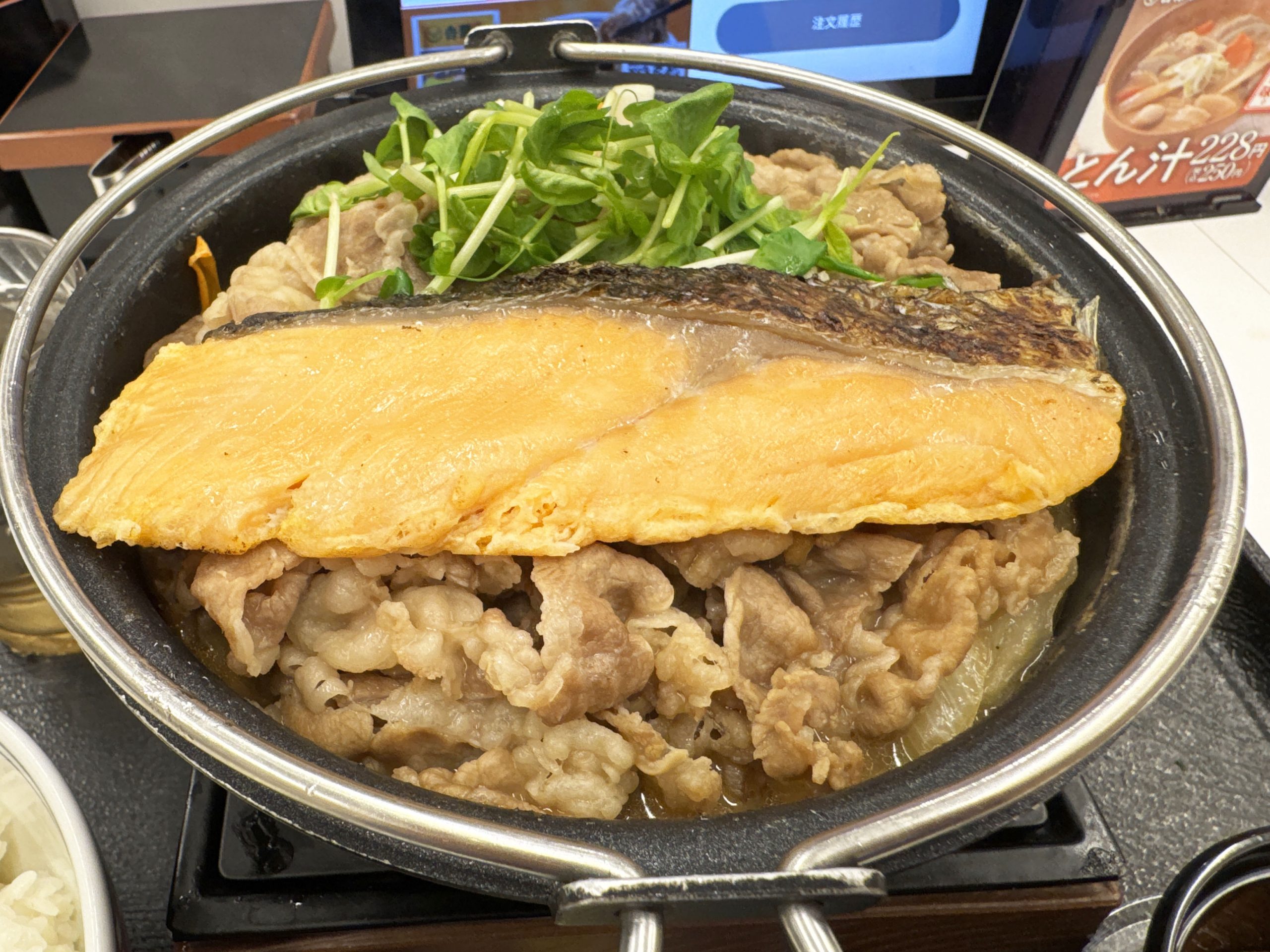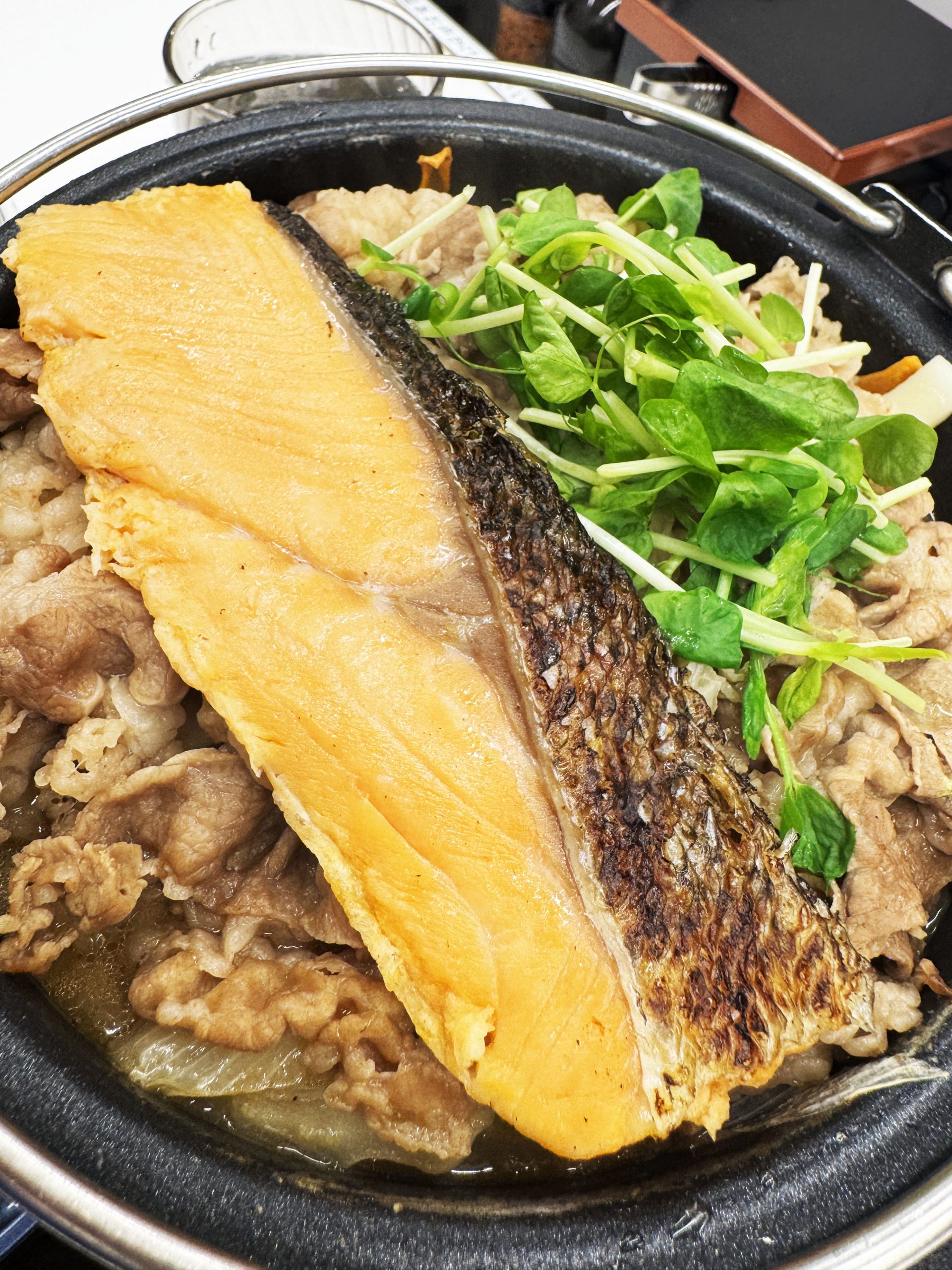 そんな「とんこつ醬油牛鍋膳」に、単品のシャケを追加することで、まるで北海道名物「石狩鍋」のようになることをご存じでしょうか。