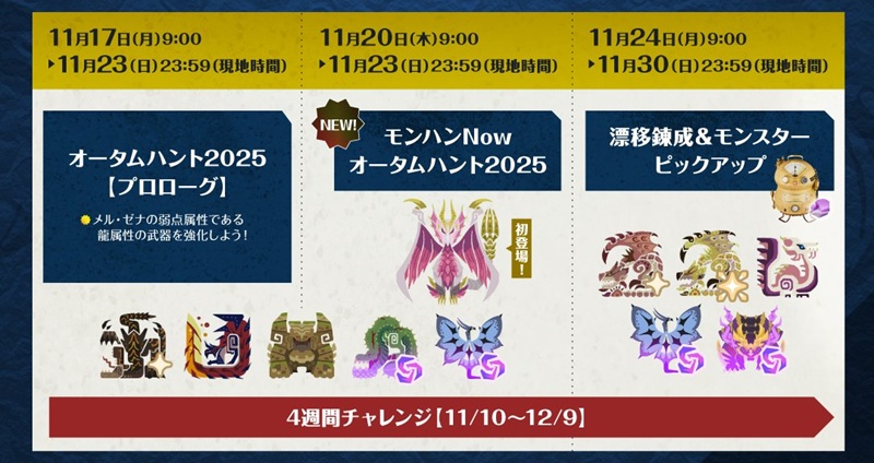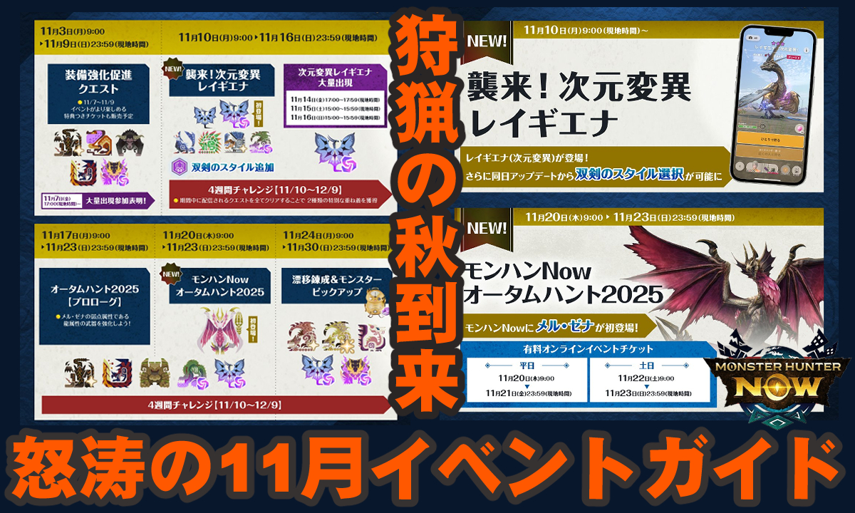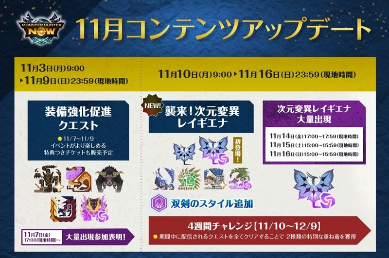 装備強化促進を狙った特別クエストなど、11月3日(月)から順次始まる各種イベントのスケジュールをおさらい。