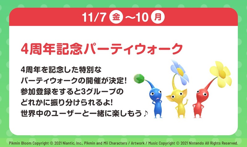 そんななか、赤青黄のピクミンチームに分かれて挑む公式パーティウォークの情報が本日(10/28)公開された。
