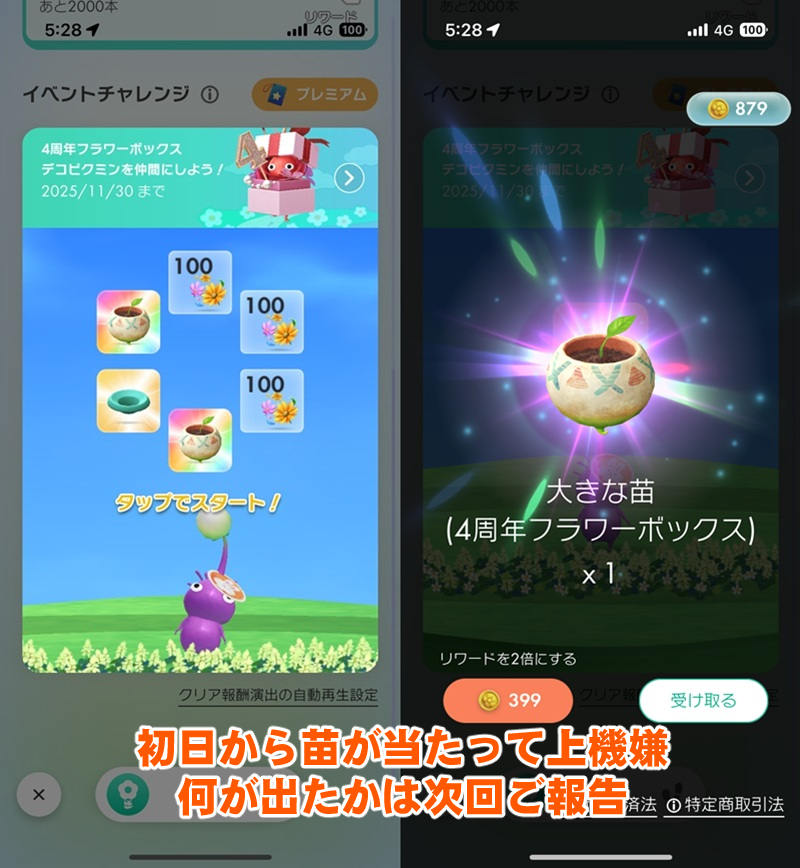 ちなみに最初のお題達成時に必ずもらえる金の苗(4周年フラワーボックス)がもらえるけど、みんなは何ピクミンだったかな?