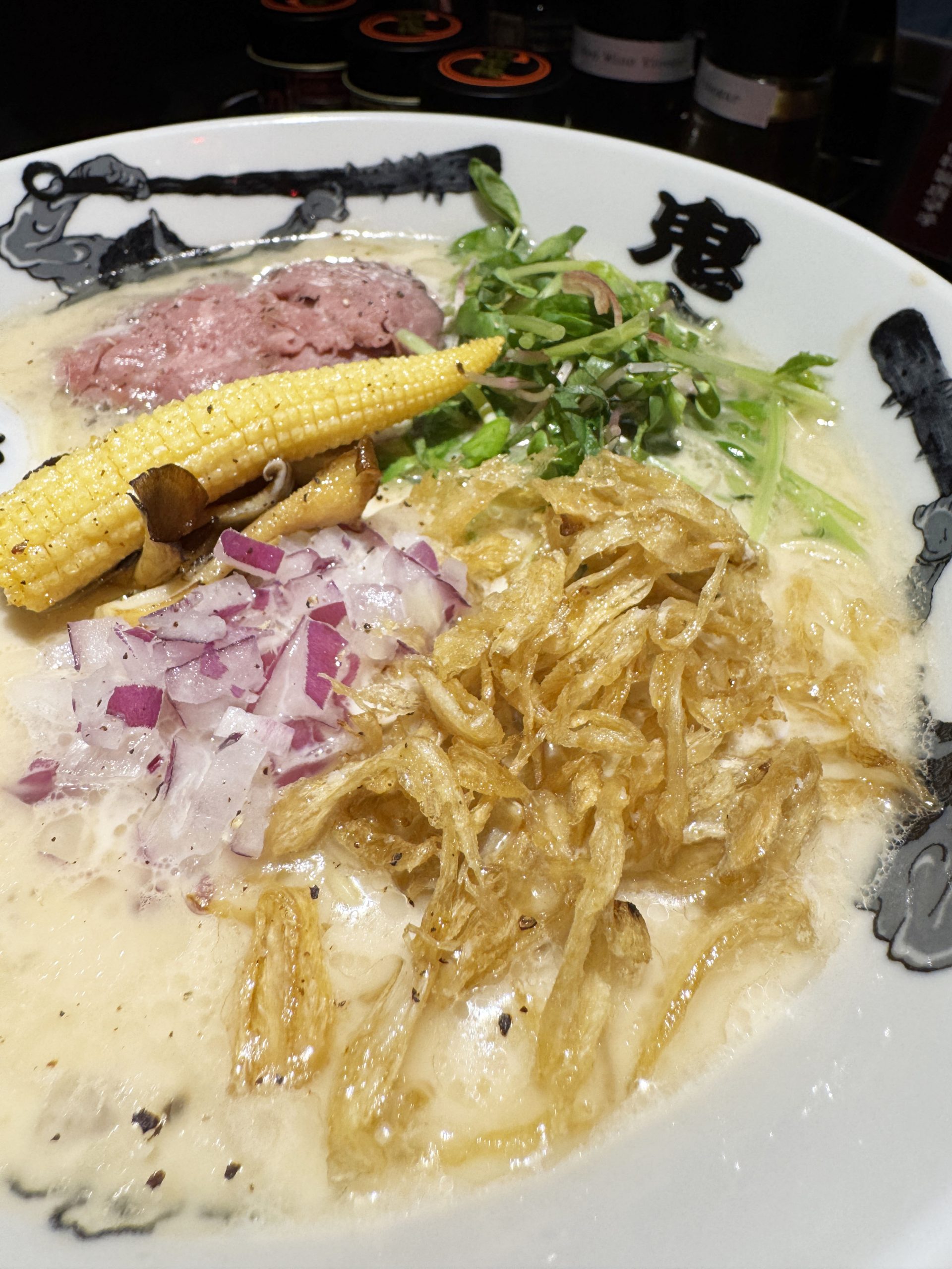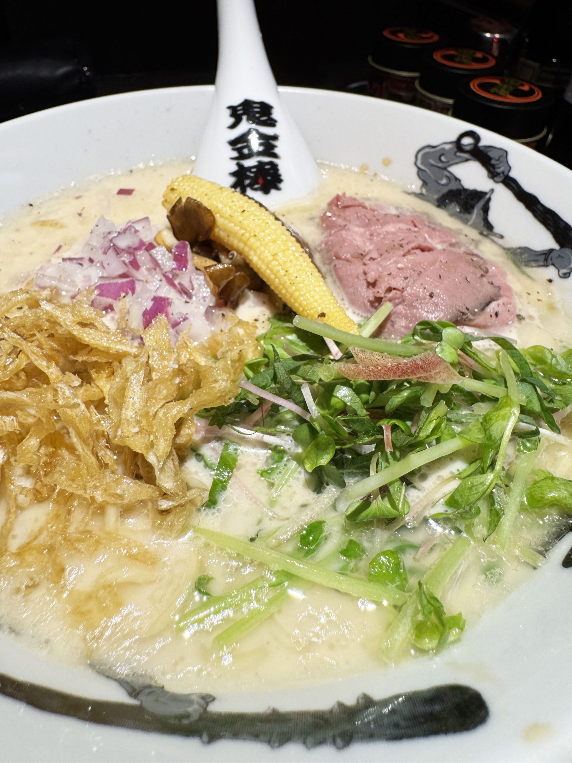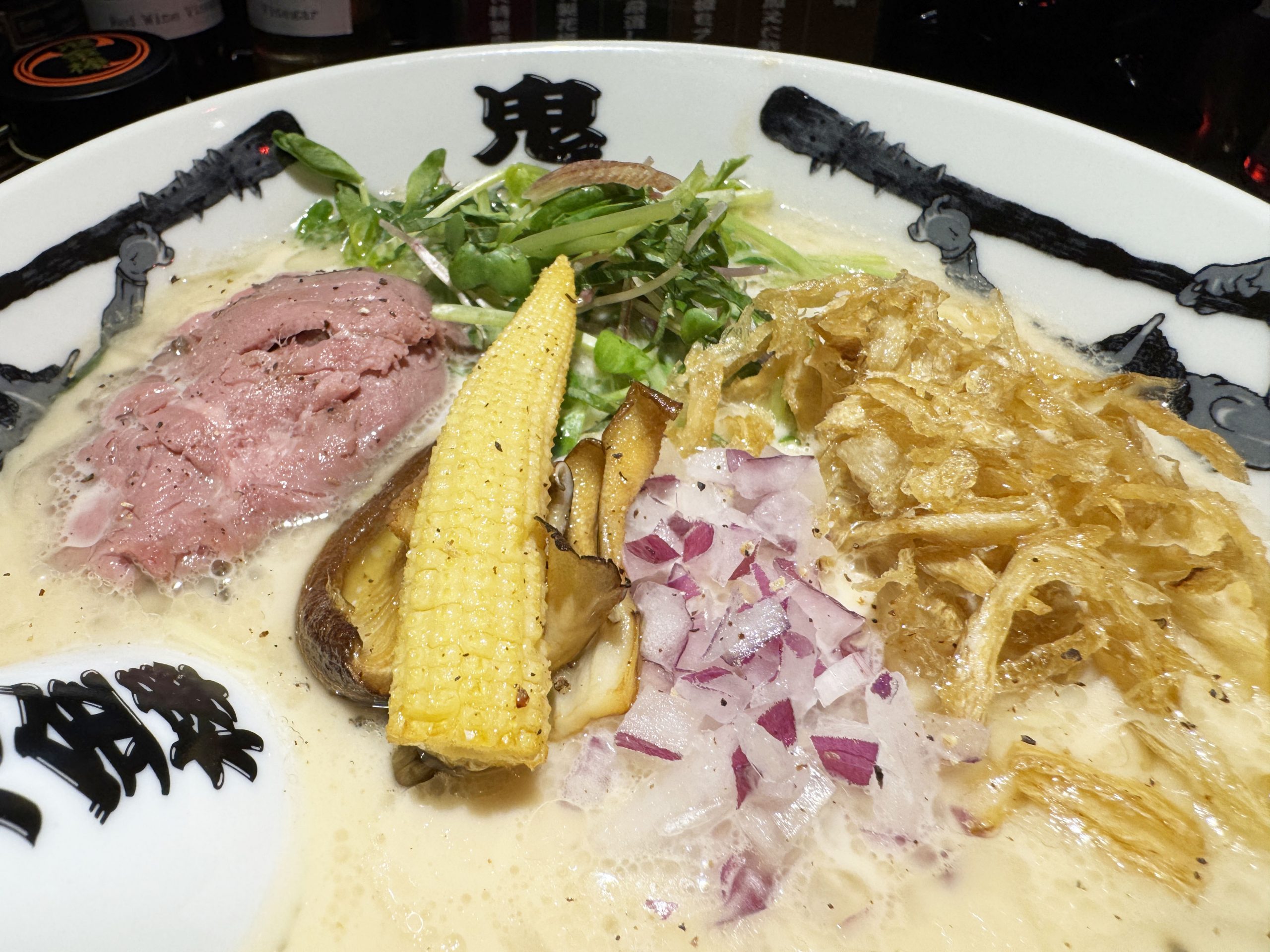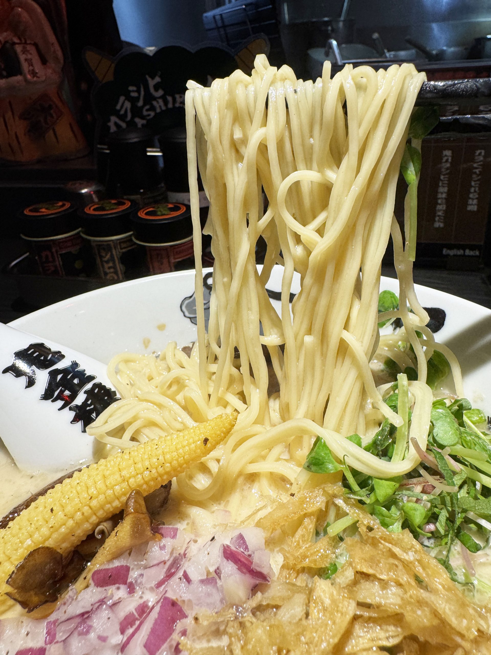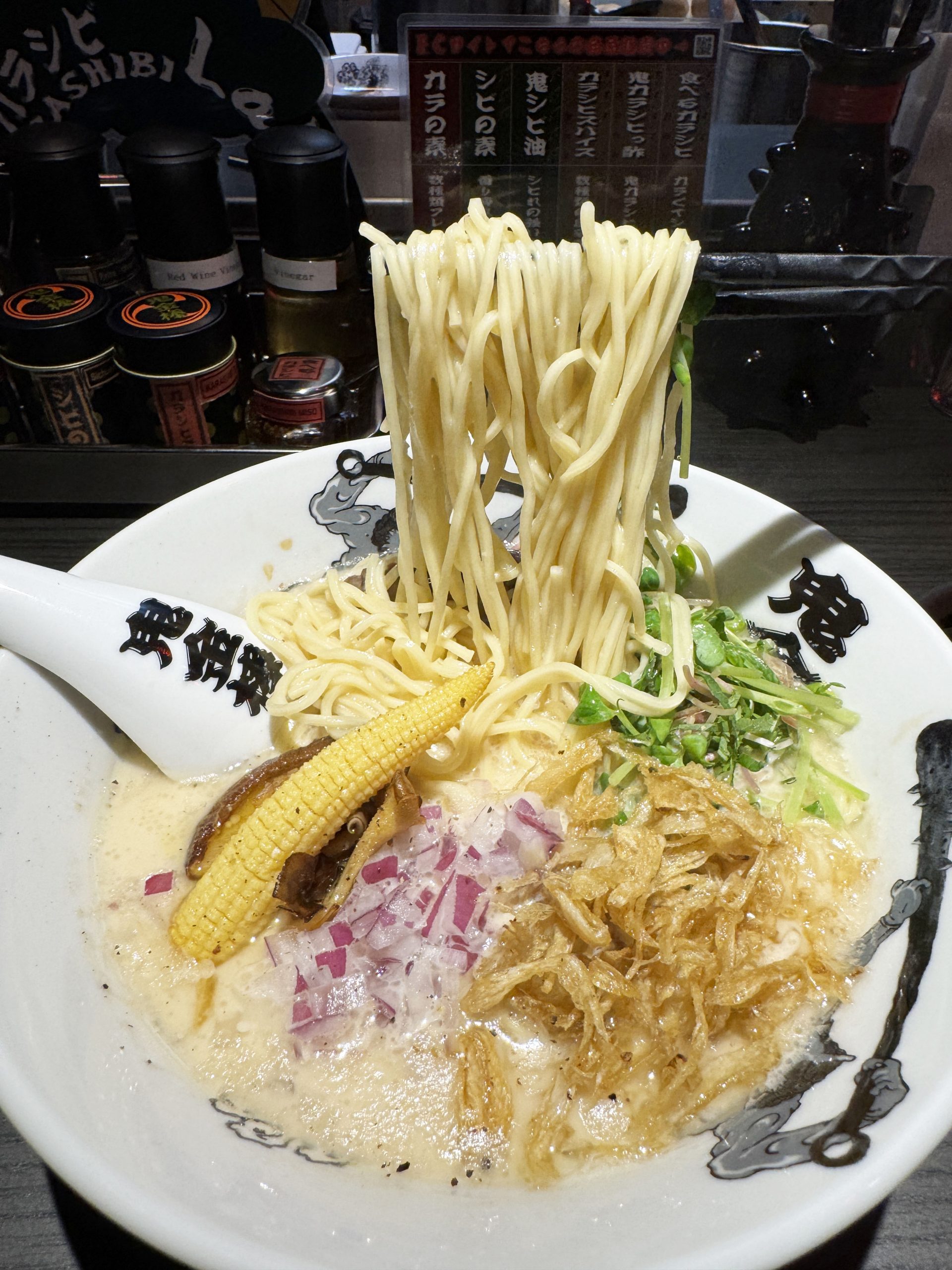 スープが完全にホワイト、白、純白、クリーミィ。レンゲですくってみると、トロトロというよりサラサラな感じ。極めて濃いのにサラサラ。そのギャップ。これはもう期待しかありません。鬼金棒のラーメンに欠かせないベビーコーンの存在も確認。いいですね!