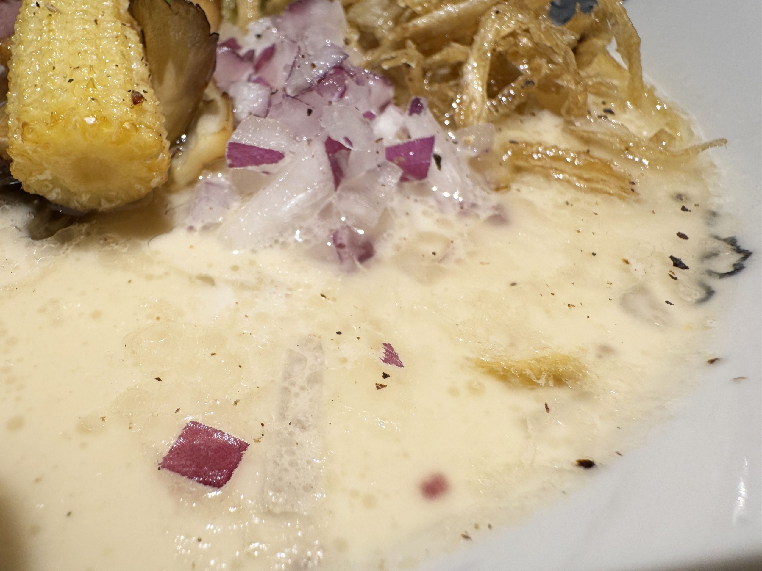 さっそく麺をすすってみる。……おおっ!! これは予想外。かなり想定外。かなり、濃い、ミルク感! いやこれ、適当なことは言えないけど、あくまで筆者の感想としては、ココナッツミルク感あふれるテイスト。何由来のミルク感なのかな? かなりおもしろいです! そして、おいしい。