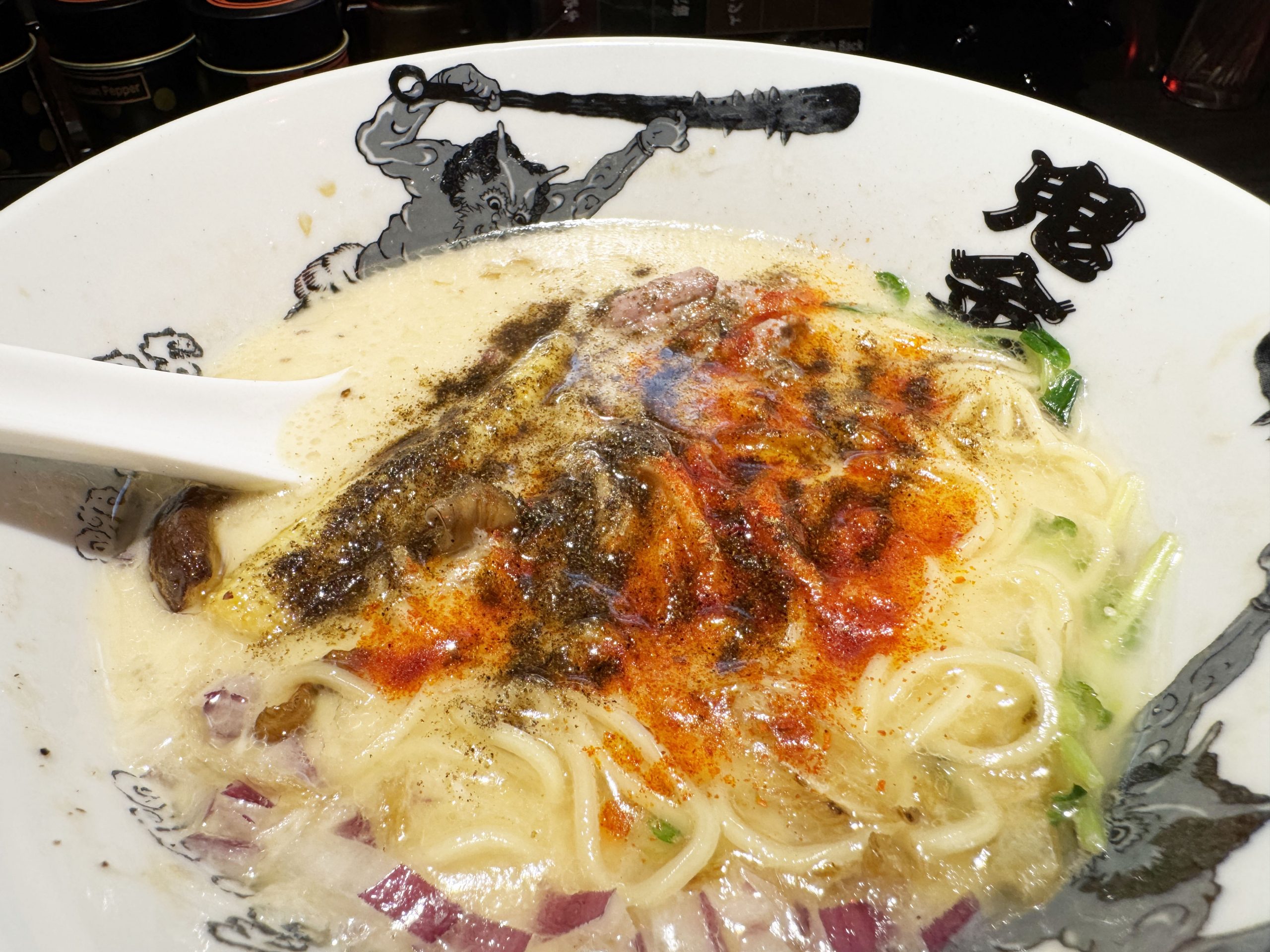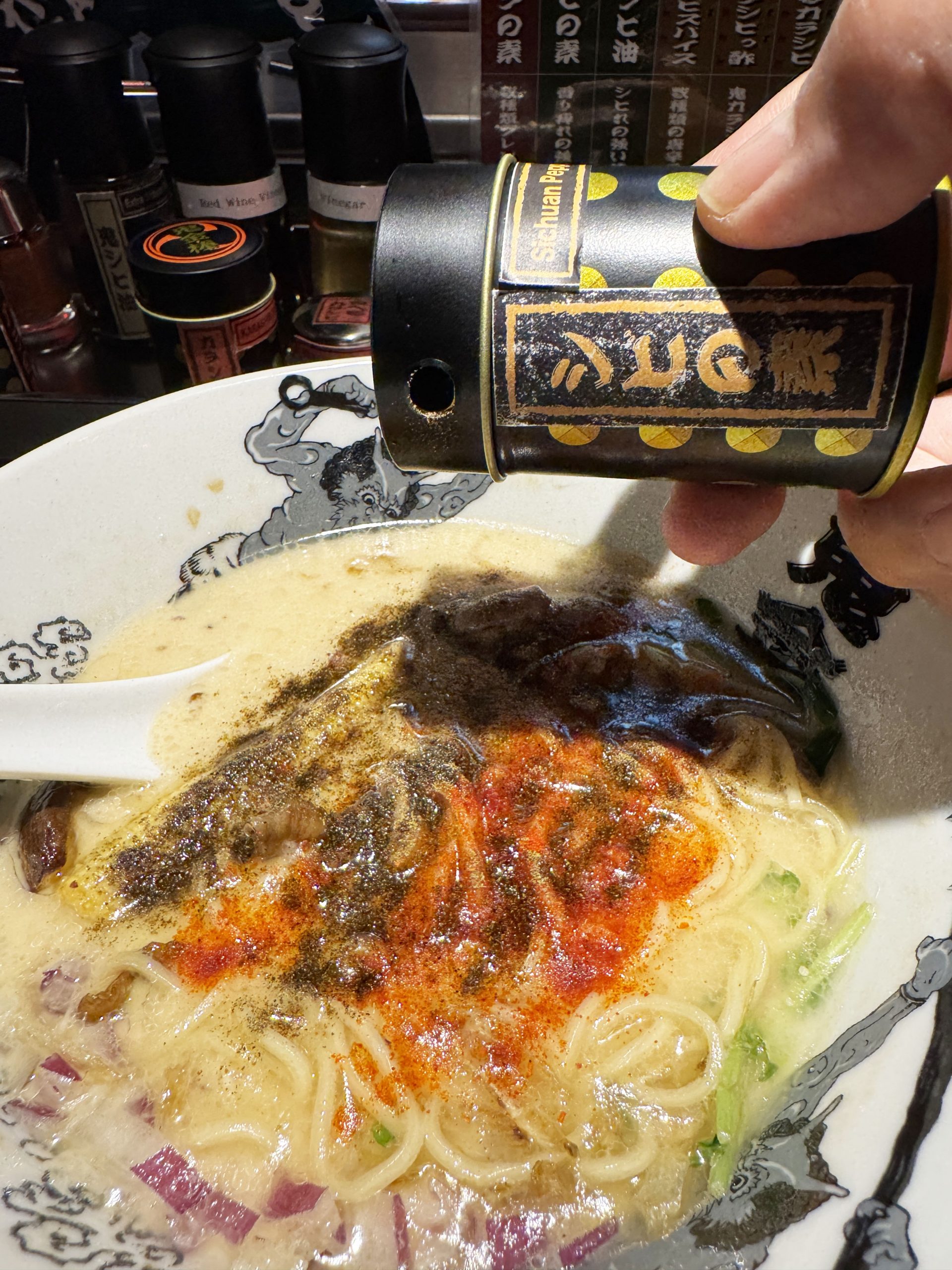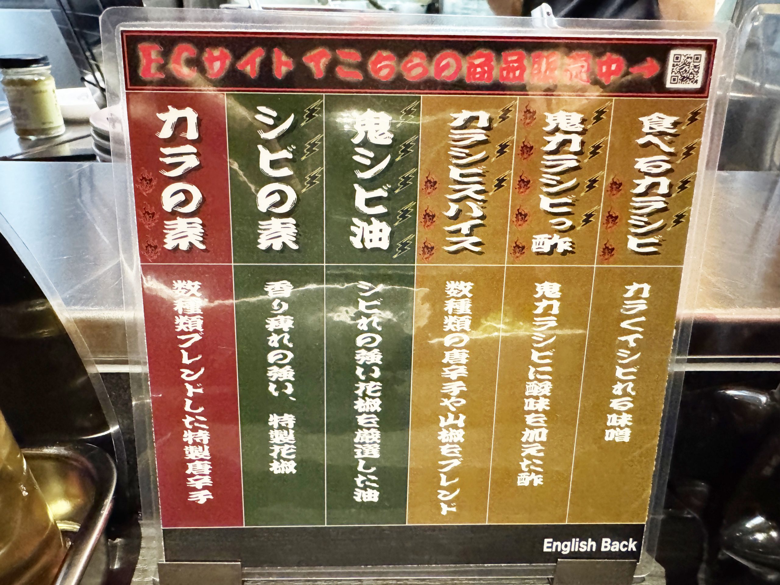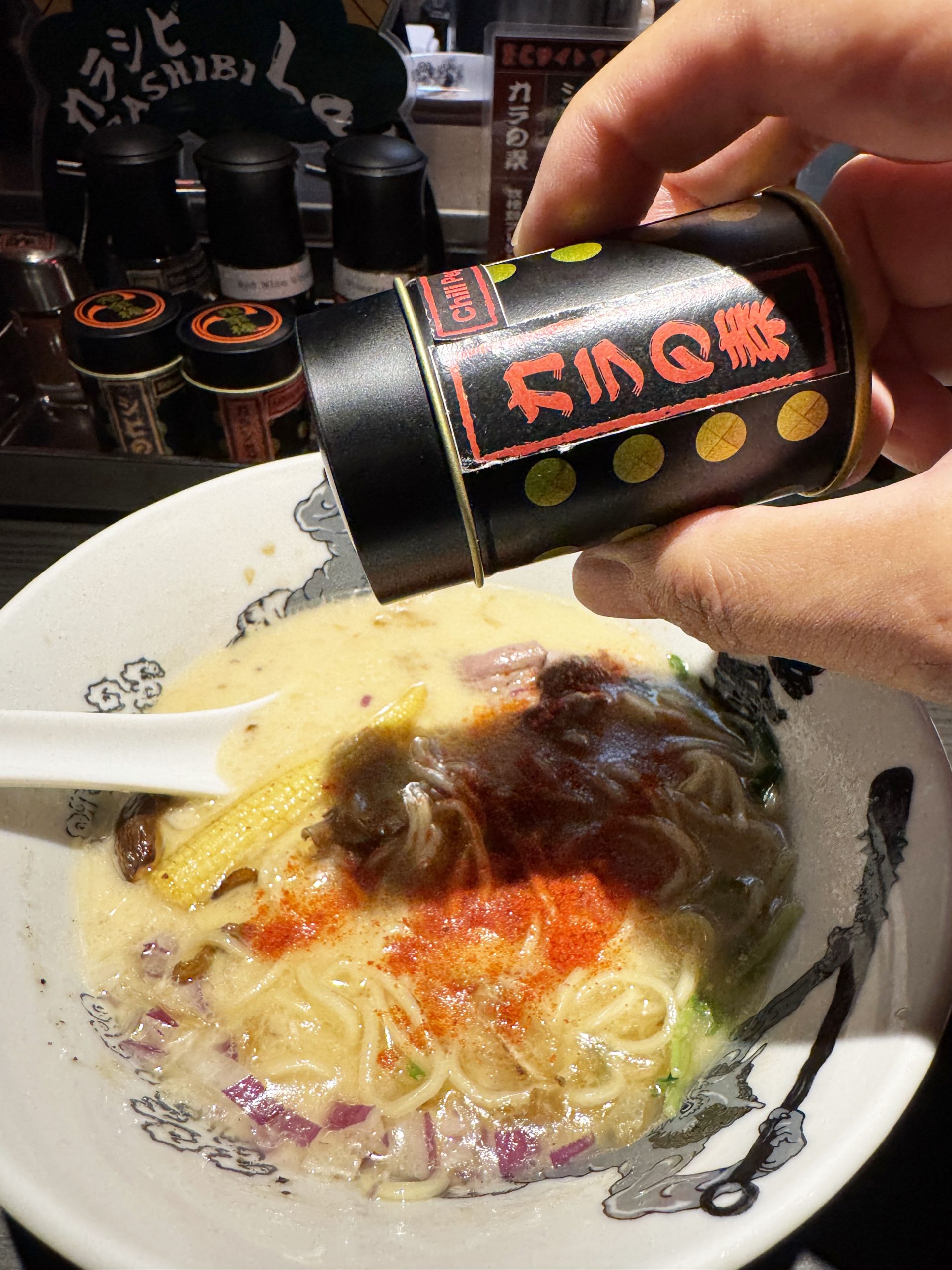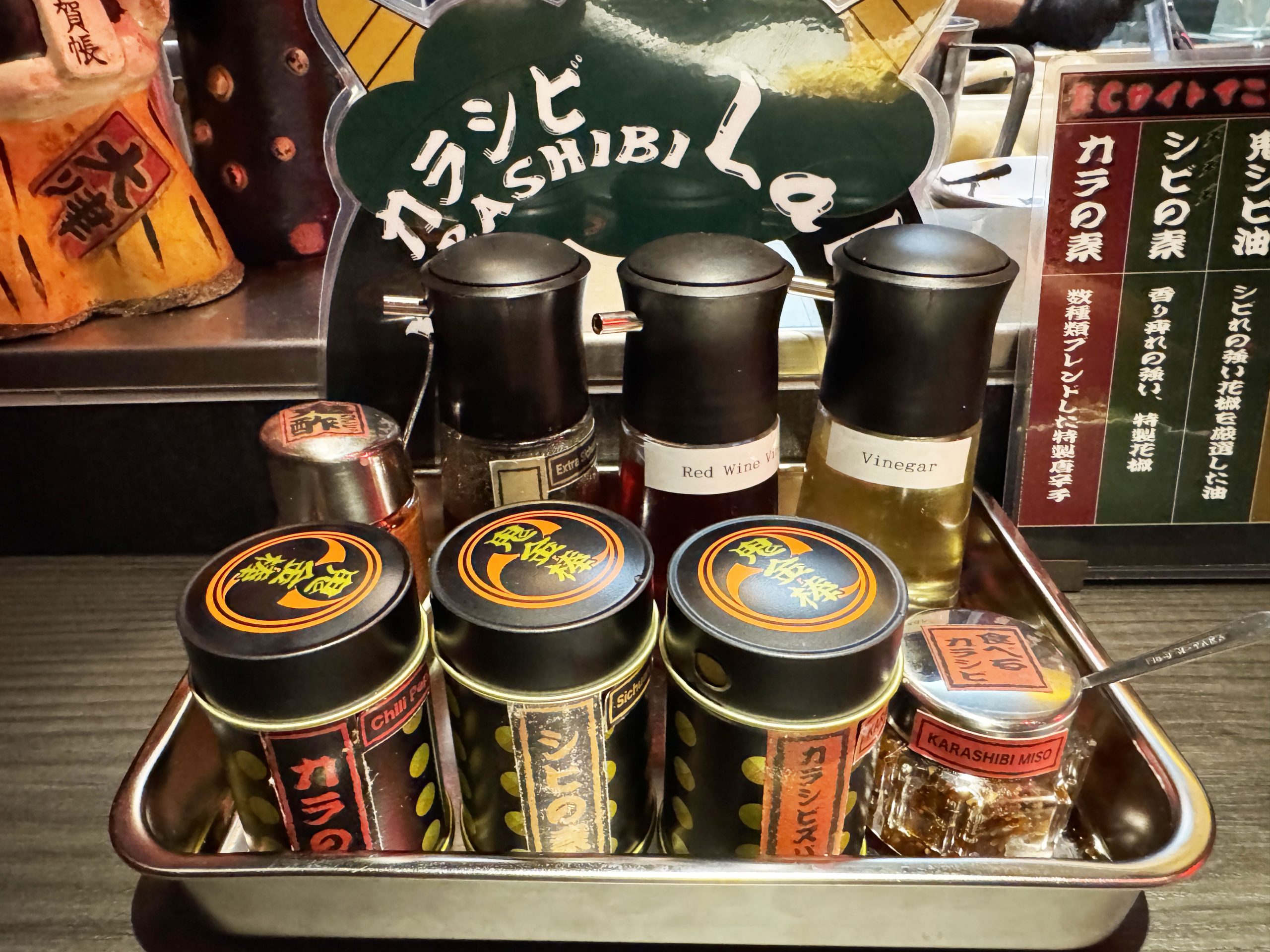 ラーメンを2/3ぐらい食べたあたりから、味変をすることに。卓上には複数の調味料があり、味変を推奨している感があります。ということで、元祖「鬼金棒」的なテイストにするべく、カラとシビのダブルをラーメンにふりかけます。おまけでオイルもかけてみます。