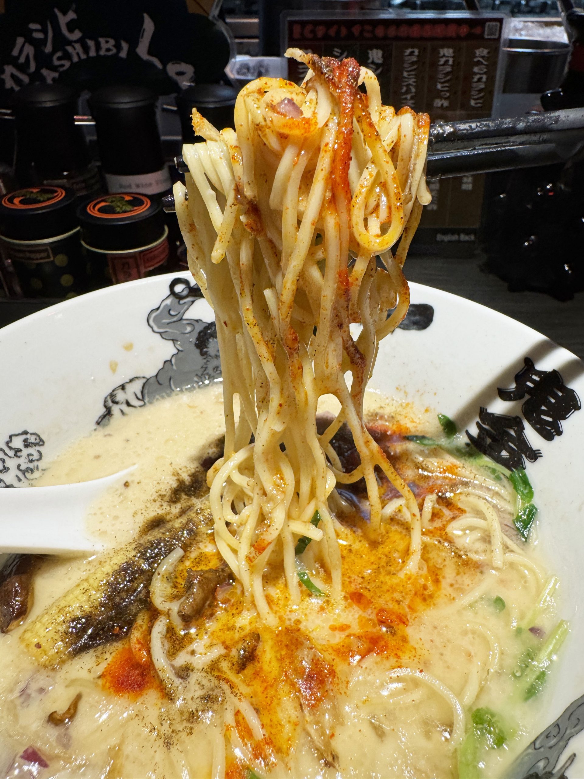 ……その味は、実にうまい。一気に牛骨スープのならめかさが消え、冴えた刺激と旨味のラーメンに変化。ベースの牛骨スープが超絶マッタリ系なので、優しさのなかにある辛味とシビレを堪能できます。イイ感じです。