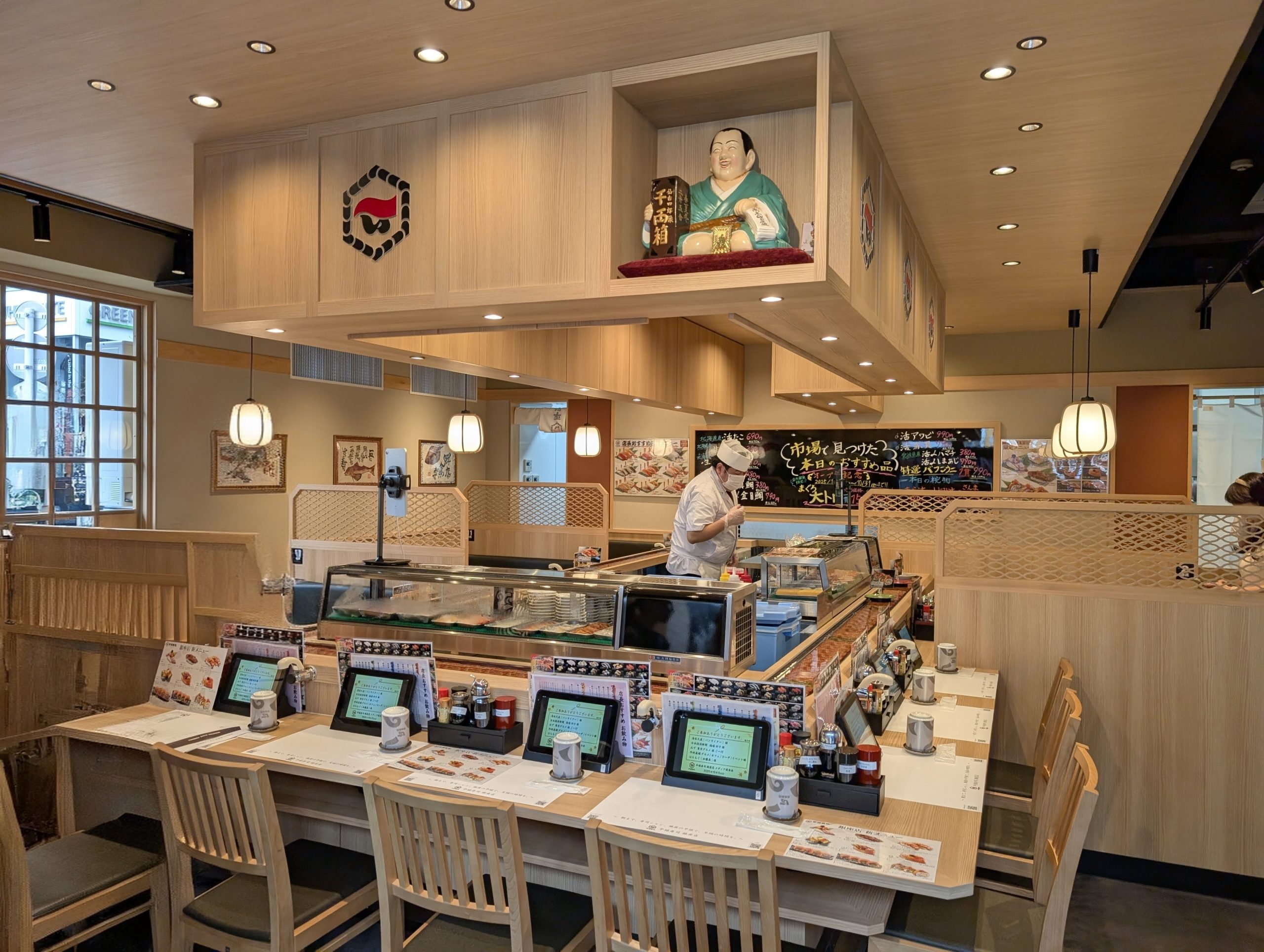 1階は、平禄寿司さんの伝統の回転寿司スタイルです。廻るコンベアベルトの中央で職人さんがお寿司を握ります。