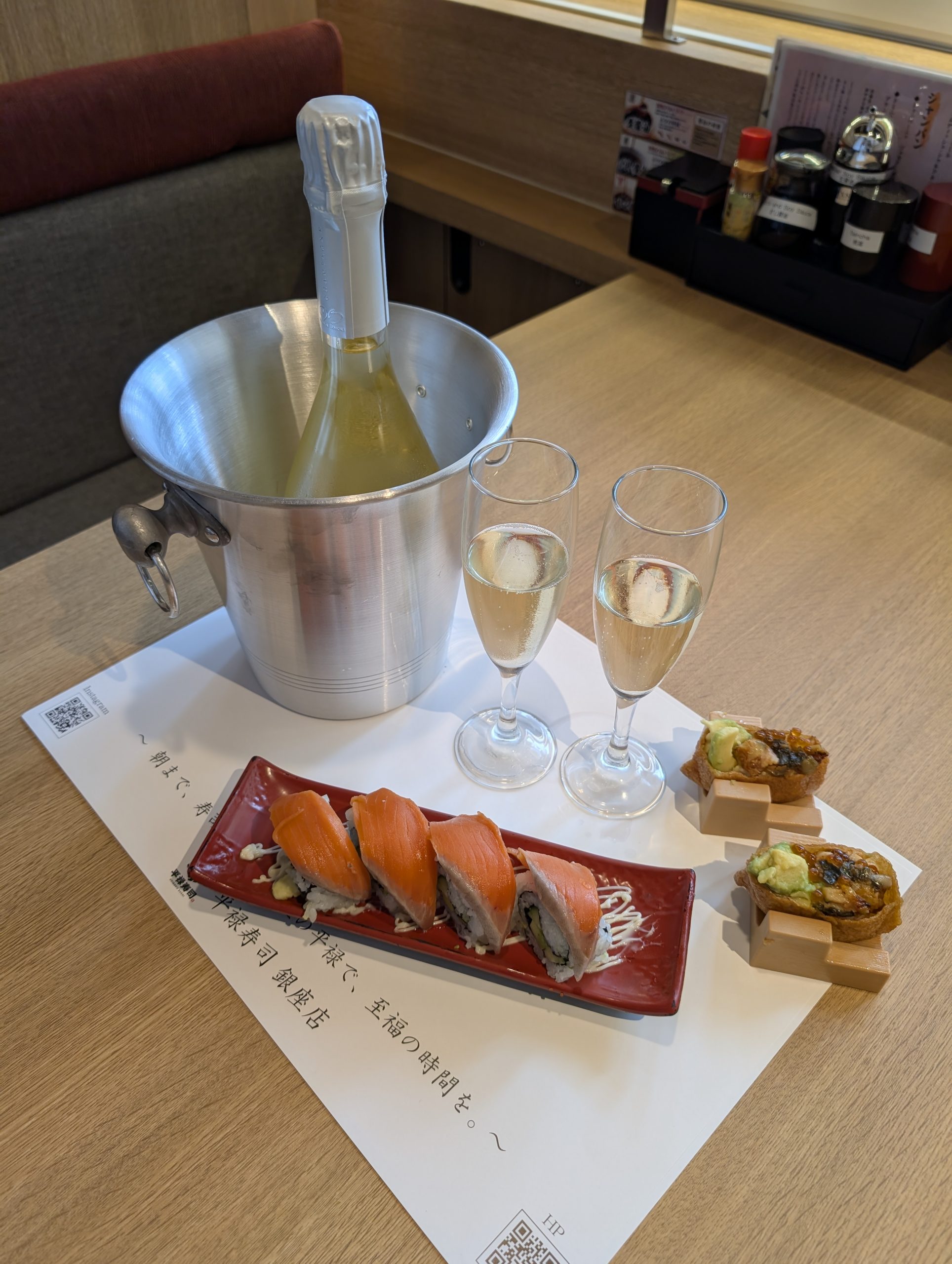 シャンパンもあり、ミシュラン1つ星のドミニク・ブシェ トーキョーのシャンパンを使用。翌朝5時まで営業の銀座店ならではの夜のお寿司の楽しみ方と言えそうです。このほか日本酒・焼酎など多数揃っています。