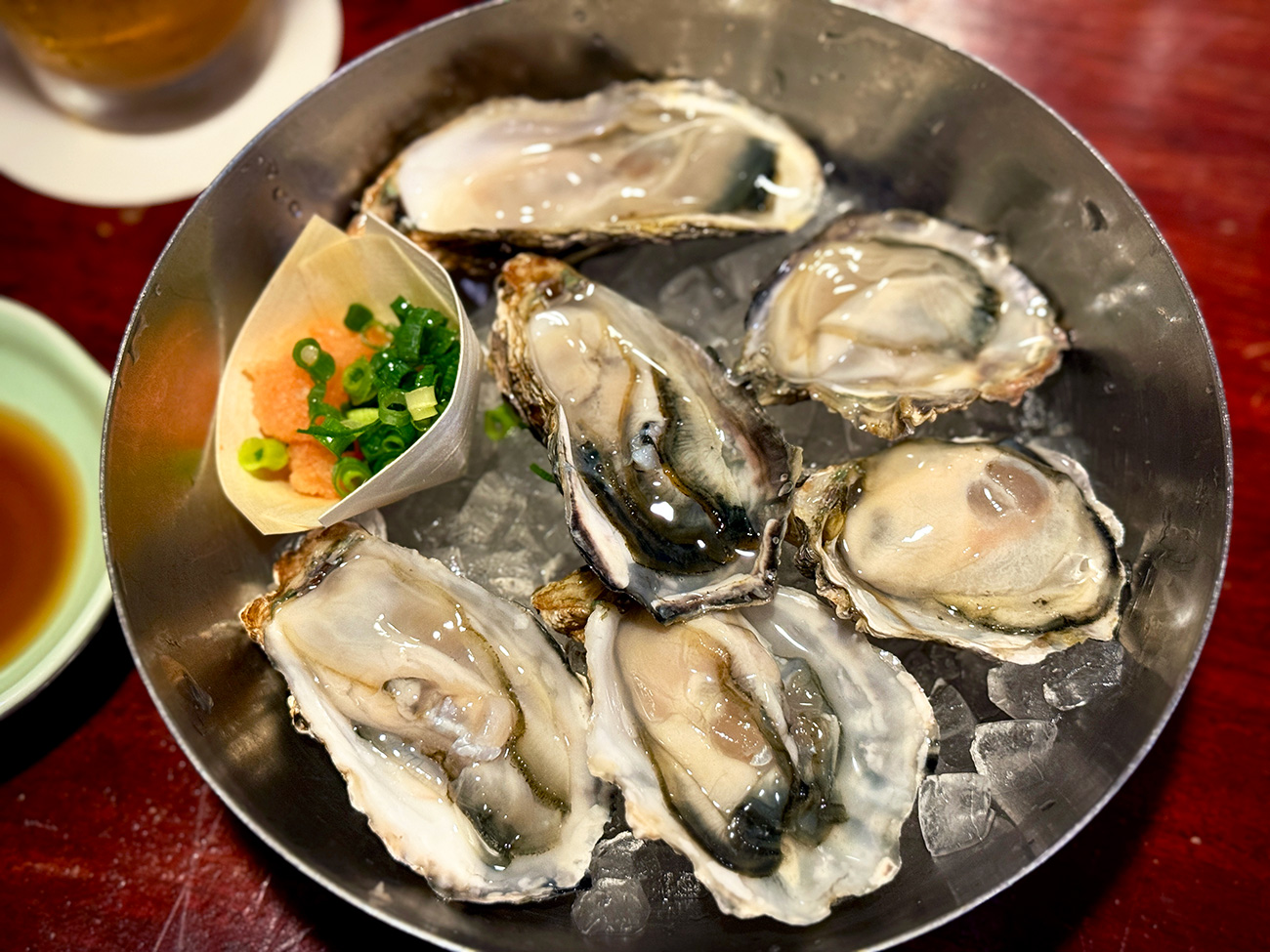 そして速やかに運ばれてきたのがこちらの生牡蠣。あれっ、思ってたよりデカいぞ! 小ぶりって聞いたけど、全然小さくないじゃん!