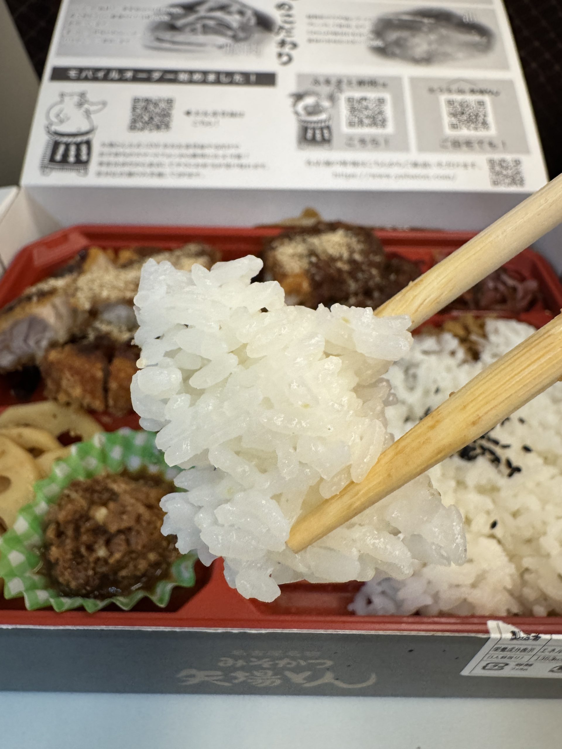 矢場とんのとんかつ、濃いめにみそだれやとんかつソースが染み込んでいるはずなのに、まっっっったく、しょっぱいとは感じない。むしろライスのおいしさを引き出す魅惑的なおかずとなる。