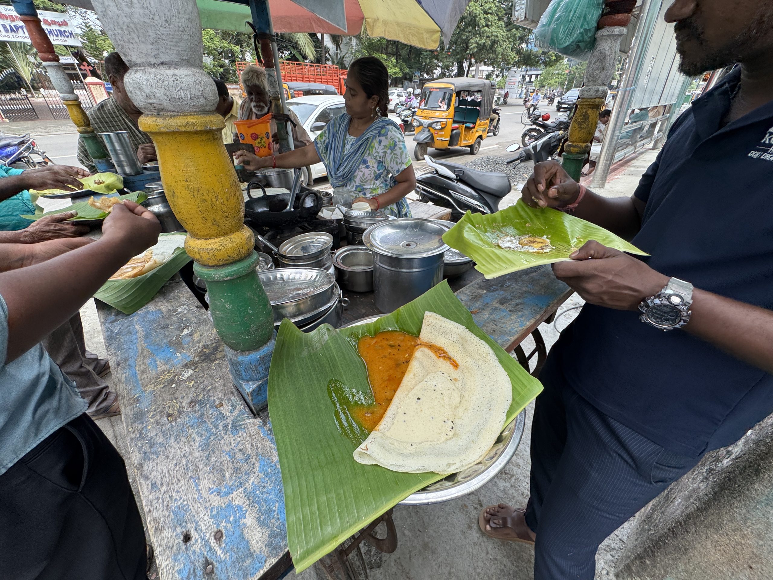 オーダーすると、姉さんがドーサを焼いてくれます。皿にドーサをのせてくれるので、あとはセルフサービスで作り置きのスープ(サンバル)をドーサにかけて食べます。