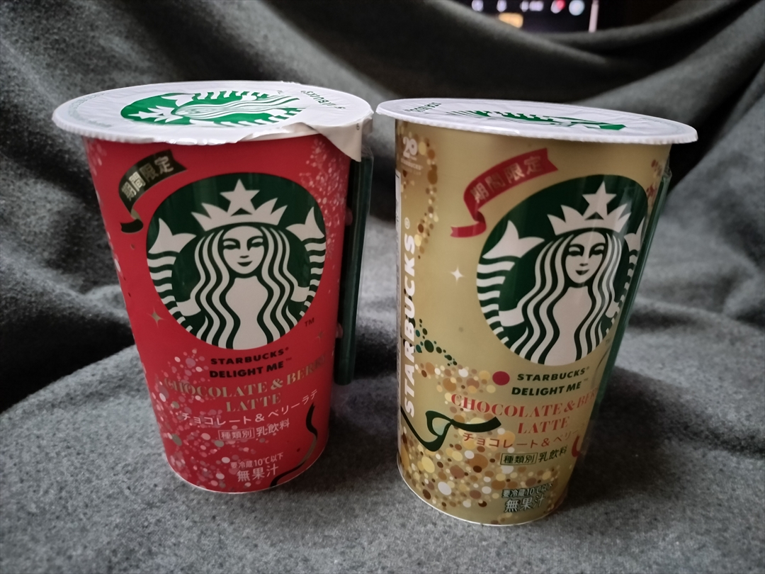スターバックス チルドカップ 「DELIGHT ME チョコレート&ベリーラテ」はチルド商品で、期間限定なので今しか手に入らない。本品は「レッド」に加え、「グリーン」「ゴールド」「レッド&グリーン」4種類のパッケージがあるが、中身はどれも同じだ。よって好みに合わせて選べばOKで4種類飲まなければ!という心配はない。