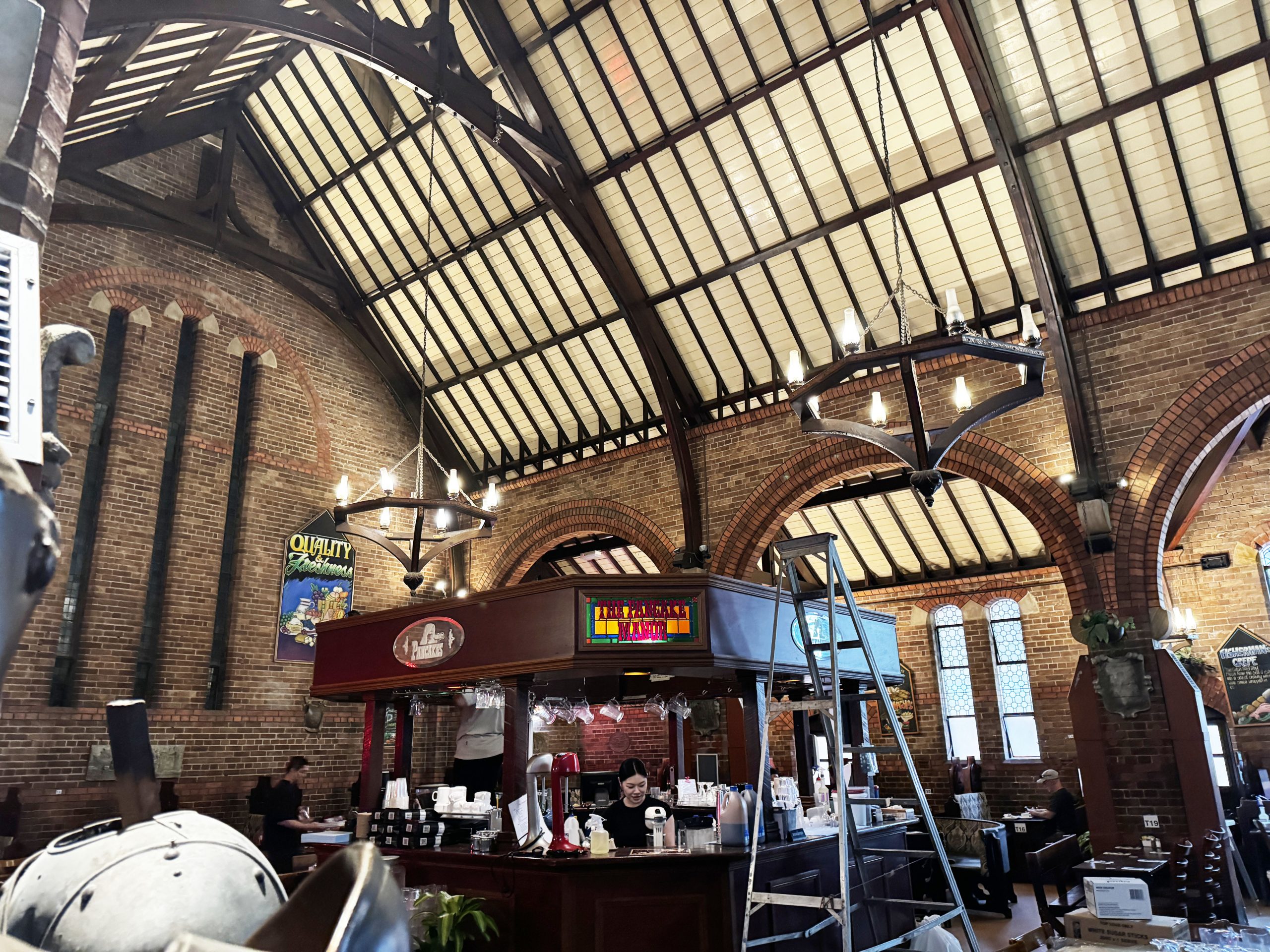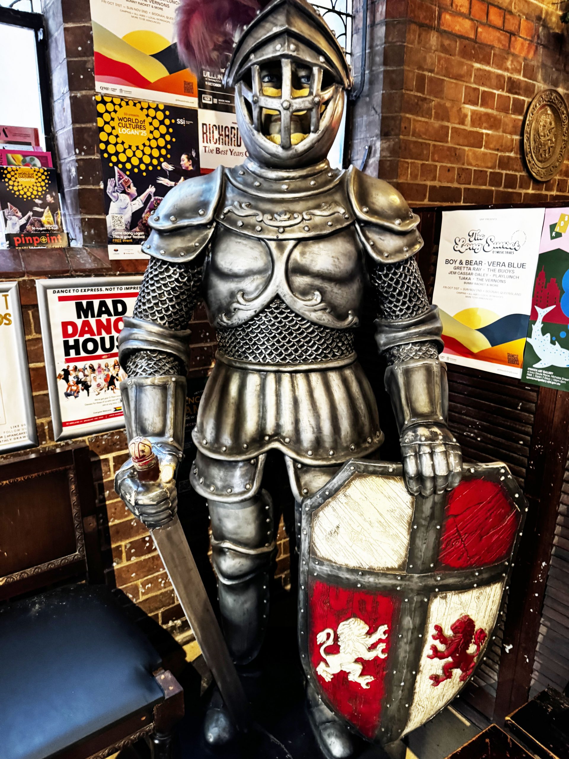 店内に入ると、出迎えてくれたのは鎧を着用した騎士。キングスナイト? 十字軍? 特に歴史的な意味を持つ鎧ではないようですが、チェインメイルではなく鋼板のような材質なので、1400~1500年代の鎧のレプリカと思われます。