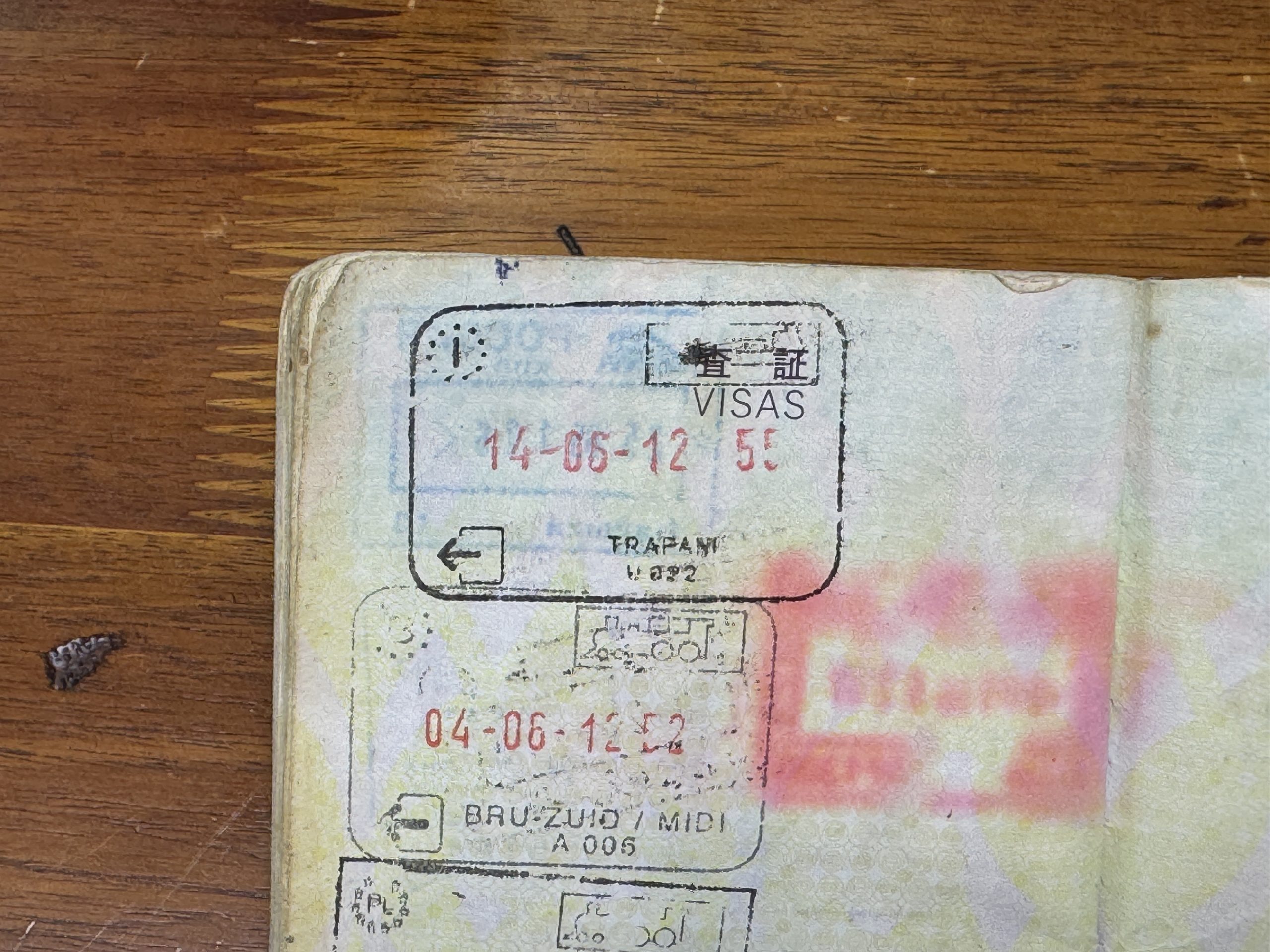 イタリアのトラパニから船で出国したのですが、その際、船がデザインされたスタンプが押されました。飛行機と鉄道が多いなかでの船、エモいです。
