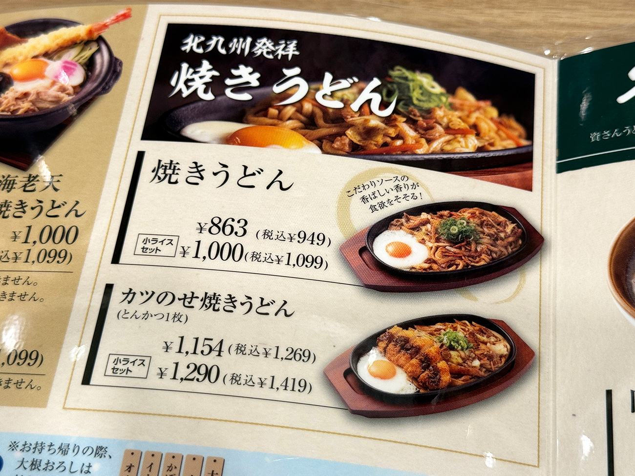 「焼きうどん」も北九州発祥で、資さんうどんの名物のひとつ。それは知っていました。でも、貴重な訪問機会でメニューからひとつだけ選ぶとしたら、やっぱりなかなか焼きうどんは選べない! だってあの黄金色のダシが飲みたいもの……!