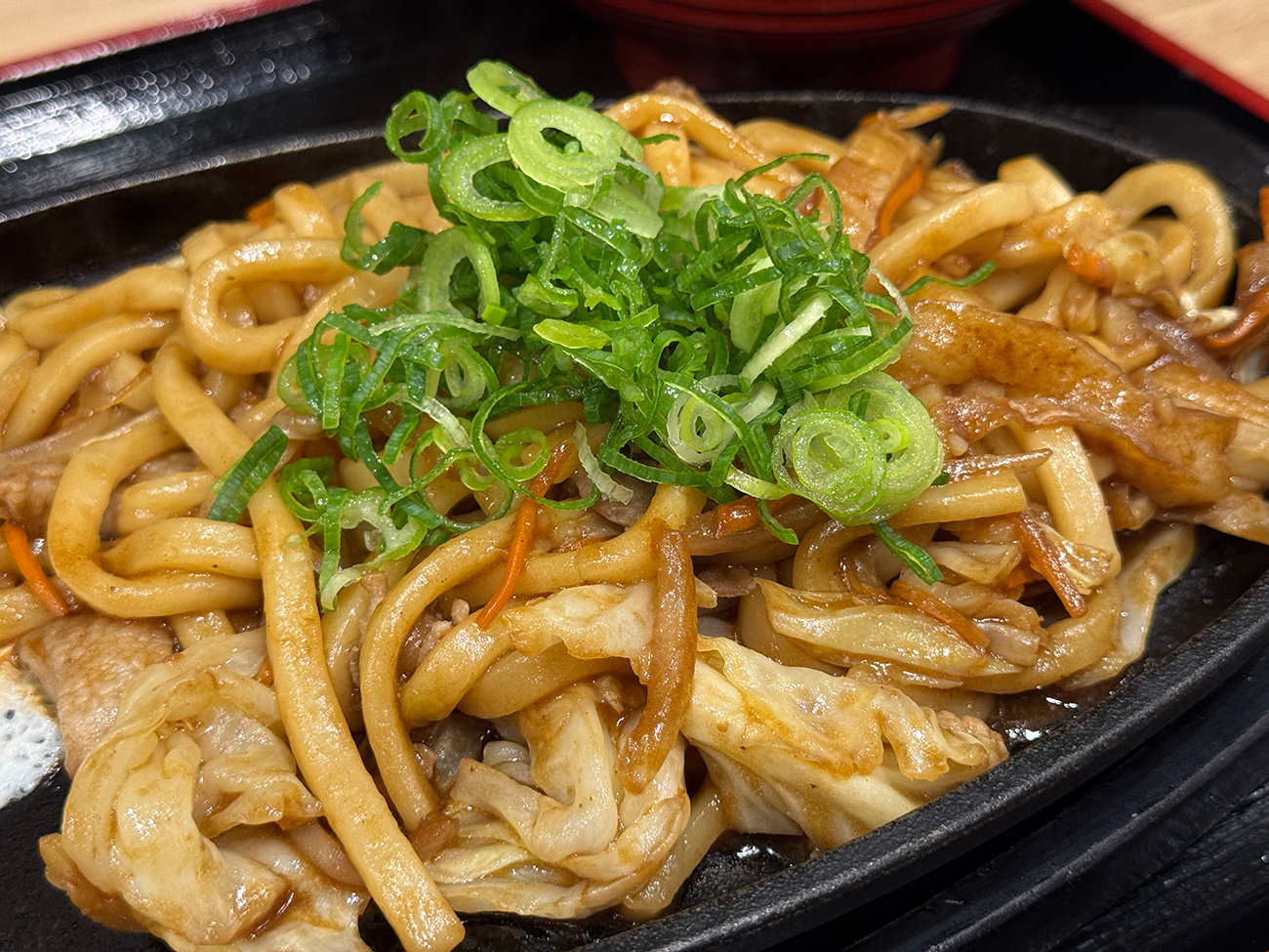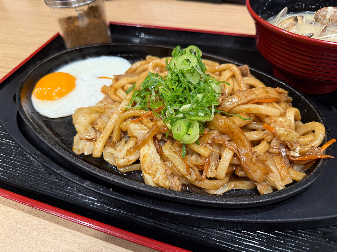 使われている麺はおそらくいつものうどんと同じ。見るからにもっちりとした極太麺で、キャベツ、にんじん、たまねぎ、豚肉といった王道の具材と一緒にソースで炒められています。ジュージューと音を立てる鉄板から漂う香りがいい感じ! あと、鉄板の上には目玉焼きも!