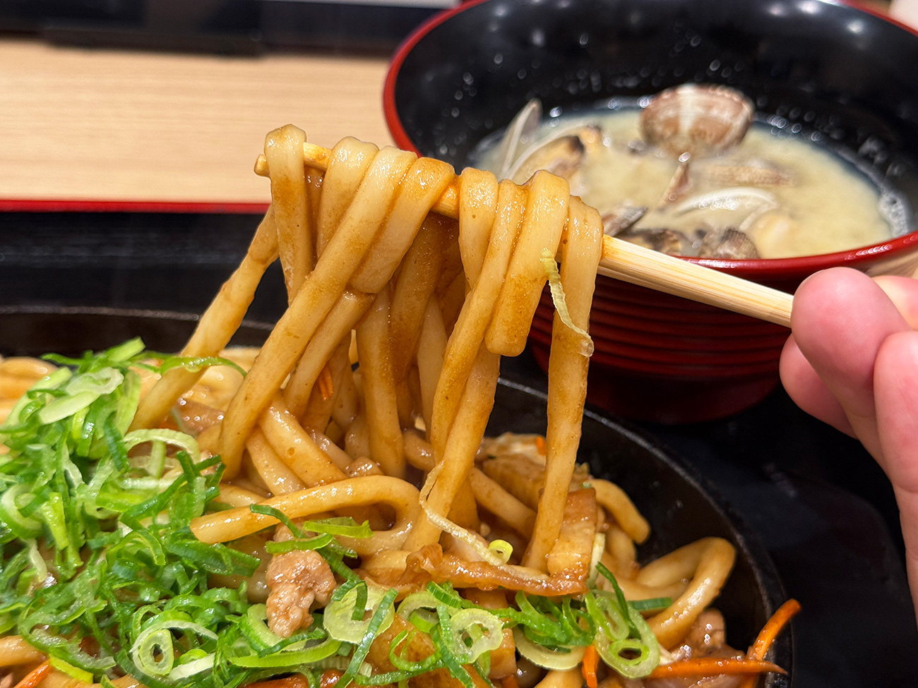 ちょっぴりスパイシーでフルーティーなソースの味を麺がしっかりと受け止め、そこに炒めた香ばしさや野菜と豚肉の旨味がプラス。「肉ごぼ天うどん」とはまったく違うアプローチで、全然違うタイプの美味しさを表現しているのです。