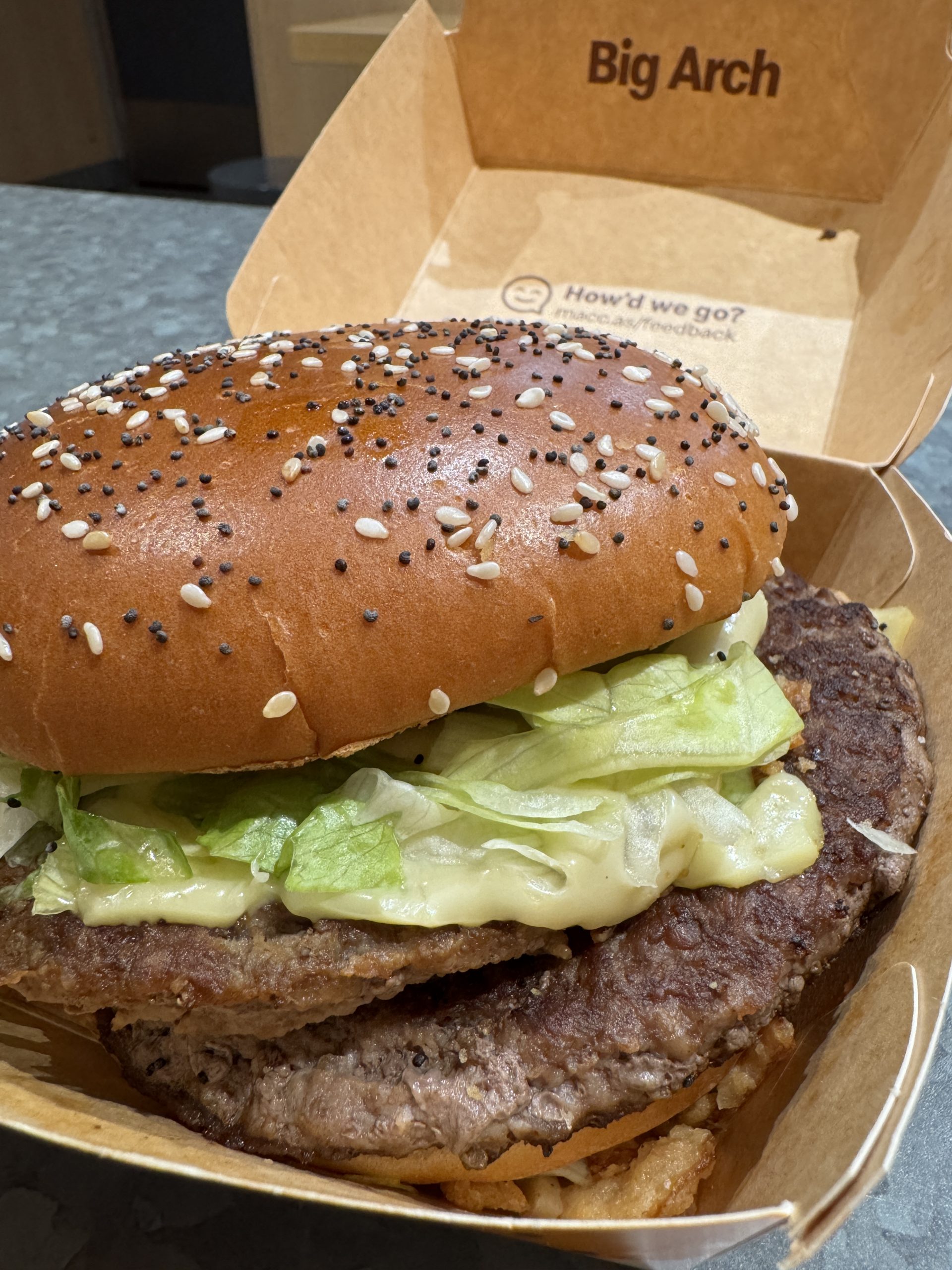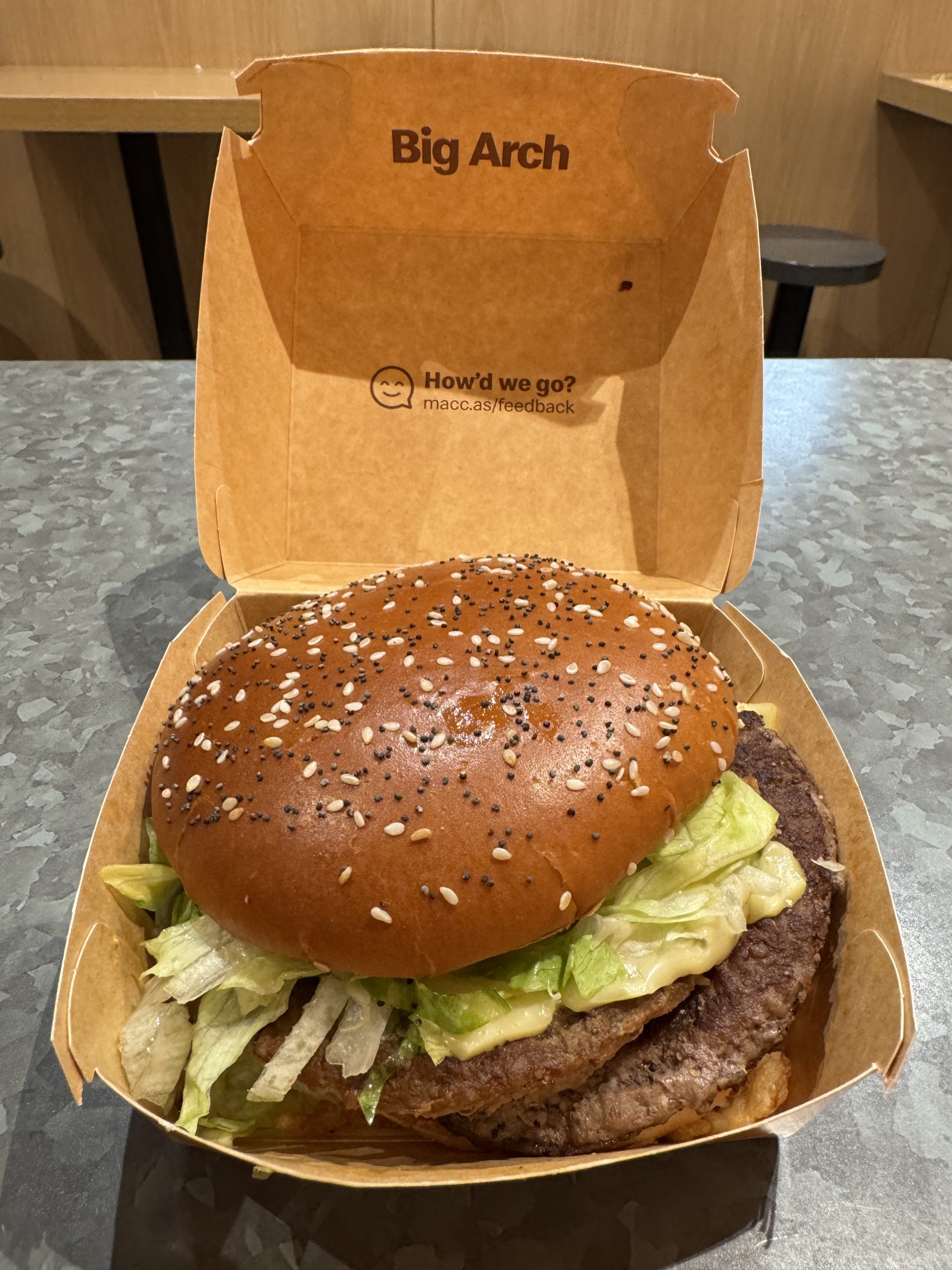マクドナルドはビッグマックよりもボリューミーなハンバーガー「ビッグアーチ」(Big Arch)を試験販売しています。2024年、カナダやポルトガルで販売されていましたが、2025年からオーストラリアでも販売が開始されました。