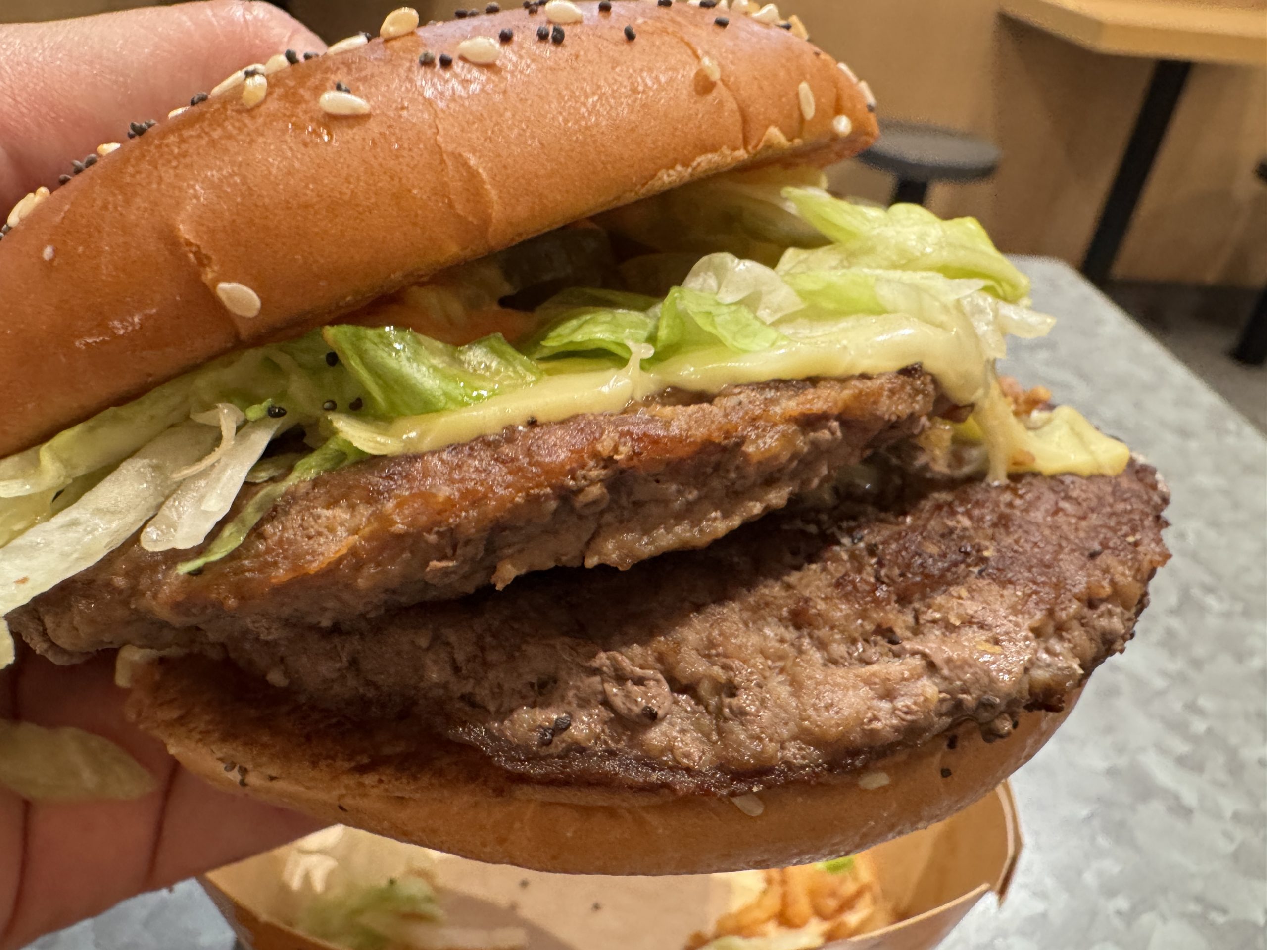むっちゃデカい。あまりにもデカすぎて、バンズからパティがはみ出しています。