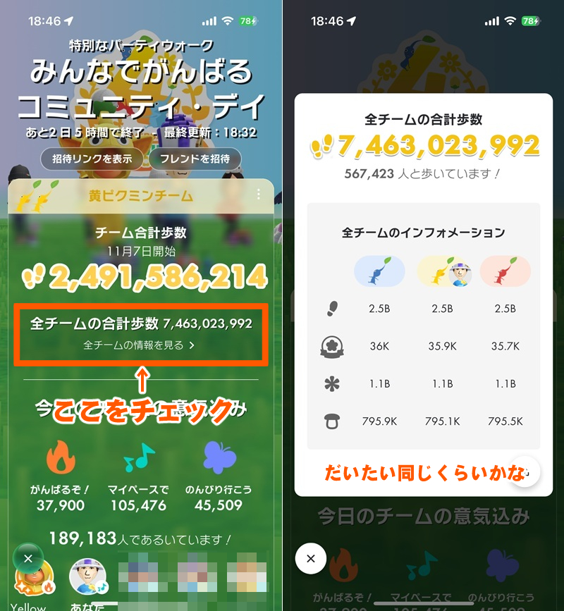 さらにこの4周年記念パーティウォークは大まかにだけど全チームの進捗も確認できる。