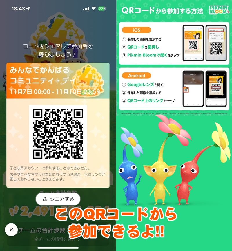 赤青黄ピクミン、ランダムで決まる3つのチームに分かれて全国のプレイヤーが歩数や花植えの本数などを競う今回初の試みだ。