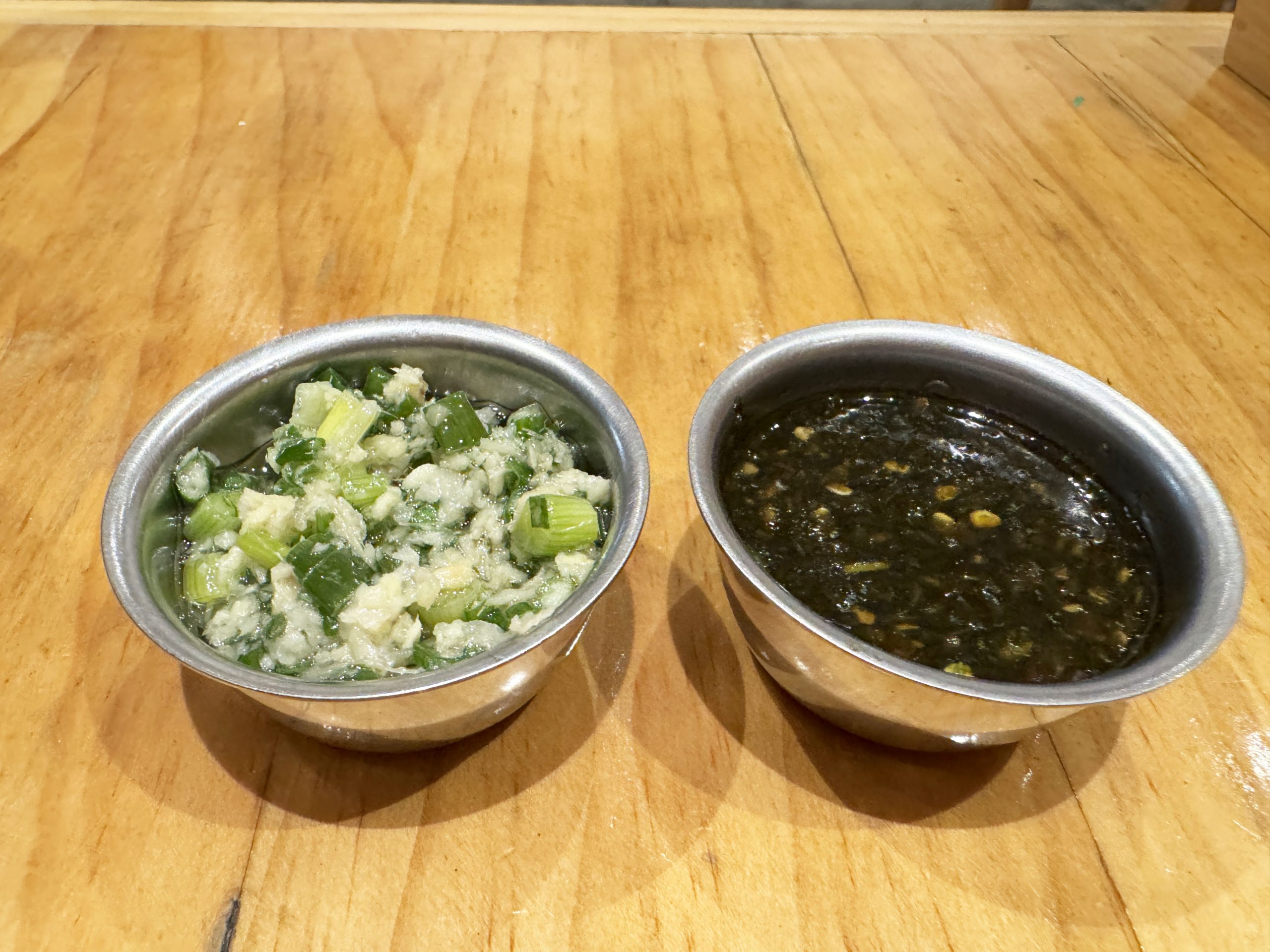 普通のカオマンガイならこの状態で完成形といえますが、このカオマンガイに、店員さんがスープをかけてくれます。スープをかけてこそ完成形となるのです。たっぷりとスープをかけて、あとはお好みで薬味ダレをかけて出来上がり。