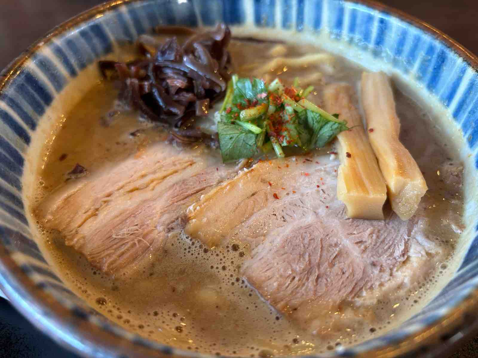 濃厚な動物系が煮干しのエグみやクセをマスキングし、旨味だけが現れる。豚骨だけではなく鶏白湯の濃厚さも出ているのがポイント高い。都内にあっても行列ができそうなクオリティ。
