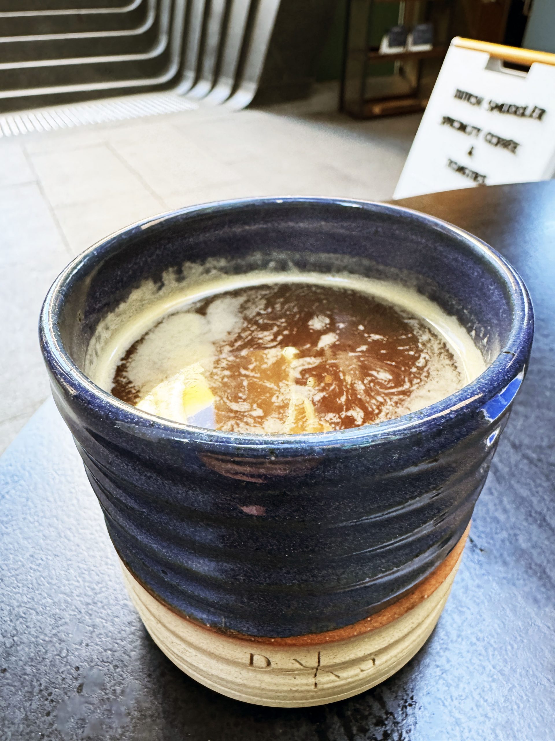 このカフェ、どうして人気なのか、食べれば理解できます。サンドイッチの食パンが絶妙な薄さなのです。そして表面がカリッとクリスピーに仕上げられています。そして焼き面が、イイ感じにオイリー。単に焼いただけではないと思われます。良き。