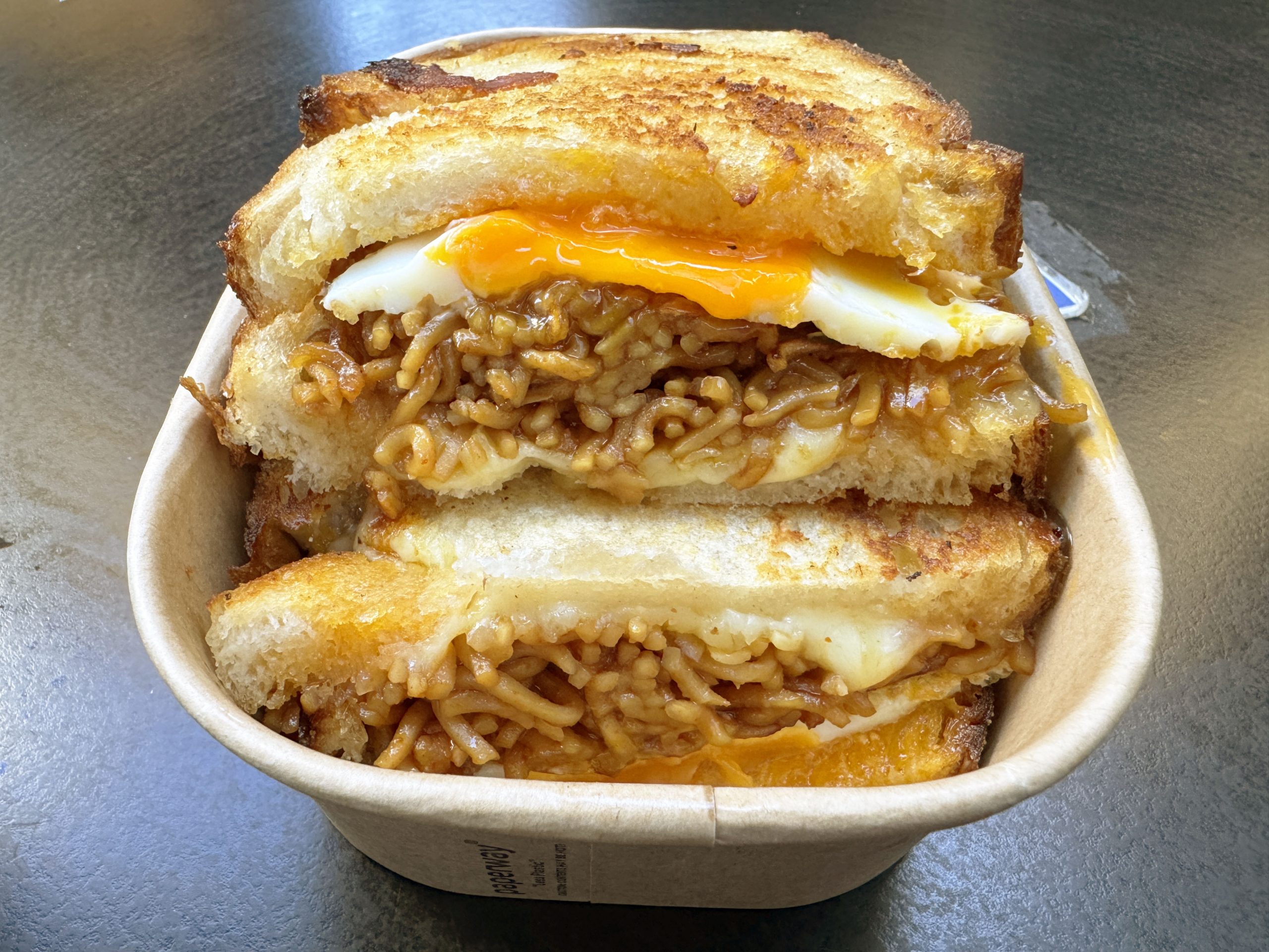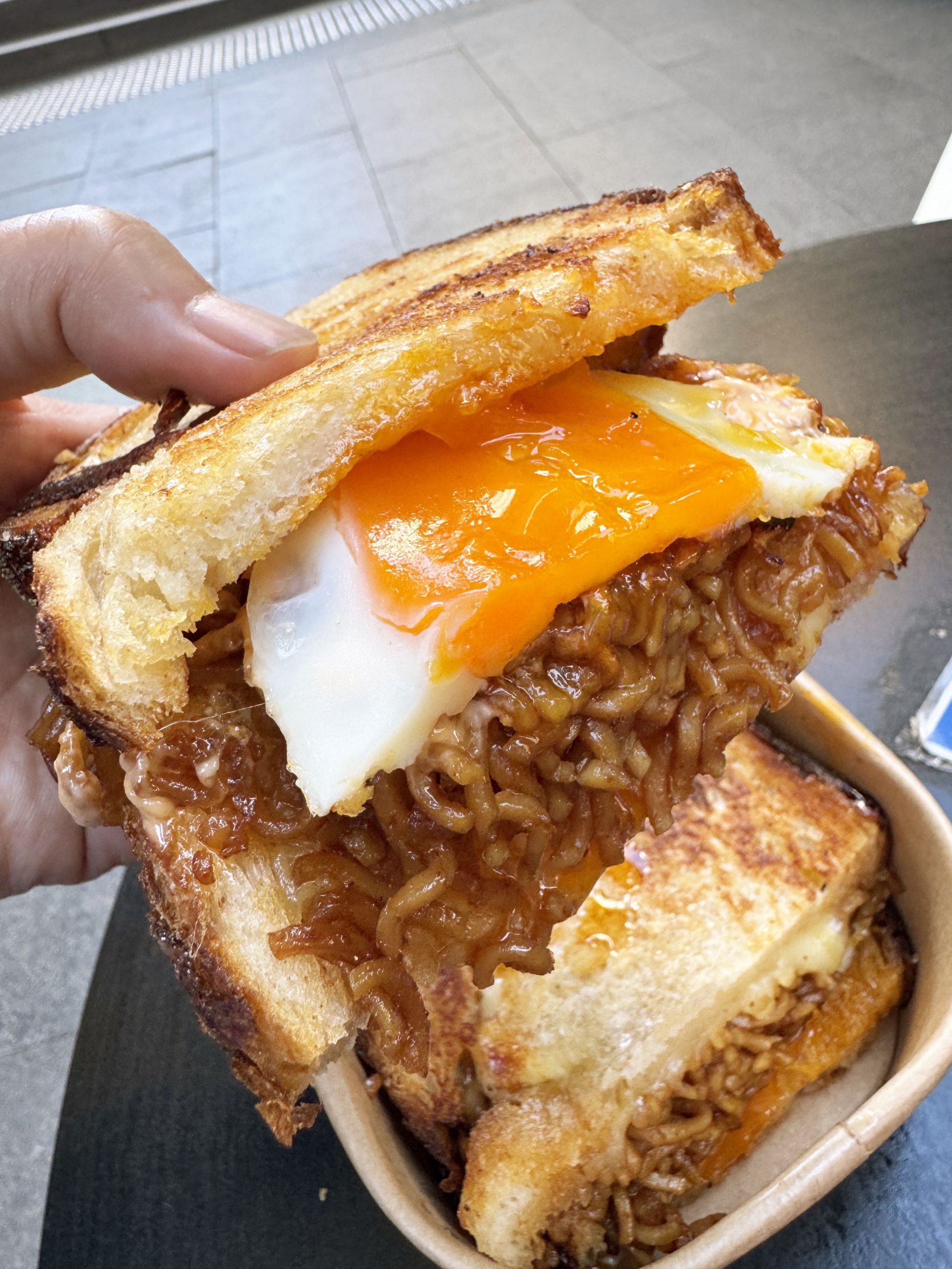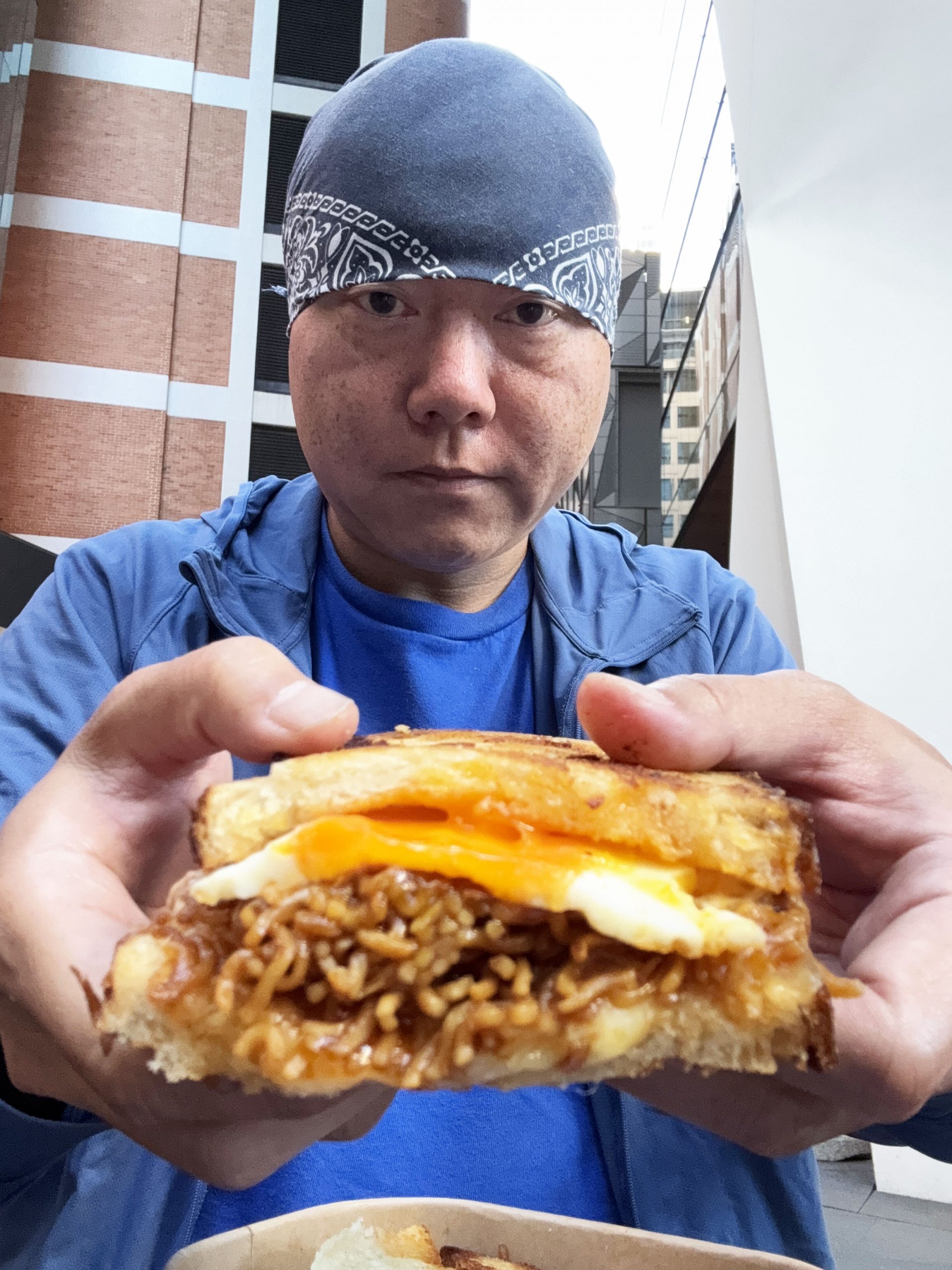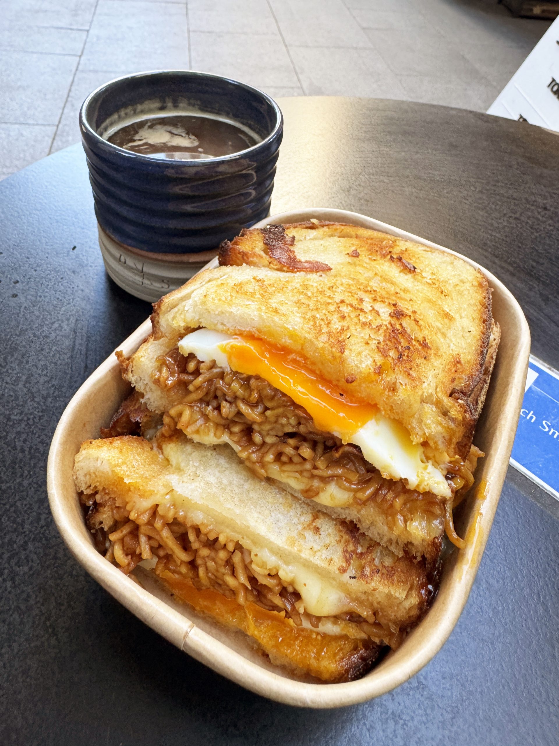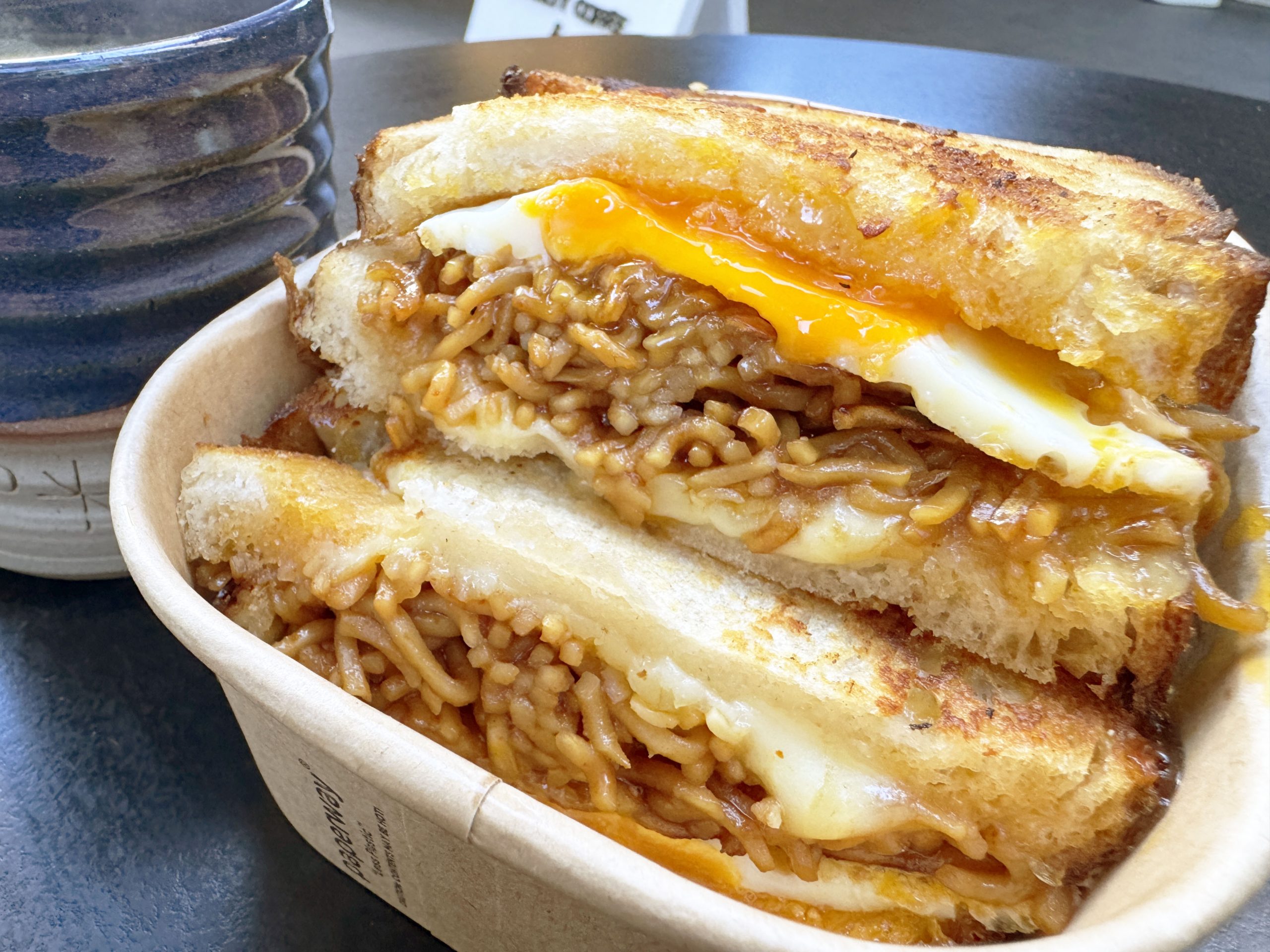 今回はミーゴレンサンドイッチと、オーストラリアで愛されているコーヒー・ロングブラックもオーダー。目の前にやってきたミーゴレンサンドイッチ、かなりボリューミー。ビジュも超絶パない仕上がりで、トロッと半熟に仕上げられた卵黄が甘美。