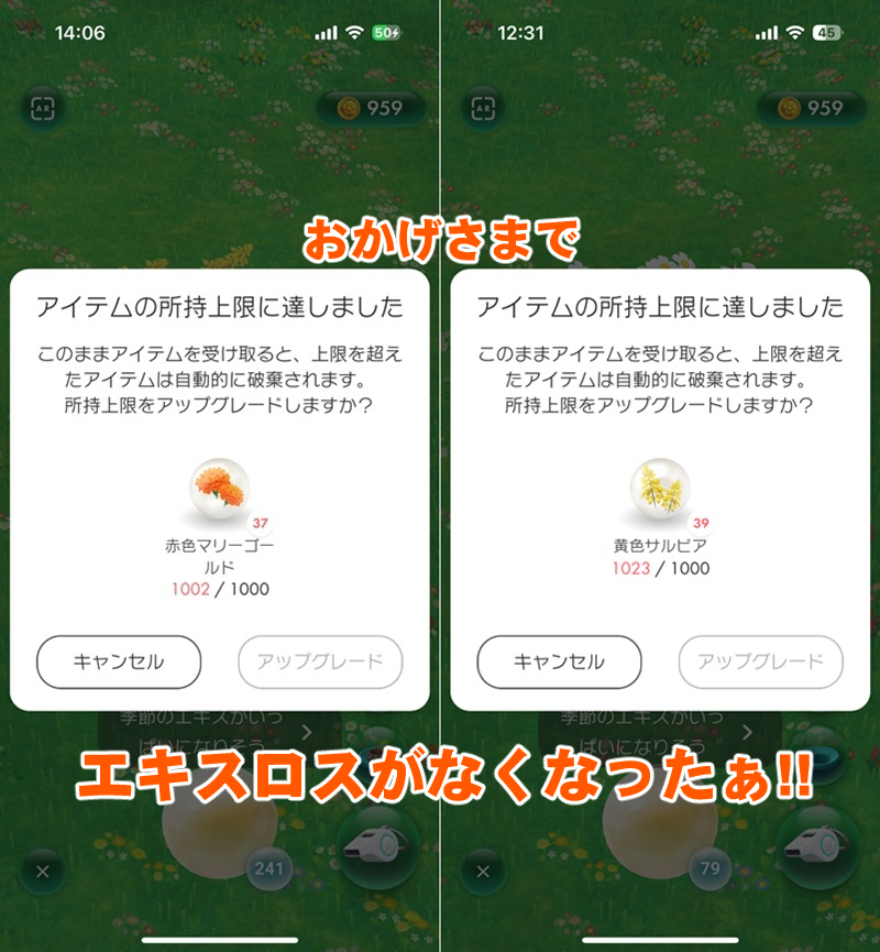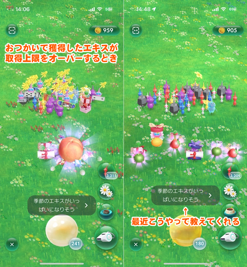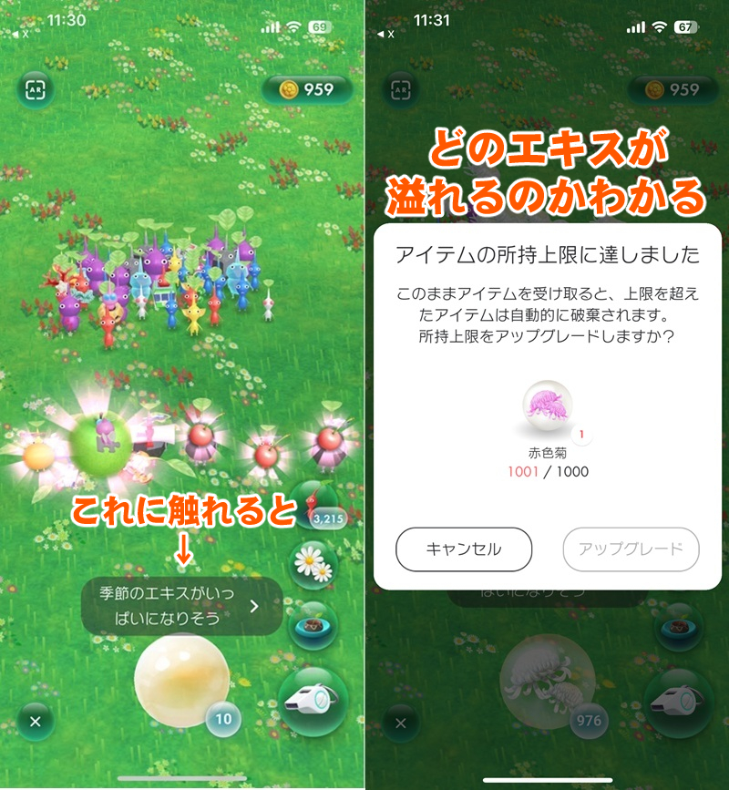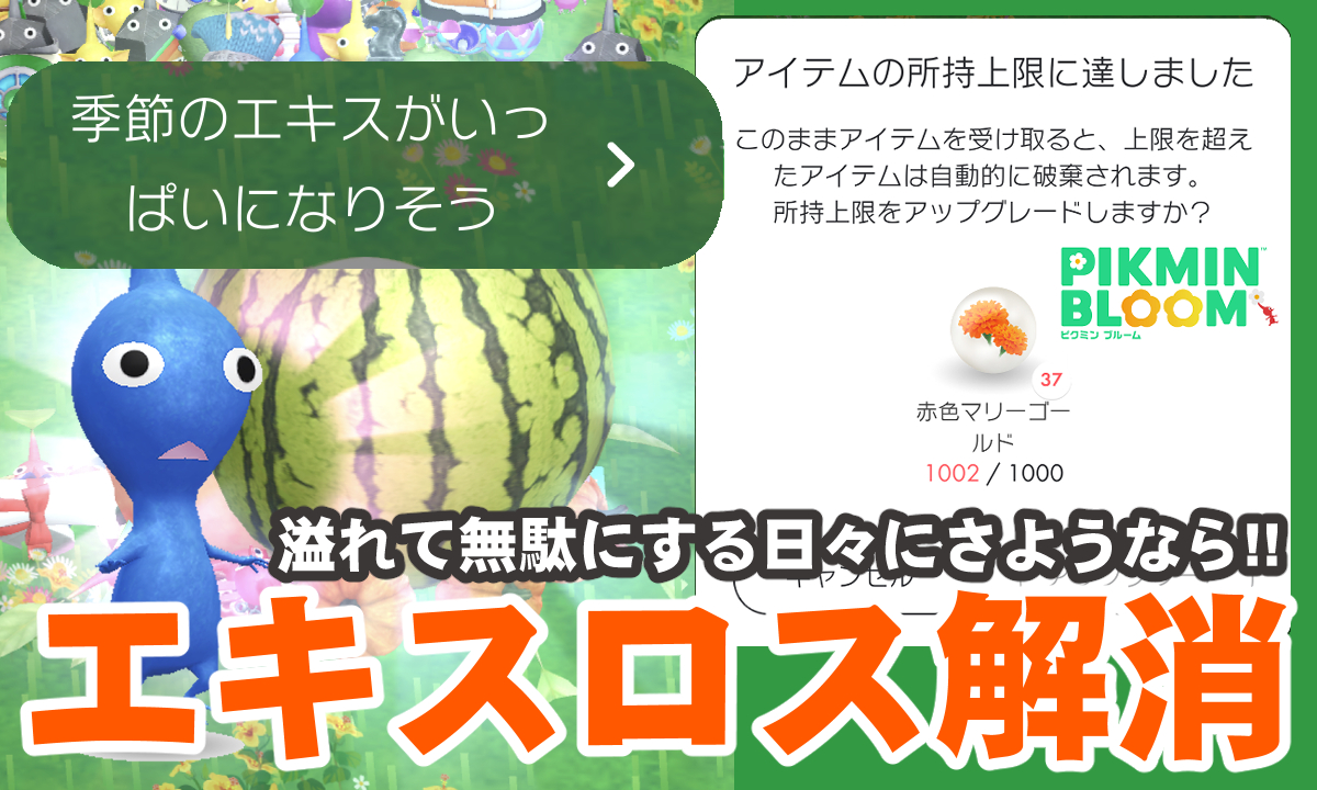 このお知らせが便利だと思うポイントは、吹き出しに触れるとどのエキスが溢れてしまうのかわかる点だ。